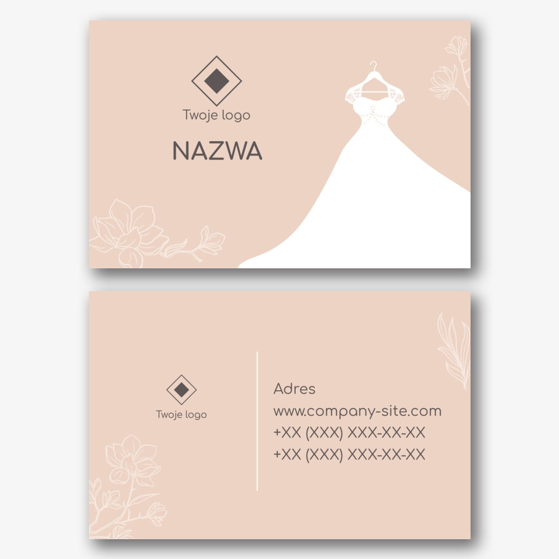 Darmowy szablon wizytówek do salonu ślubnego, salonu sukien ślubnych, wypożyczalni sukien ślubnych. Utwórz układ DIY w kreatorze wizytówek.