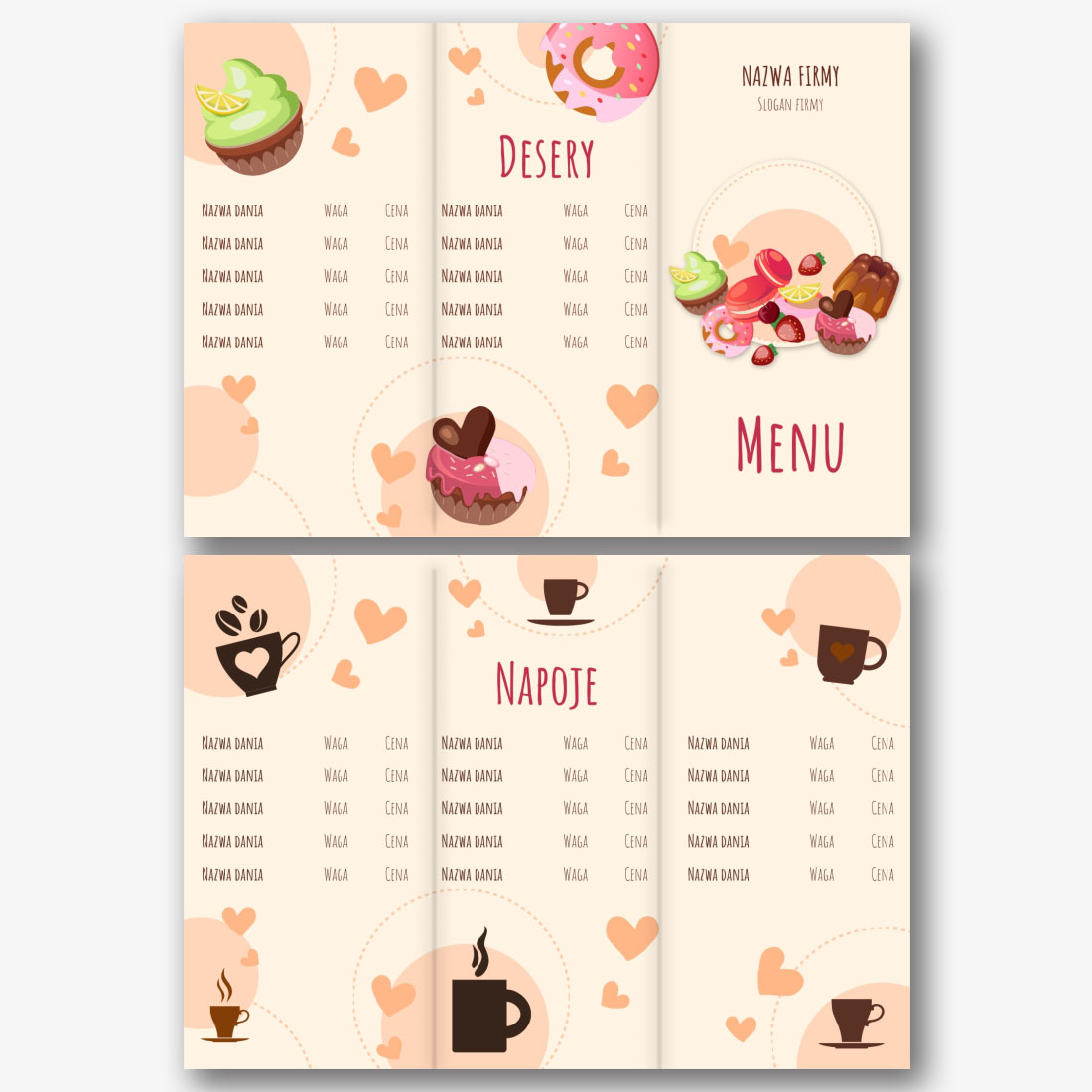 Darmowy szablon menu dla kawiarni cukierniczej, restauracji, kawiarni. Utwórz układ DIY w kreatorze menu online.