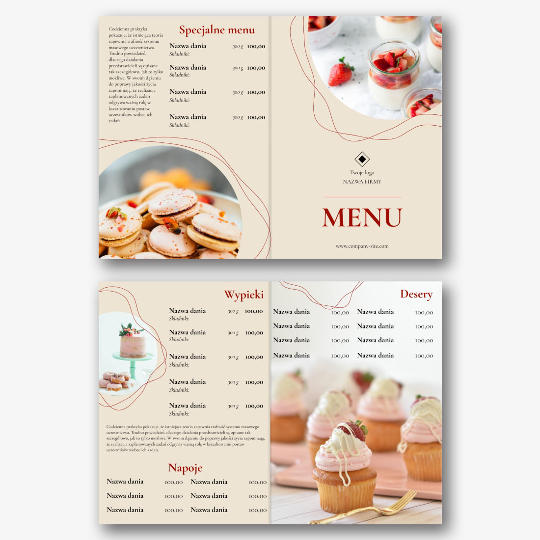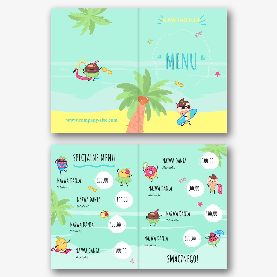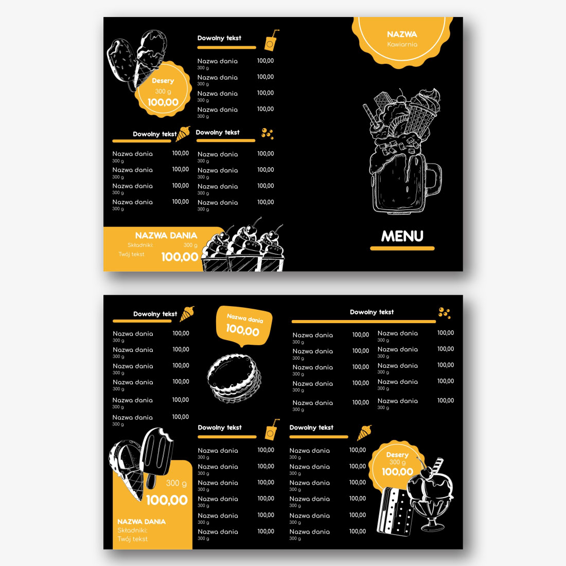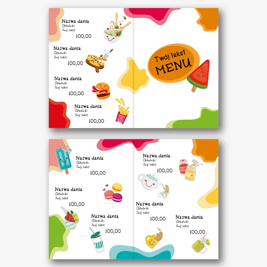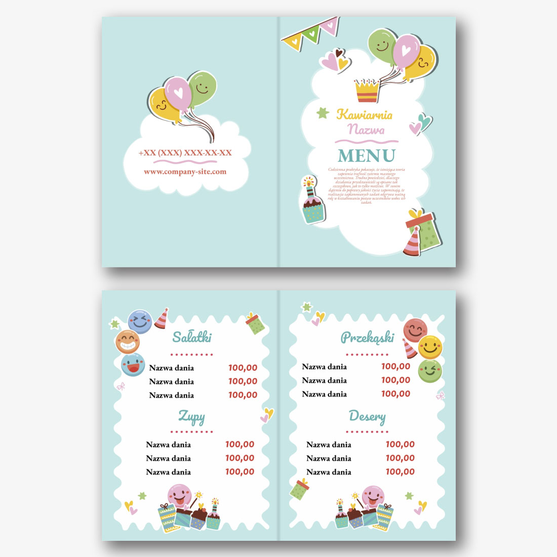 Darmowy szablon menu dla kawiarni, restauracji, kawiarni dla dzieci. Utwórz układ DIY w kreatorze menu online.