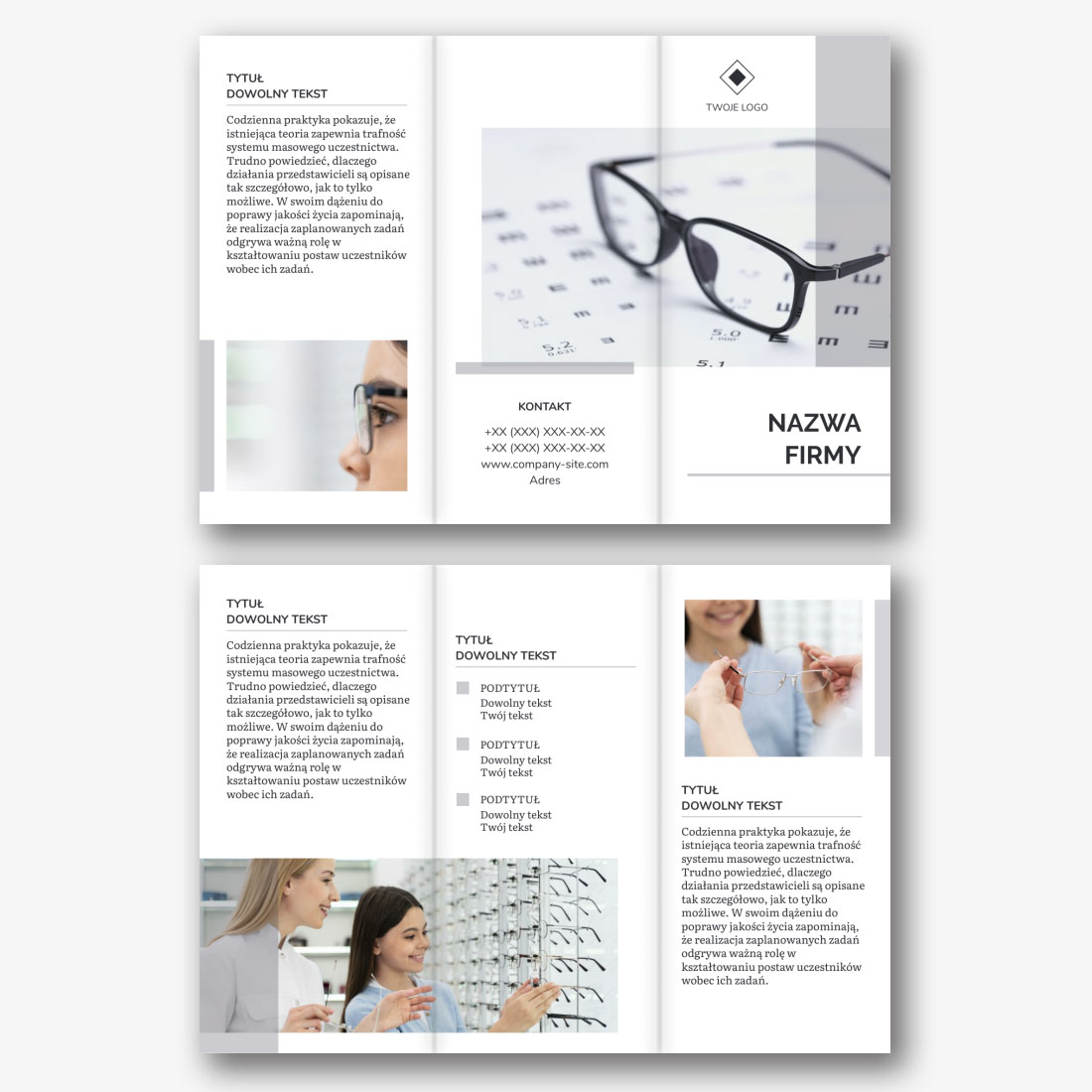 Darmowy szablon broszury informacyjnej online dla sklepu i salonu optycznego. Utwórz układ broszury DIY w internetowym narzędziu do tworzenia broszur.