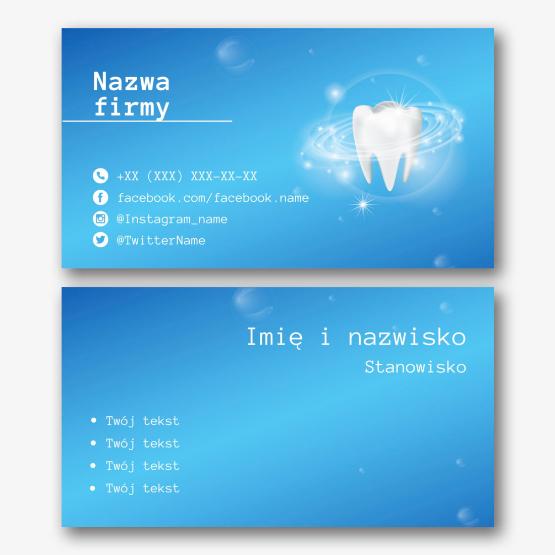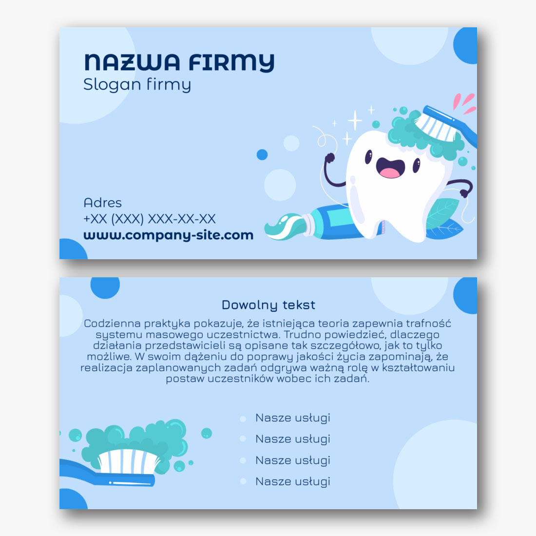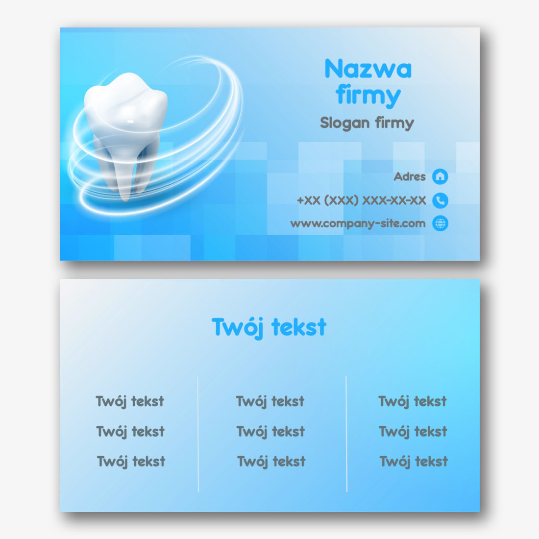Darmowy szablon klasycznej wizytówki dla dentysty, ortodonty to surowy, nowoczesny design, wykorzystujący biało-turkusową paletę kolorów. Może to być świetny wybór dla tych, którzy chcą zrobić dobre wrażenie na swoich pacjentach. Niebieskawo-zielone elementy na białym tle tworzą uczucie świeżości i czystości, co może odzwierciedlać profesjonalizm i dbałość o zdrowie pacjentów. Ogólnie rzecz biorąc, ten szablon wizytówki jest atrakcyjny i pouczający sposób, aby zaprezentować swoją klinikę lub usługi dentystyczne i przyciągnąć nowych pacjentów.