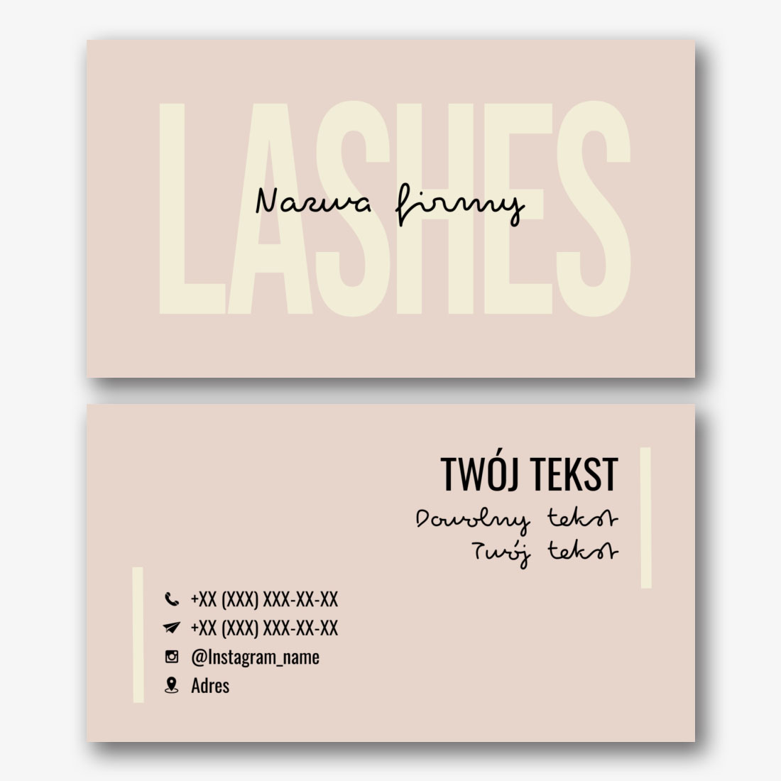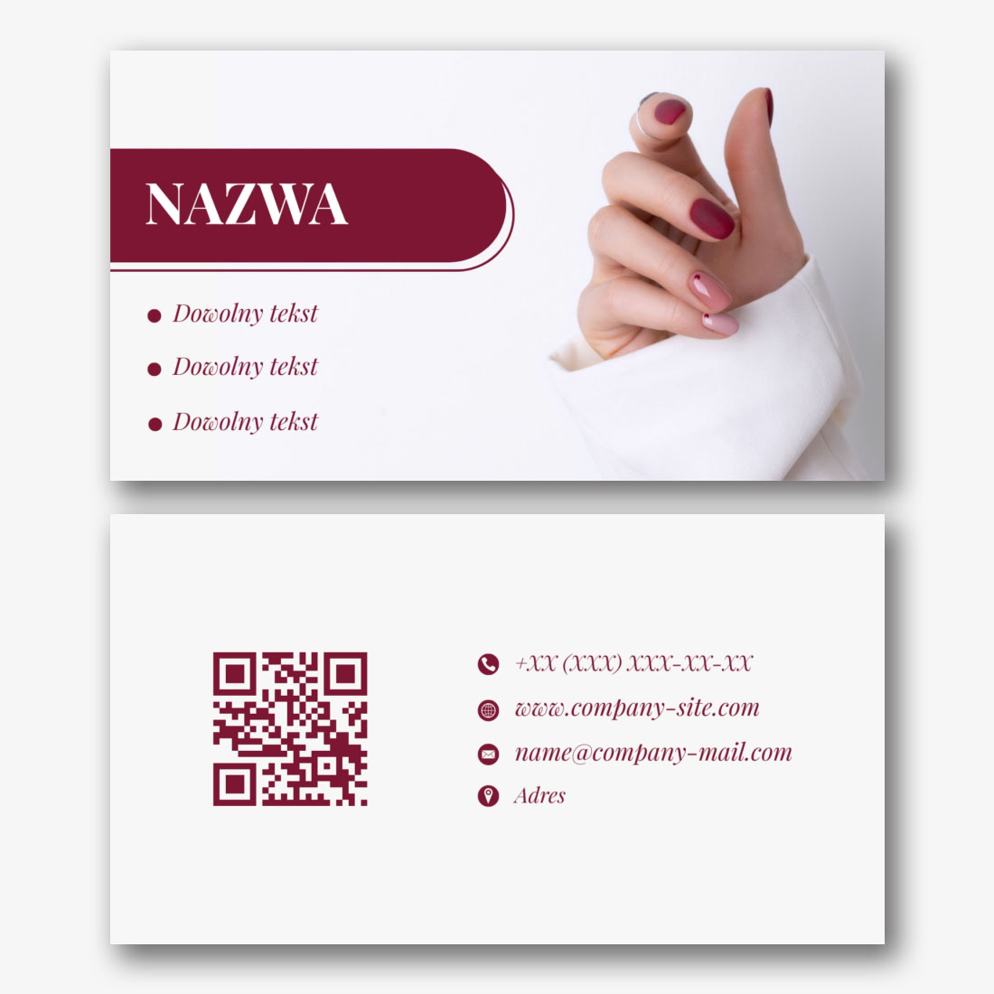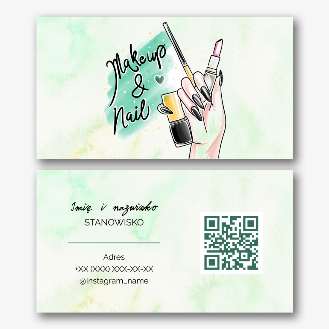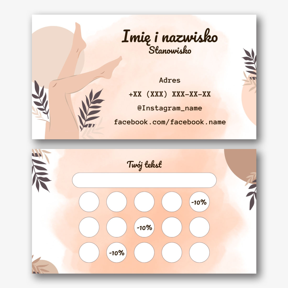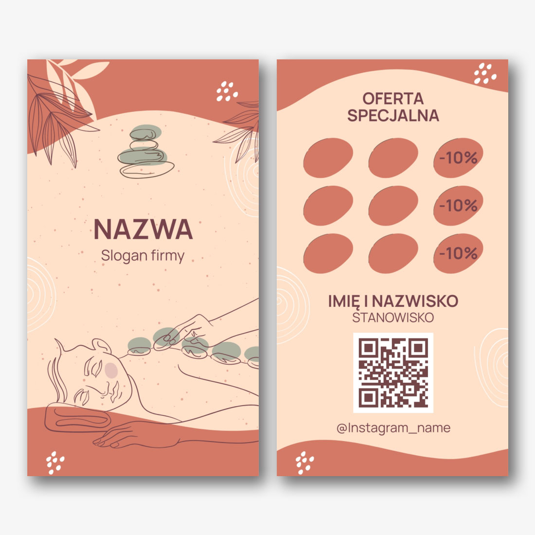 Szablon wizytówki masażysty, manikiurzystki, studia kosmetyczne to uniwersalny projekt, który nadaje się do różnych zawodów w dziedzinie zdrowia i urody. Zawiera minimalistyczny design, ładne kolory i zwięzłą czcionkę. Szablon wizytówki masażysty, manikiurzystki, studia urody można wykorzystać w kreatorze online. Aby to zrobić, wybierz odpowiedni projekt i dodaj swoje dane kontaktowe. Gotowa wizytówka będzie wyglądać profesjonalnie i atrakcyjnie, co pomoże przyciągnąć uwagę potencjalnych klientów. Korzystanie z szablonu wizytówki pomoże stworzyć jednolity i piękny styl projektowania materiałów reklamowych.