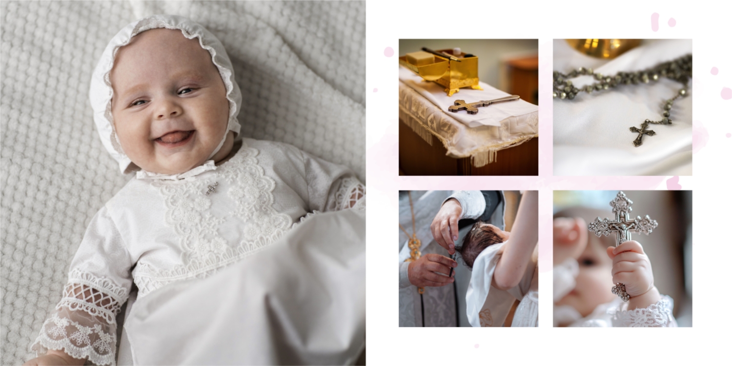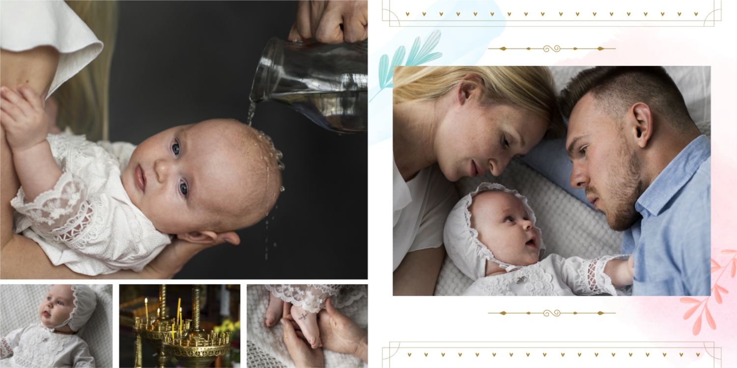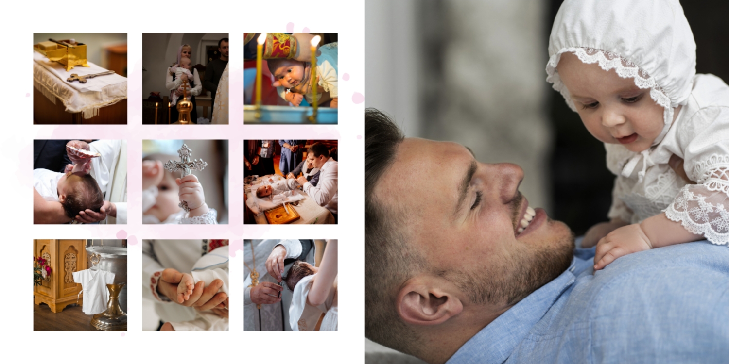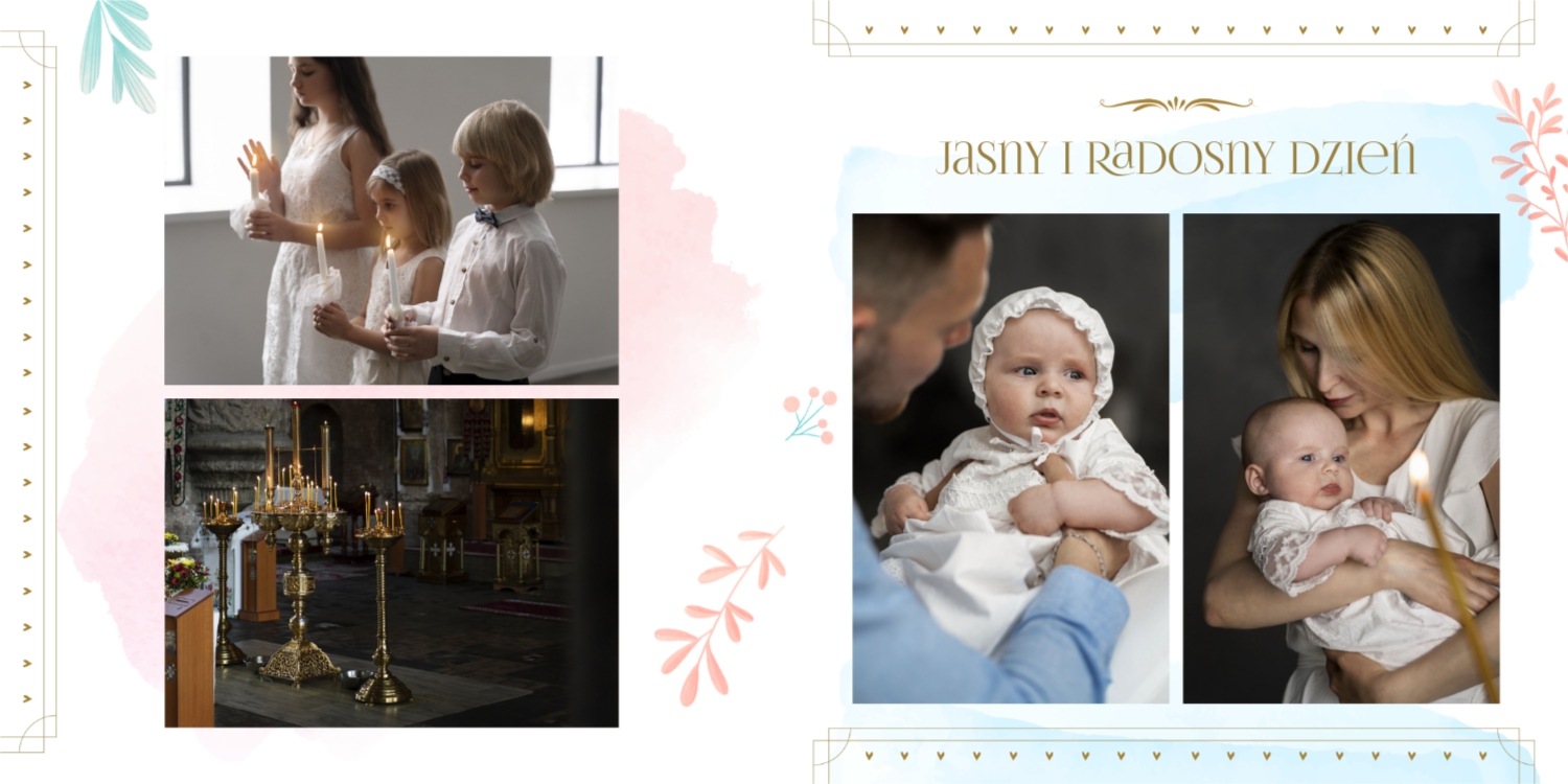 Darmowy szablon fotoksiążki ze wspomnieniami chrztu dziecka. Utwórz makietę DIY w internetowym kreatorze fotoksiążek.