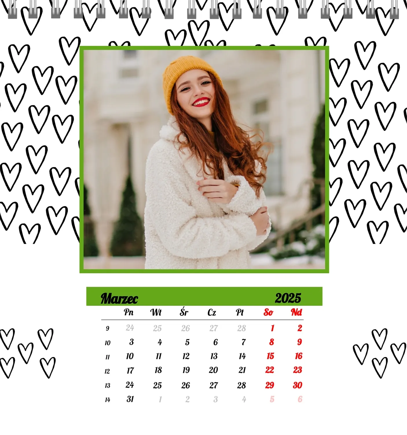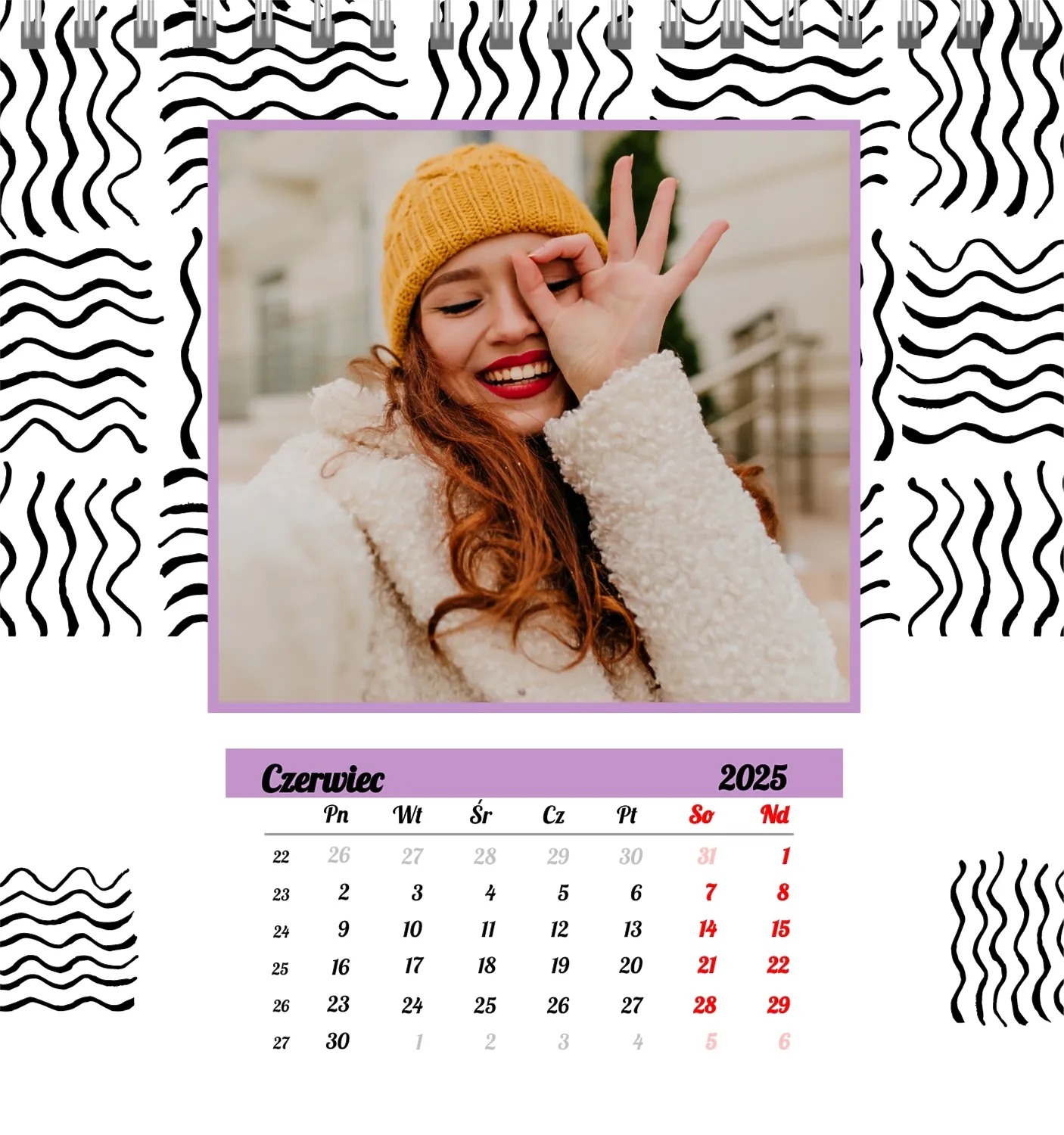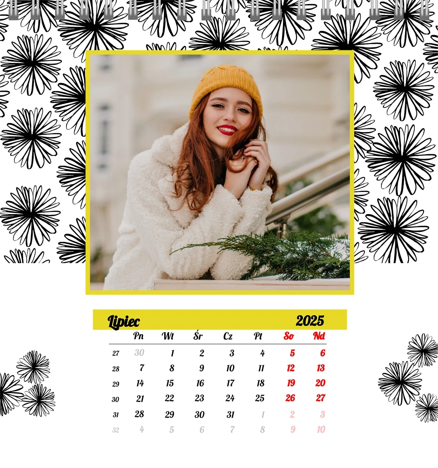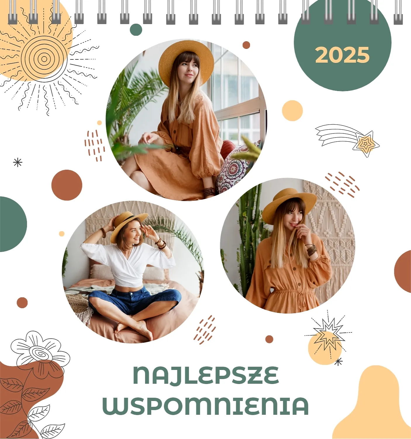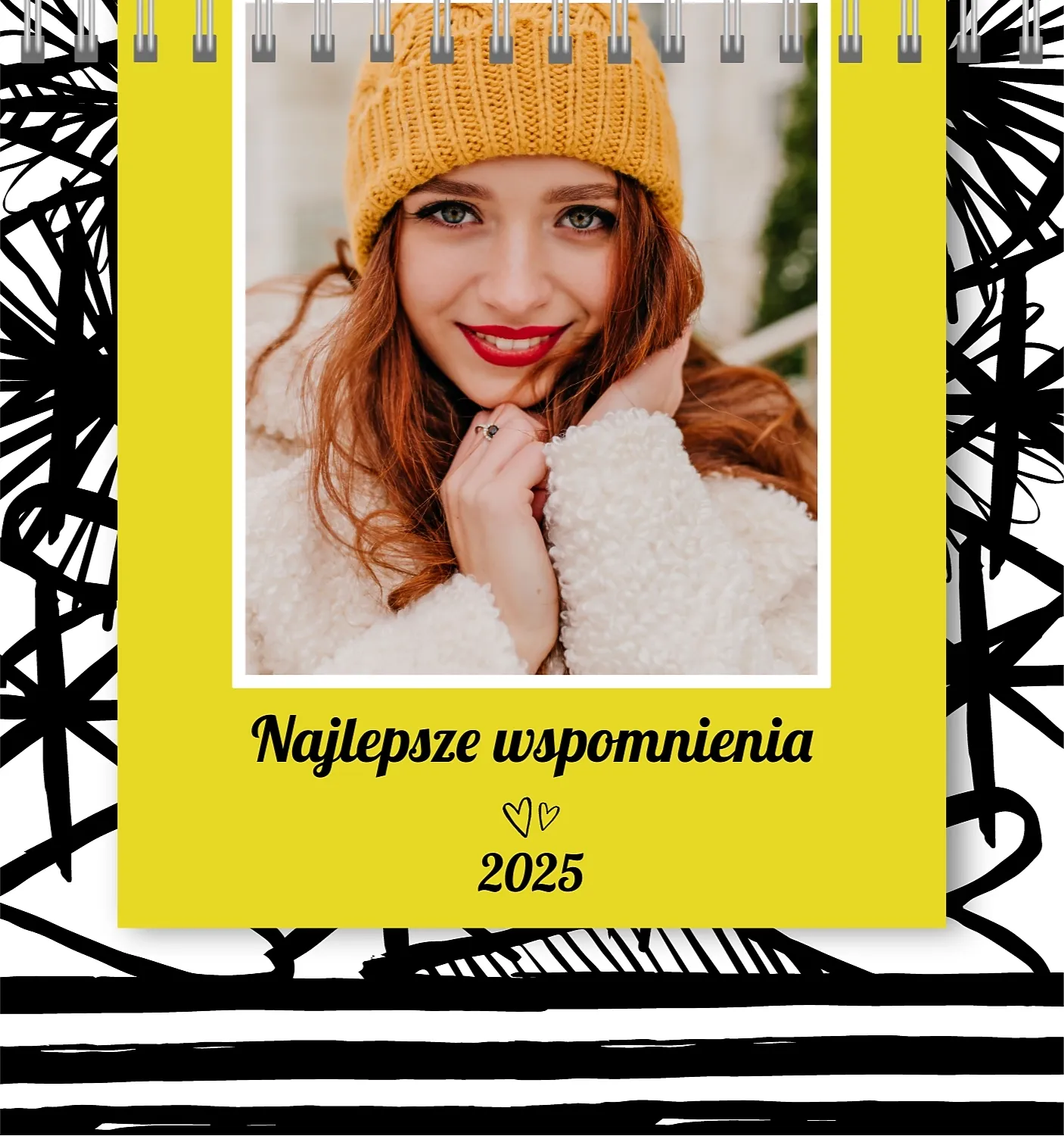 Ten urzekający szablon kalendarza pionowego "najlepsze wspomnienia" ma zainspirować Cię do stworzenia wyjątkowego i delikatnego kalendarza pełnego ciepłych chwil twojego życia. Dostępny dla Ciebie kreator online zapewnia niesamowite możliwości kreatywności. Będziesz mógł łatwo dostosować każdy szczegół, aby kalendarz był naprawdę twój. Szeroki wybór kolorów i czcionek w kreatorze pozwala podkreślić atmosferę każdego miesiąca. Wybierz odcienie, które wywołują w Tobie te same uczucia, które chcesz zachować w pamięci. Stworzenie unikalnego kalendarza biurkowego w kreatorze online to nie tylko proces, ale także możliwość ożywienia najlepszych wspomnień ze szczególną czułością i ciepłem. Niech ten kalendarz będzie odzwierciedleniem twojej wyjątkowej historii.