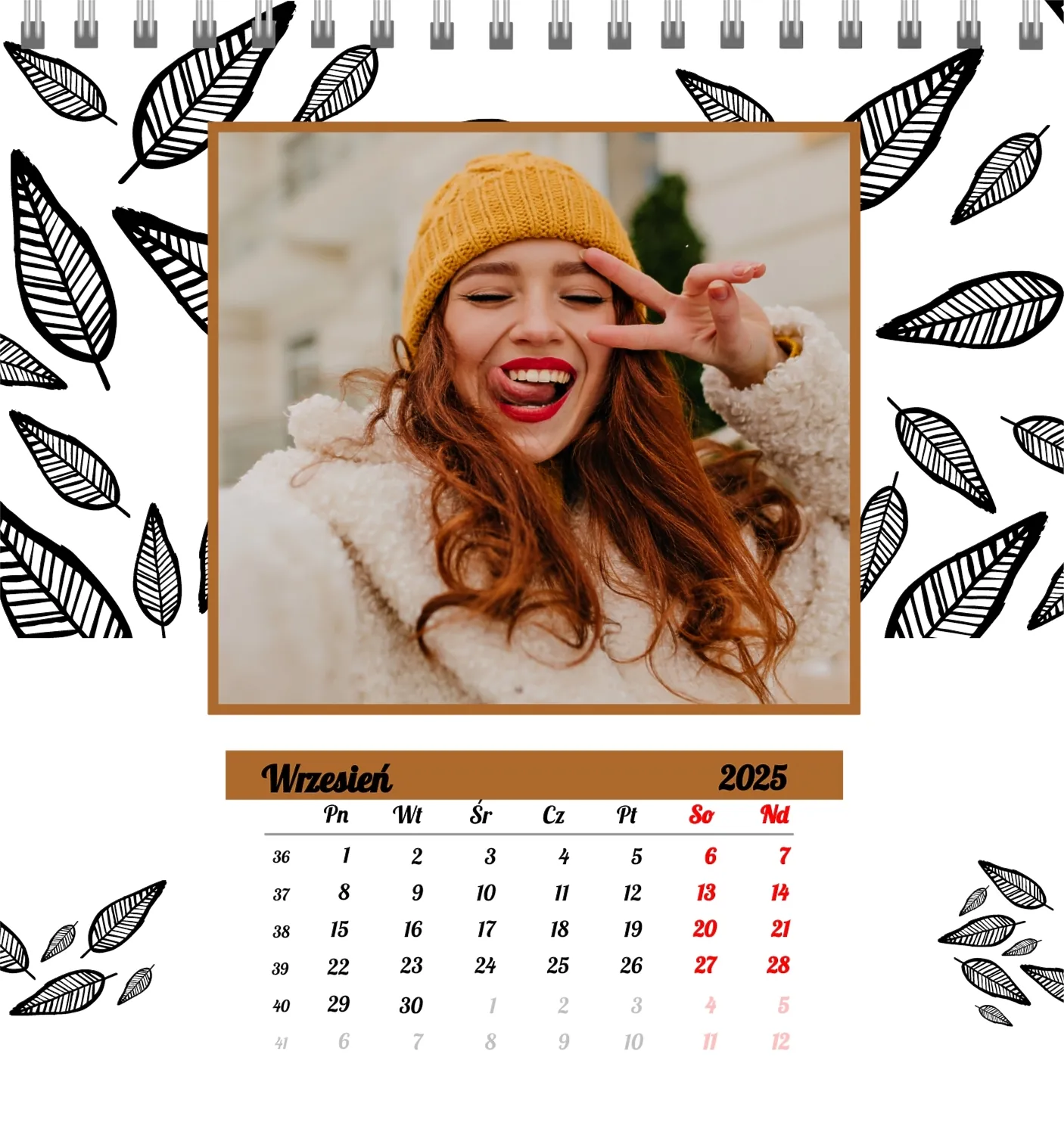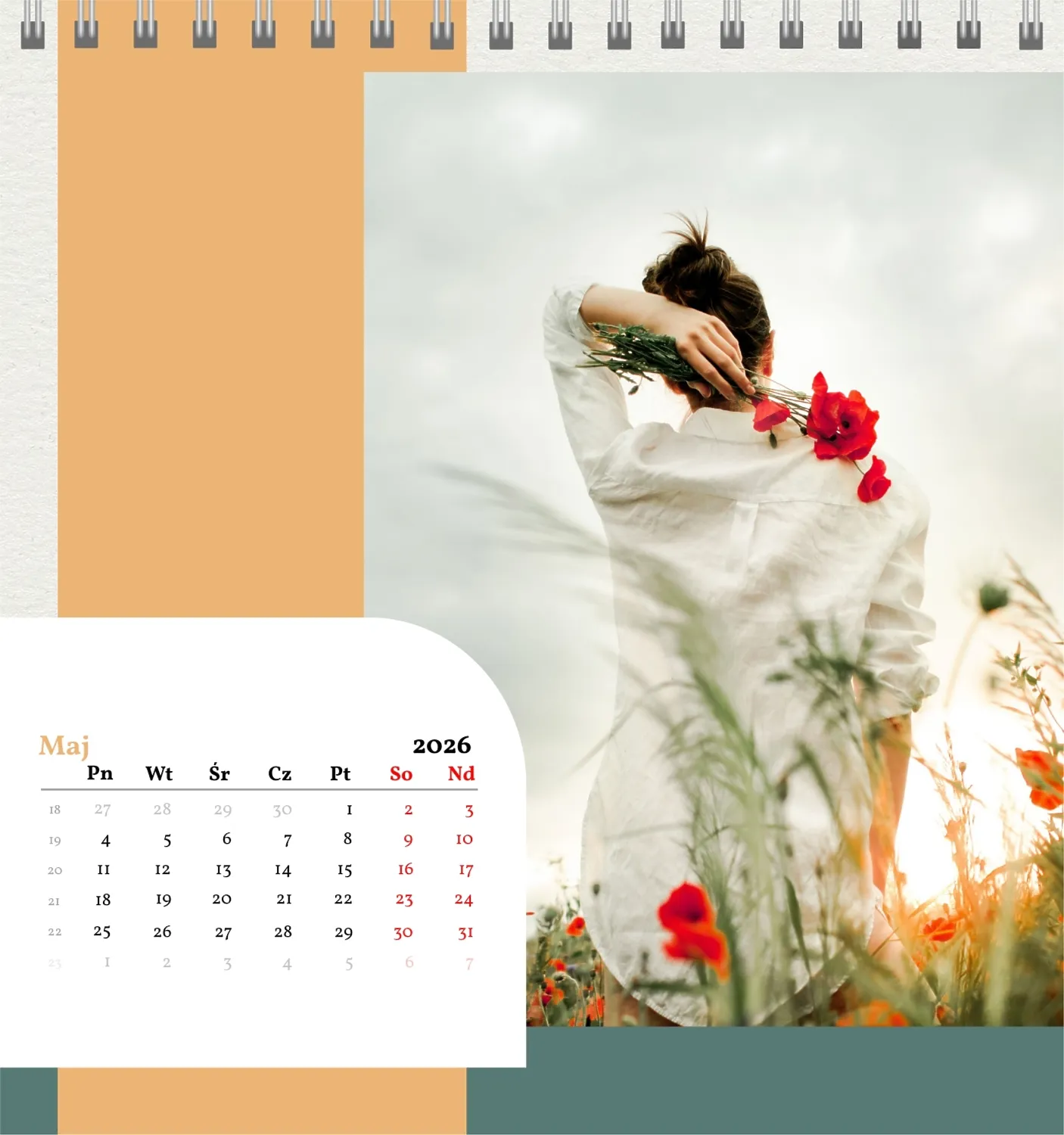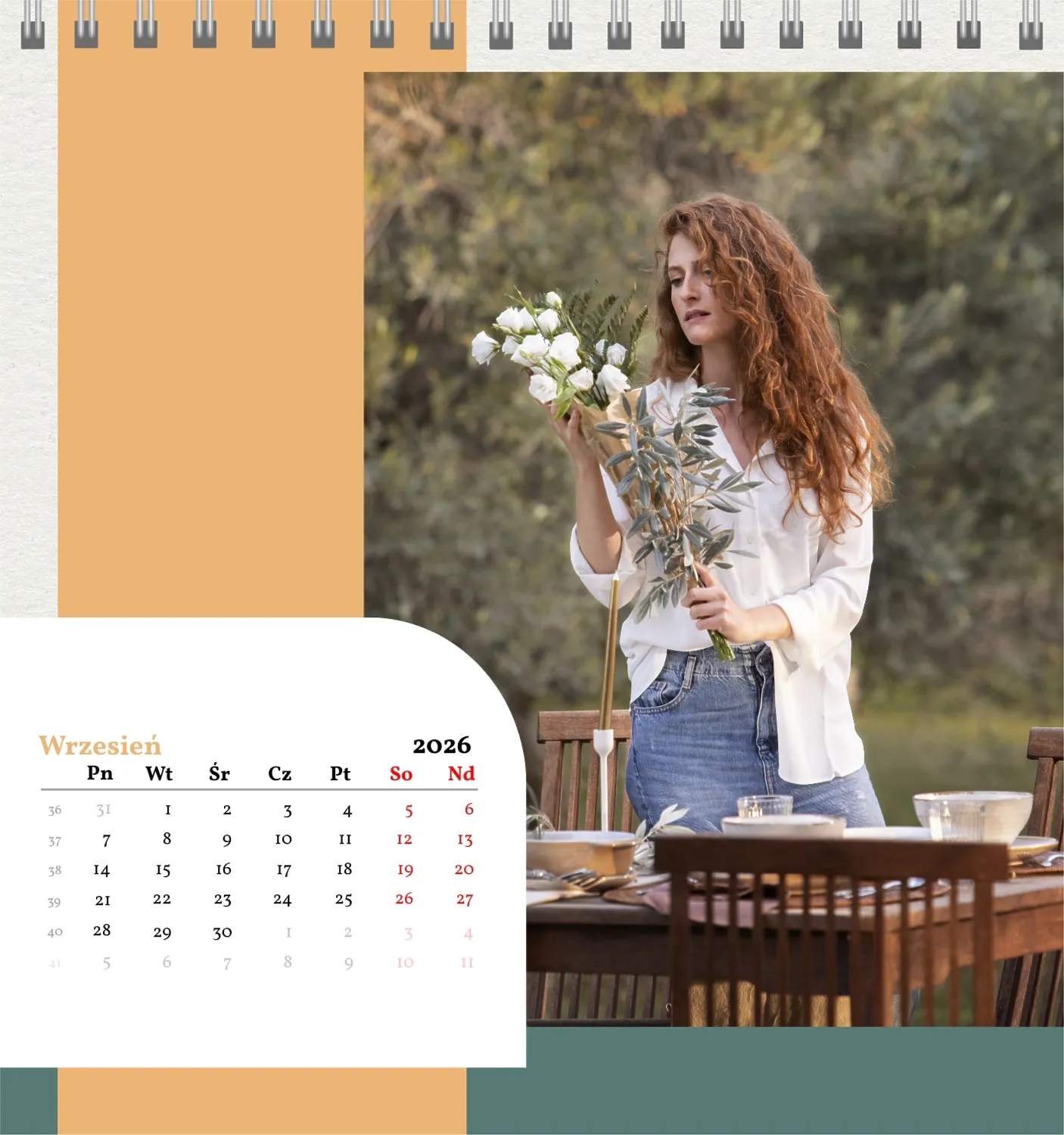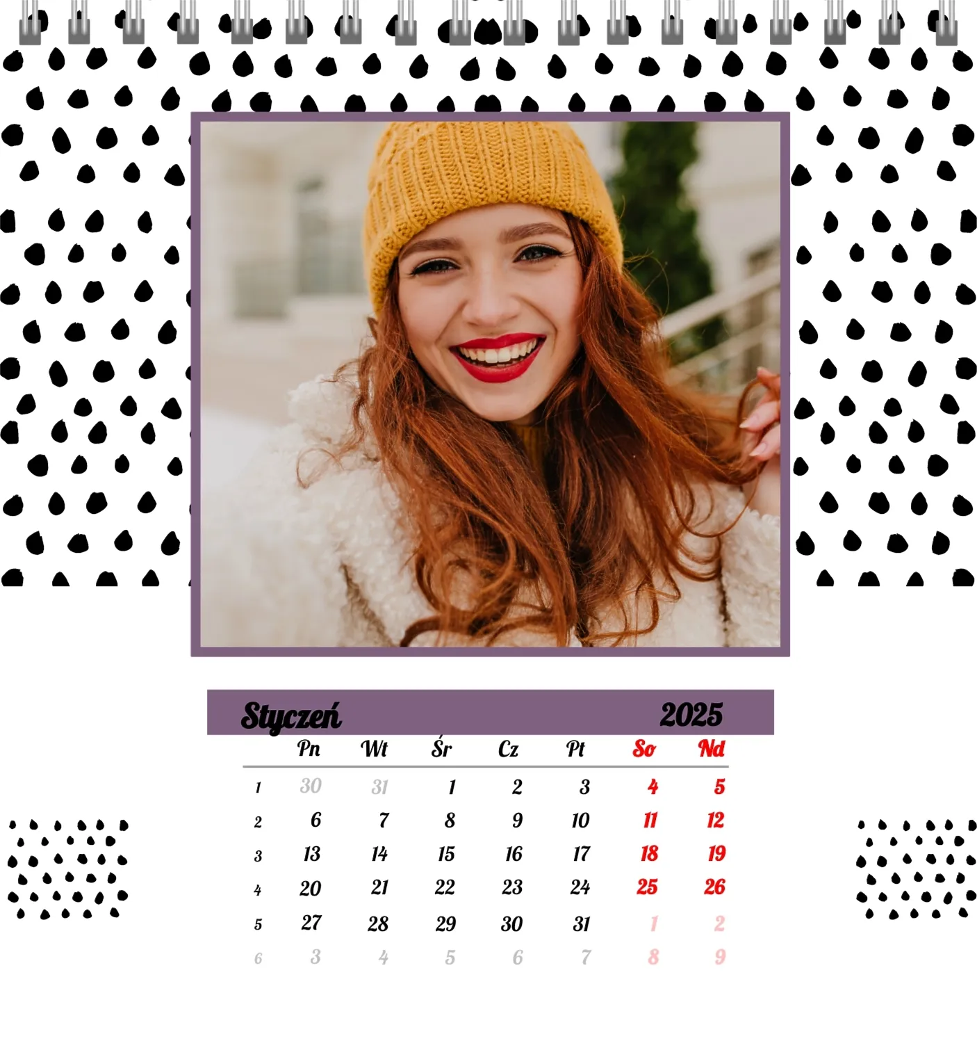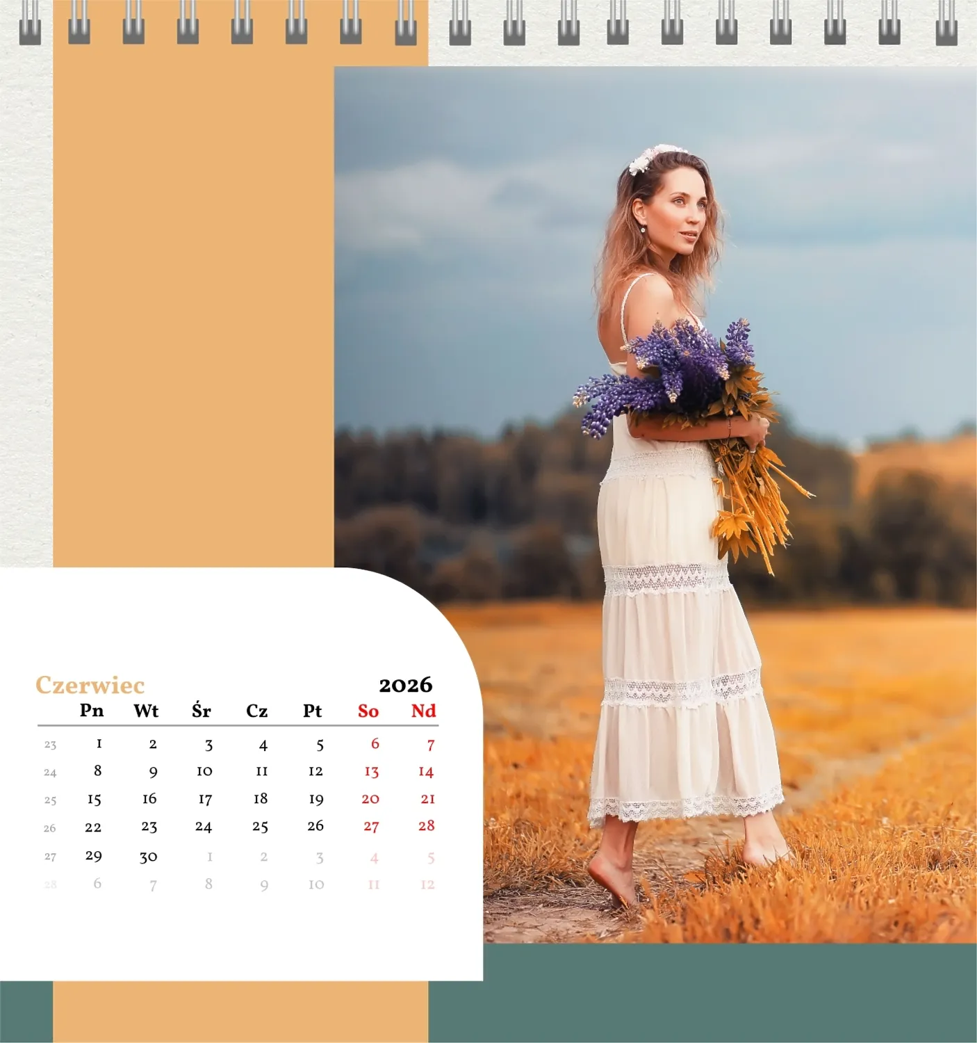 Ten urzekający szablon kalendarza pionowego "najlepsze wspomnienia" ma zainspirować Cię do stworzenia wyjątkowego i delikatnego kalendarza pełnego ciepłych chwil twojego życia. Dostępny dla Ciebie kreator online zapewnia niesamowite możliwości kreatywności. Będziesz mógł łatwo dostosować każdy szczegół, aby kalendarz był naprawdę twój. Szeroki wybór kolorów i czcionek w kreatorze pozwala podkreślić atmosferę każdego miesiąca. Wybierz odcienie, które wywołują w Tobie te same uczucia, które chcesz zachować w pamięci. Stworzenie unikalnego kalendarza biurkowego w kreatorze online to nie tylko proces, ale także możliwość ożywienia najlepszych wspomnień ze szczególną czułością i ciepłem. Niech ten kalendarz będzie odzwierciedleniem twojej wyjątkowej historii.