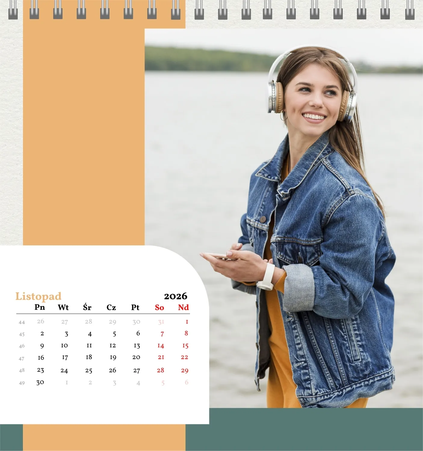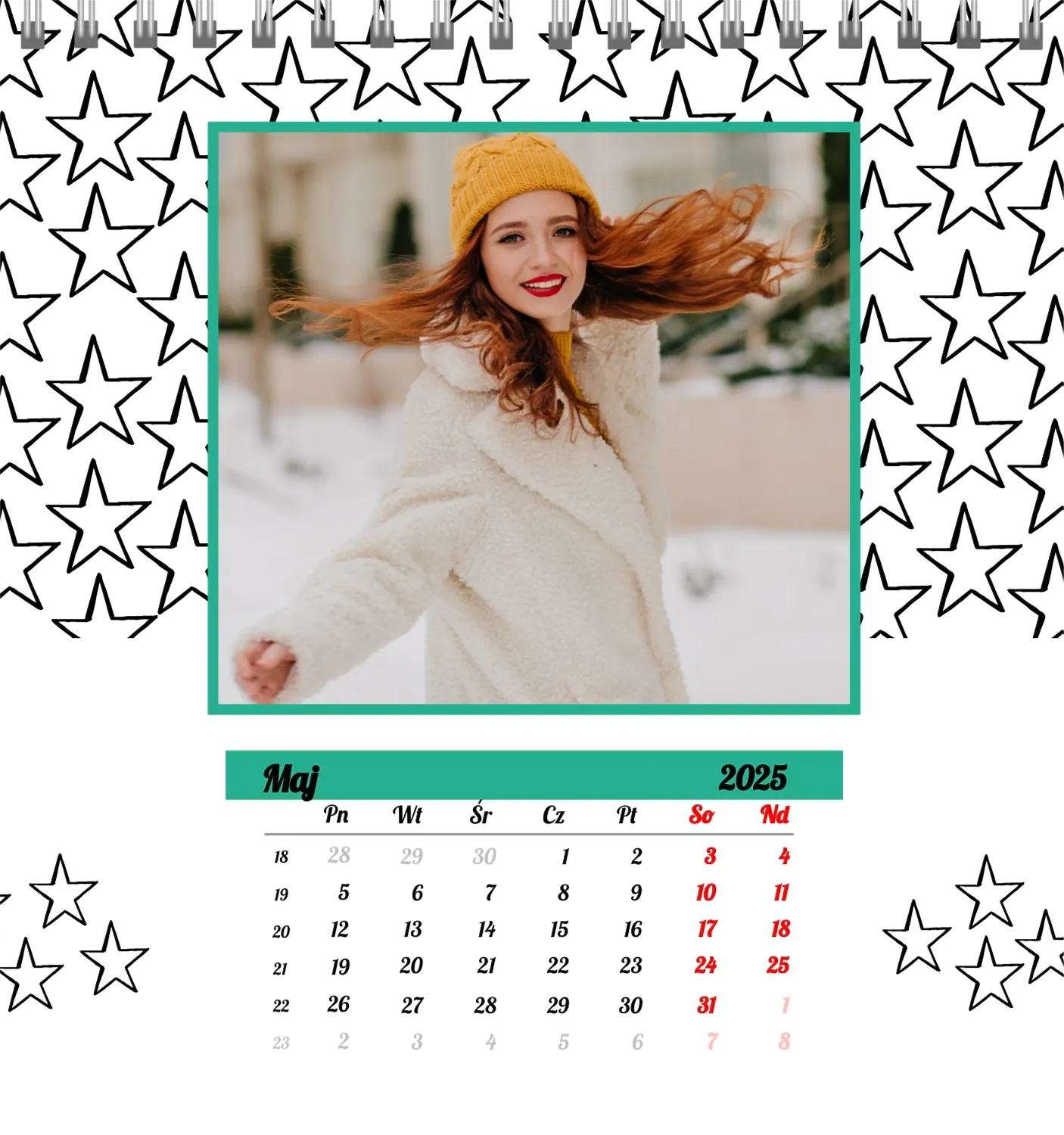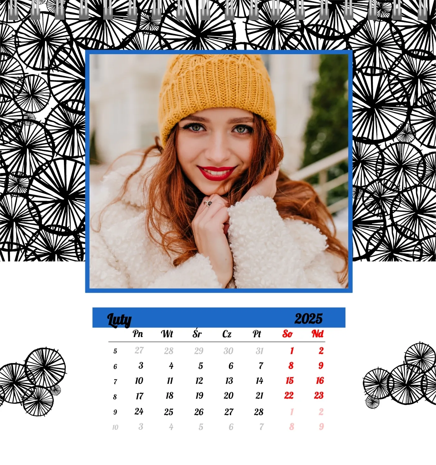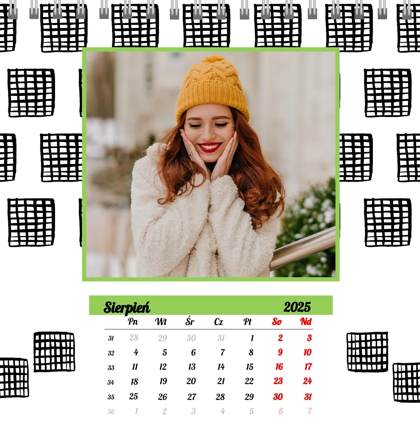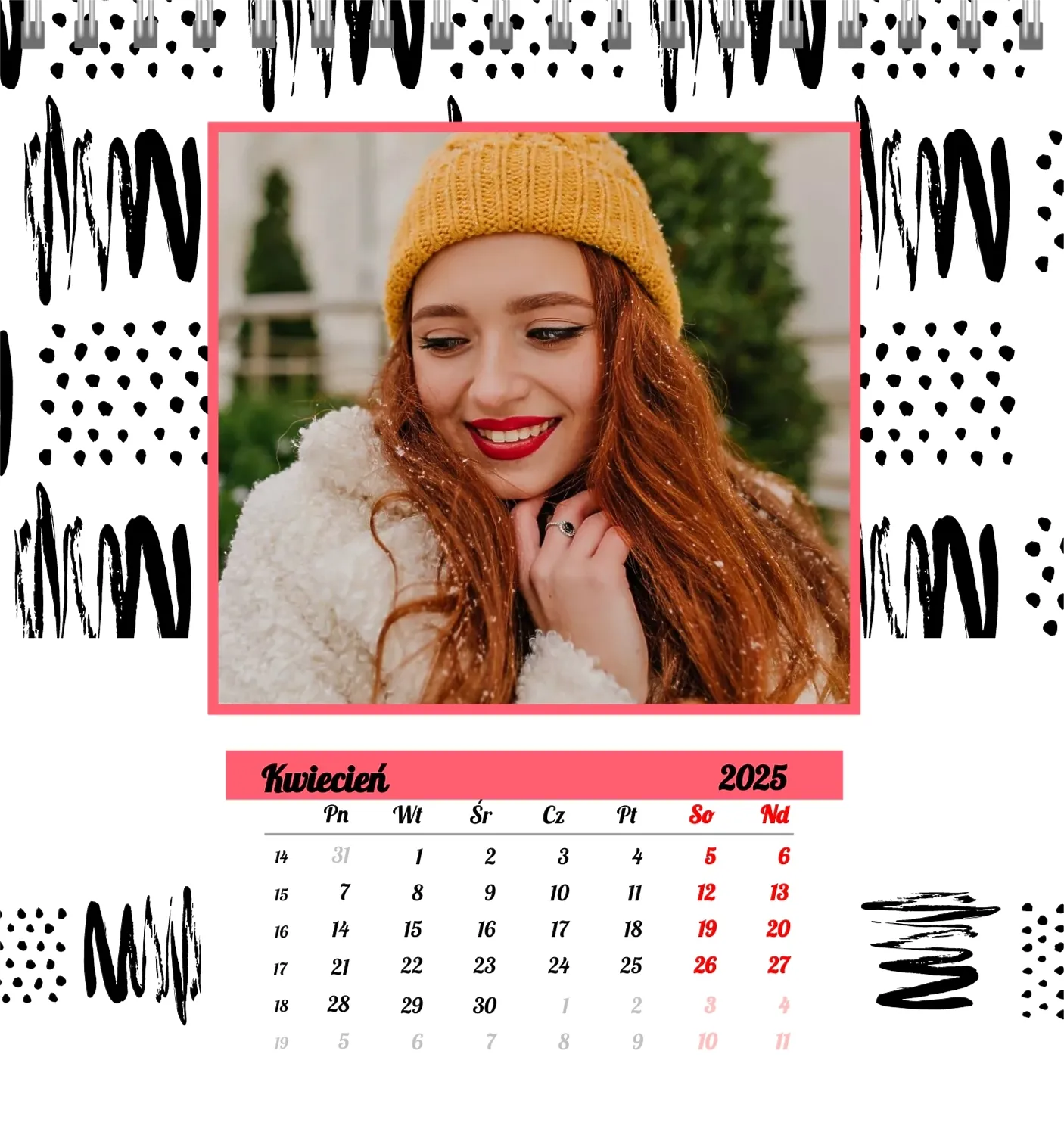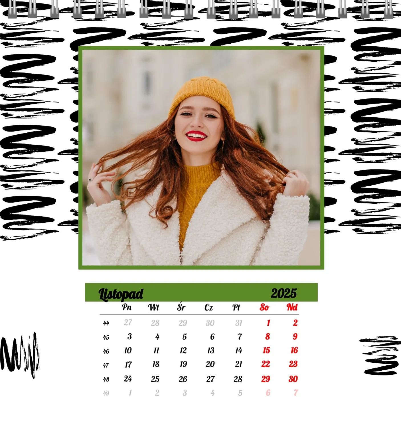 Ten urzekający szablon kalendarza pionowego "najlepsze wspomnienia" ma zainspirować Cię do stworzenia wyjątkowego i delikatnego kalendarza pełnego ciepłych chwil twojego życia. Dostępny dla Ciebie kreator online zapewnia niesamowite możliwości kreatywności. Będziesz mógł łatwo dostosować każdy szczegół, aby kalendarz był naprawdę twój. Szeroki wybór kolorów i czcionek w kreatorze pozwala podkreślić atmosferę każdego miesiąca. Wybierz odcienie, które wywołują w Tobie te same uczucia, które chcesz zachować w pamięci. Stworzenie unikalnego kalendarza biurkowego w kreatorze online to nie tylko proces, ale także możliwość ożywienia najlepszych wspomnień ze szczególną czułością i ciepłem. Niech ten kalendarz będzie odzwierciedleniem twojej wyjątkowej historii.