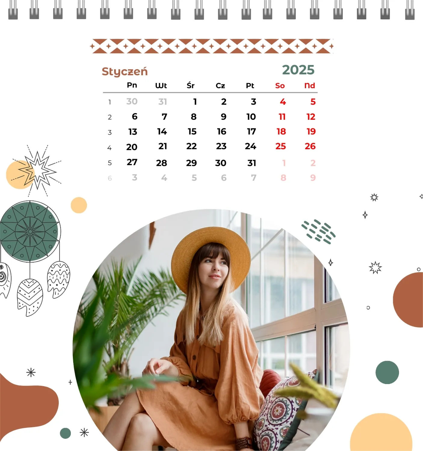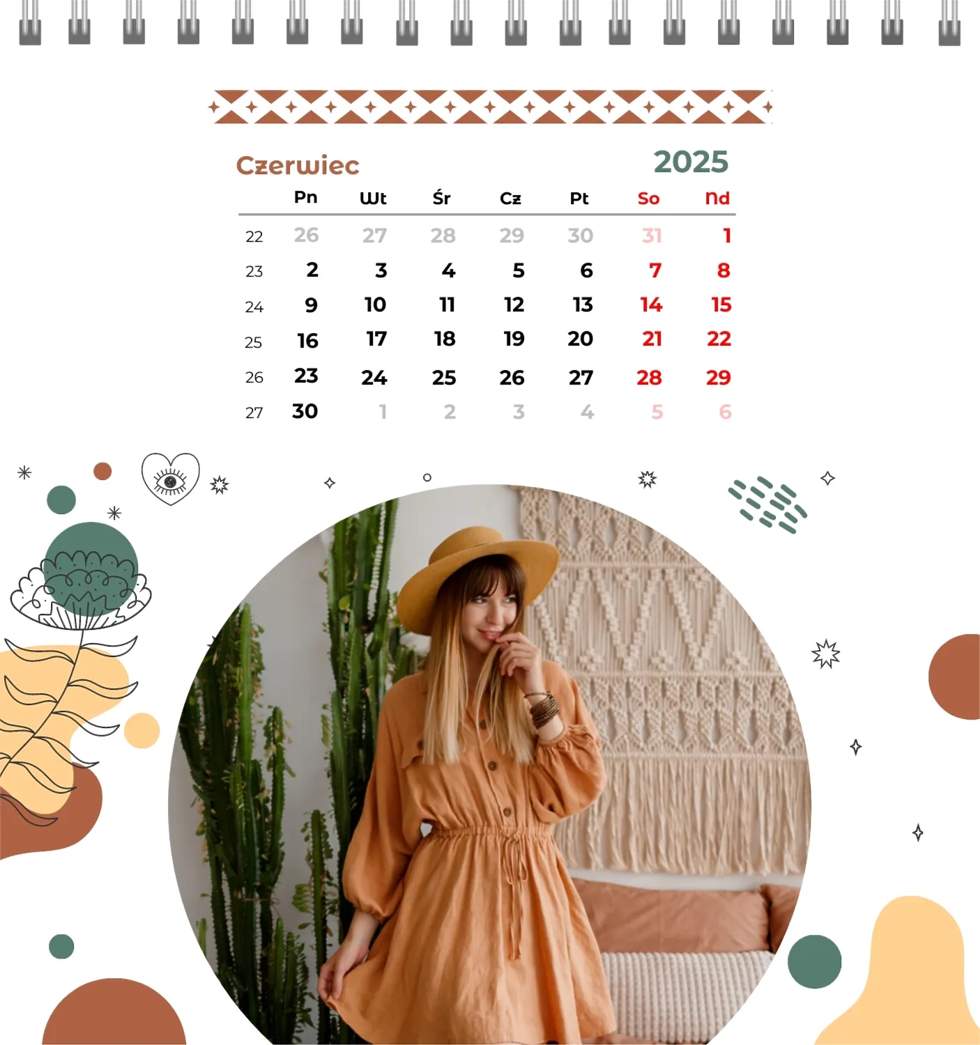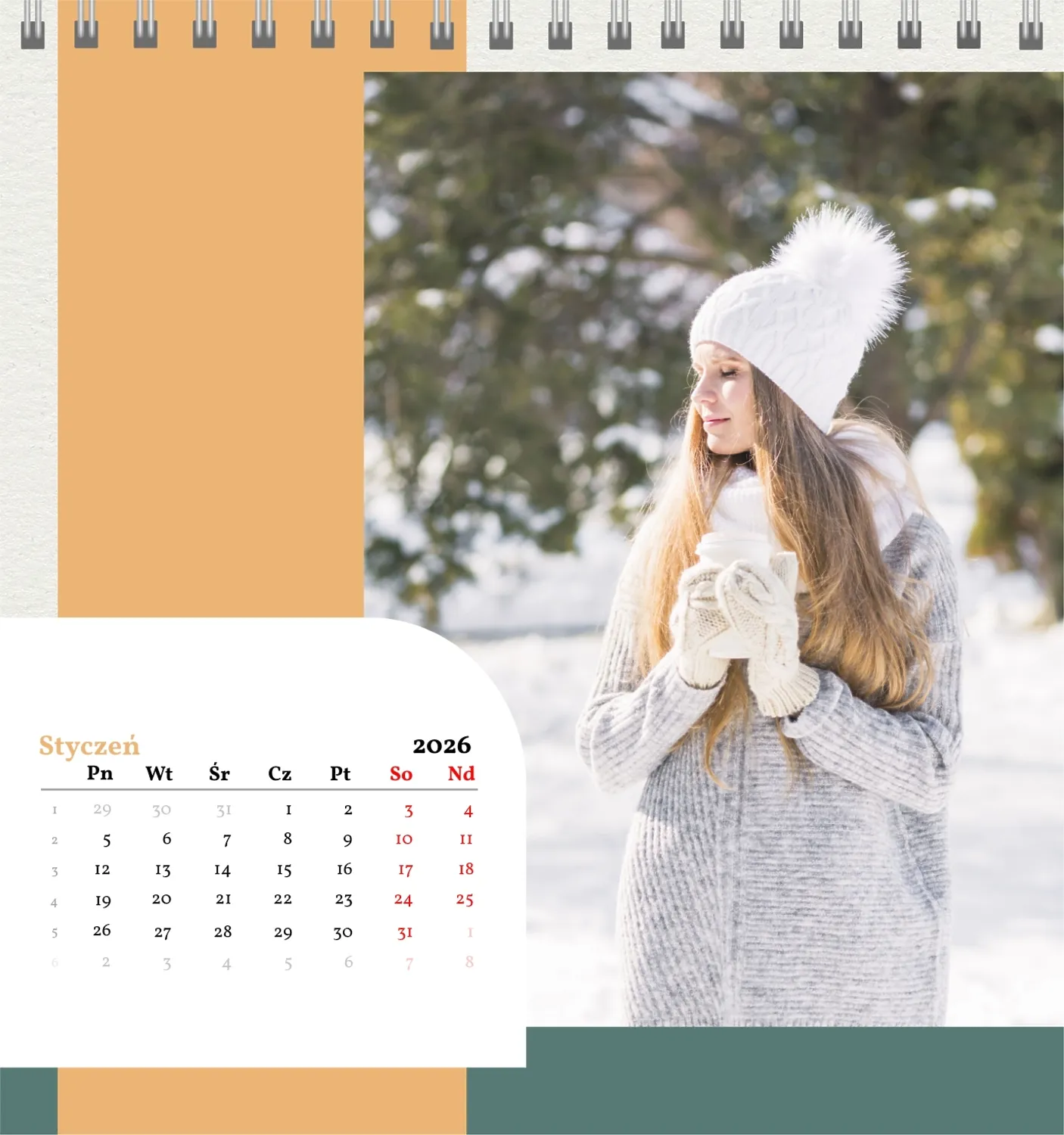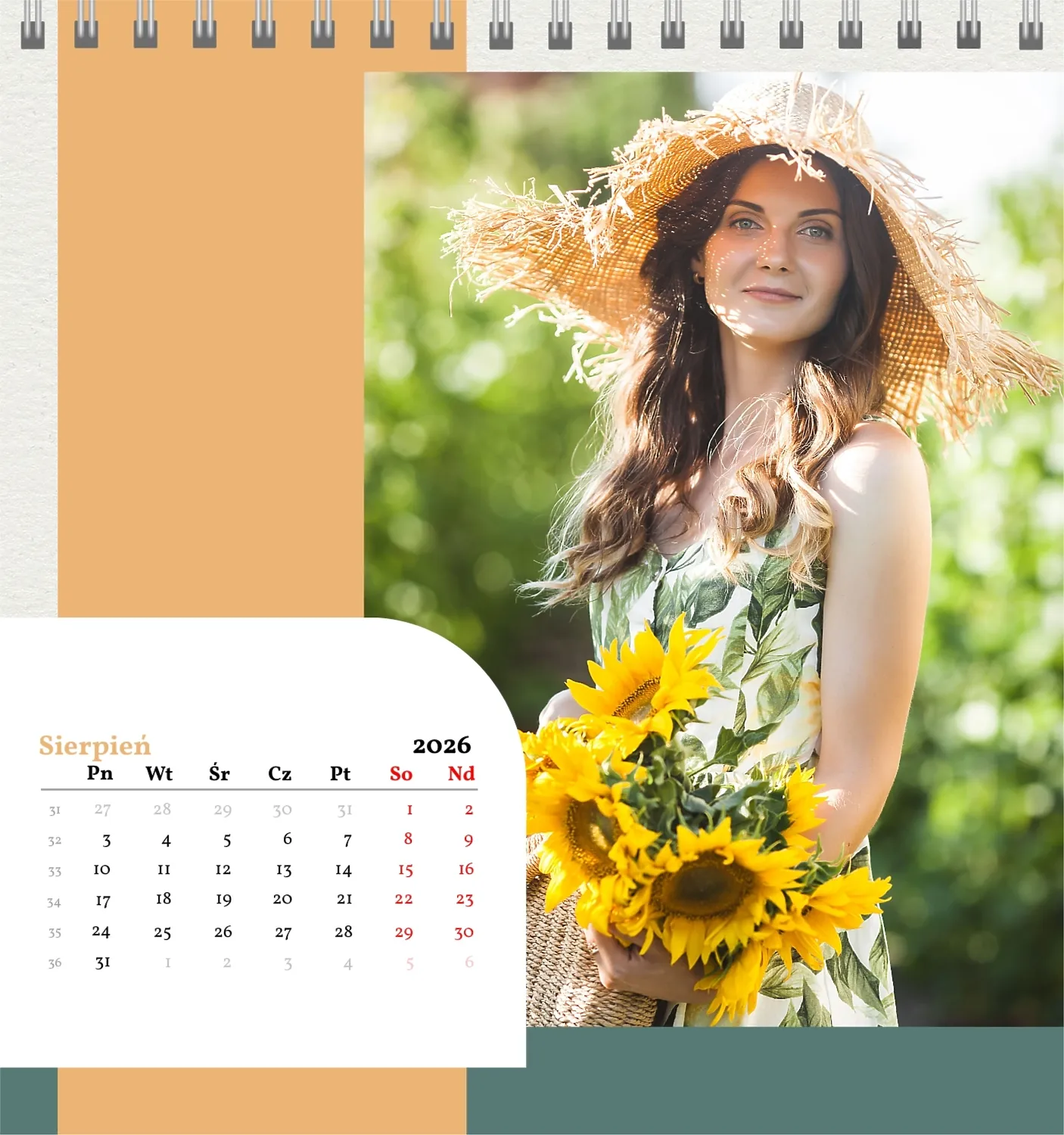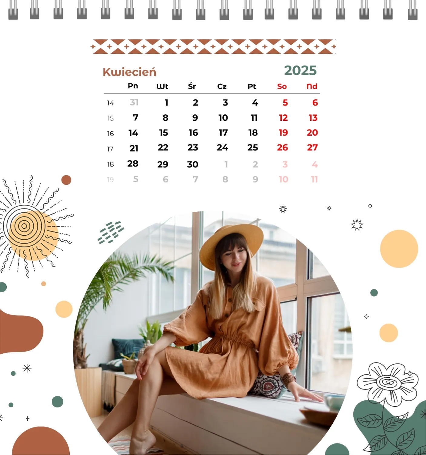 Ten urzekający szablon kalendarza pionowego "najlepsze wspomnienia" ma zainspirować Cię do stworzenia wyjątkowego i delikatnego kalendarza pełnego ciepłych chwil twojego życia. Dostępny dla Ciebie kreator online zapewnia niesamowite możliwości kreatywności. Będziesz mógł łatwo dostosować każdy szczegół, aby kalendarz był naprawdę twój. Szeroki wybór kolorów i czcionek w kreatorze pozwala podkreślić atmosferę każdego miesiąca. Wybierz odcienie, które wywołują w Tobie te same uczucia, które chcesz zachować w pamięci. Stworzenie unikalnego kalendarza biurkowego w kreatorze online to nie tylko proces, ale także możliwość ożywienia najlepszych wspomnień ze szczególną czułością i ciepłem. Niech ten kalendarz będzie odzwierciedleniem twojej wyjątkowej historii.