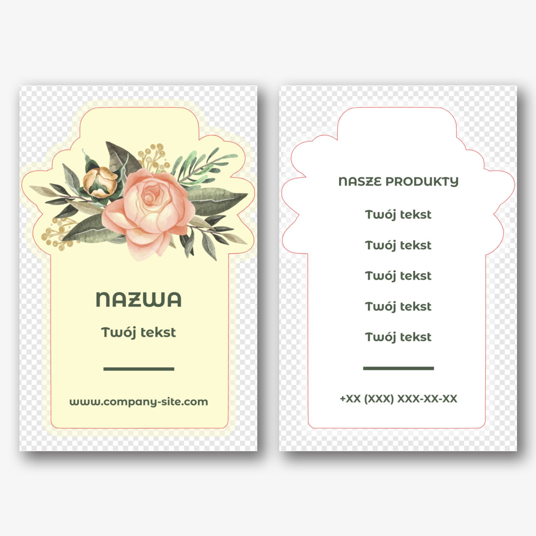 Ten szablon jest idealny dla profesjonalistów z branży kwiatowej, takich jak właściciele kwiaciarni, prywatne kwiaciarnie, a także projektanci kompozycji kwiatowych. Wizytówka w kształcie przyciąga wzrok swoim unikalnym designem, który podkreśli Twoją kreatywność i profesjonalizm, tworząc niezapomniane wrażenie na Twoich klientach. Jedną z kluczowych zalet tego szablonu jest możliwość pełnego dostosowania go do Twoich potrzeb i preferencji. W naszym kreatorze online możesz łatwo edytować wszystkie elementy wizytówki: od koloru i czcionki po lokalizację i rozmiar obrazów. Pozwala stworzyć unikalną wizytówkę, która odzwierciedla Twój styl i markę. Możesz dodawać zdjęcia kwiatów, logo, dane kontaktowe, a nawet unikalne elementy projektu, które pomogą wyróżnić Twoją firmę na tle konkurencji. Proces edycji w naszym kreatorze jest intuicyjny i nie wymaga specjalnych umiejętności. Możesz wybierać spośród wielu opcji stylizacji, eksperymentować z różnymi stylami i natychmiast zobaczyć wynik swoich zmian. To sprawia, że tworzenie wizytówki jest łatwe i przyjemne. W rezultacie otrzymasz nie tylko wizytówkę, ale prawdziwe mini arcydzieło, które przyciągnie uwagę i zapamięta Twoich klientów. Korzystanie z naszego szablonu i Kreatora daje swobodę twórczą i gwarantuje wysoką jakość produktu końcowego. Będziesz mógł tworzyć wizytówki, które dokładnie oddadzą atmosferę i estetykę Twojej firmy Kwiatowej, pomagając Ci nawiązać silne więzi z klientami i partnerami.