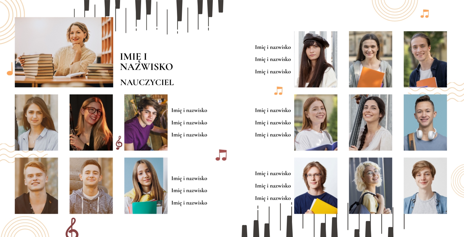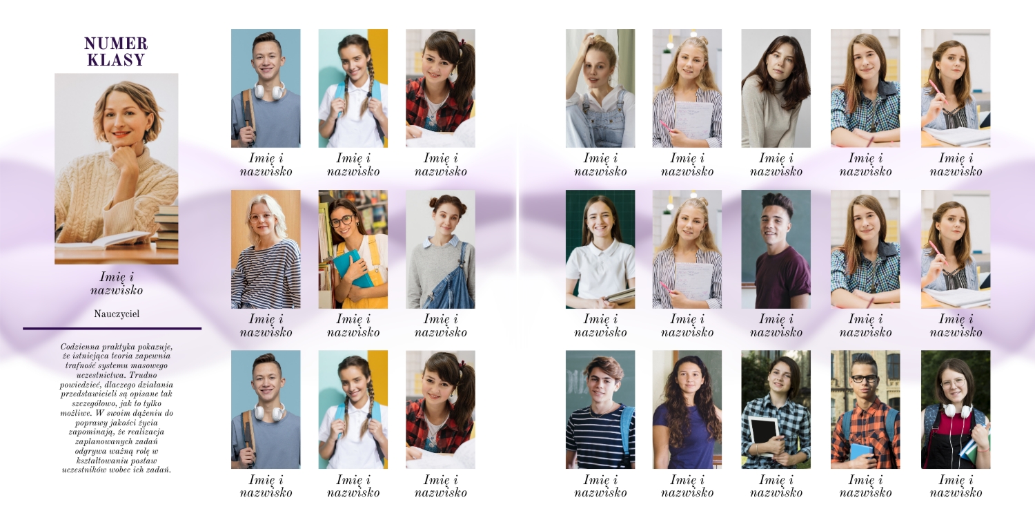 Gotowy szablon kwadratowej książki fotograficznej w twardej oprawie dla uczniów szkół średnich to świetne rozwiązanie do stworzenia niezapomnianego albumu z żywymi wspomnieniami. Szablon został zaprojektowany z myślą o młodzieży i tematach szkolnych, jego styl odpowiada znaczeniu i powadze wydarzenia, podkreślając zakończenie ścieżki szkolnej. Dzięki eleganckiemu wzornictwu i wygodnej strukturze ten szablon będzie odpowiedni nie tylko dla absolwentów, ale także dla profesjonalistów związanych z edukacją i organizacją wydarzeń, takich jak fotografowie, specjaliści od drukowania zdjęć i nauczyciele. Główną zaletą korzystania z tego szablonu jest elastyczność jego edycji w naszym kreatorze online. Użytkownicy mogą samodzielnie dodawać i zmieniać zdjęcia, dostosowywać podpisy do każdego zdjęcia, wybierać czcionki, tła, kolory i elementy dekoracyjne, tworząc w ten sposób unikalną fotoksiążkę, która odzwierciedla osobowość każdej klasy lub grupy. Nasz kreator ułatwia przenoszenie elementów, dodawanie stron i tekstu, dzięki czemu praca nad fotoksiążką jest tak prosta i przyjemna, jak to tylko możliwe.