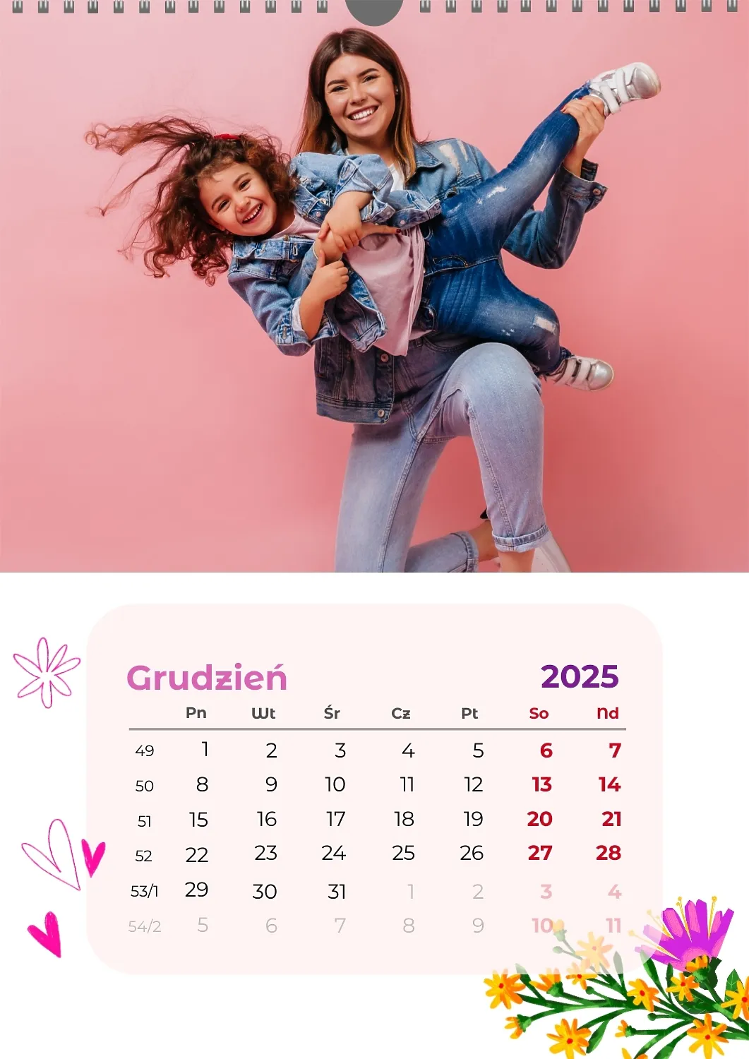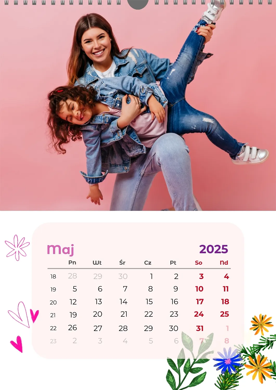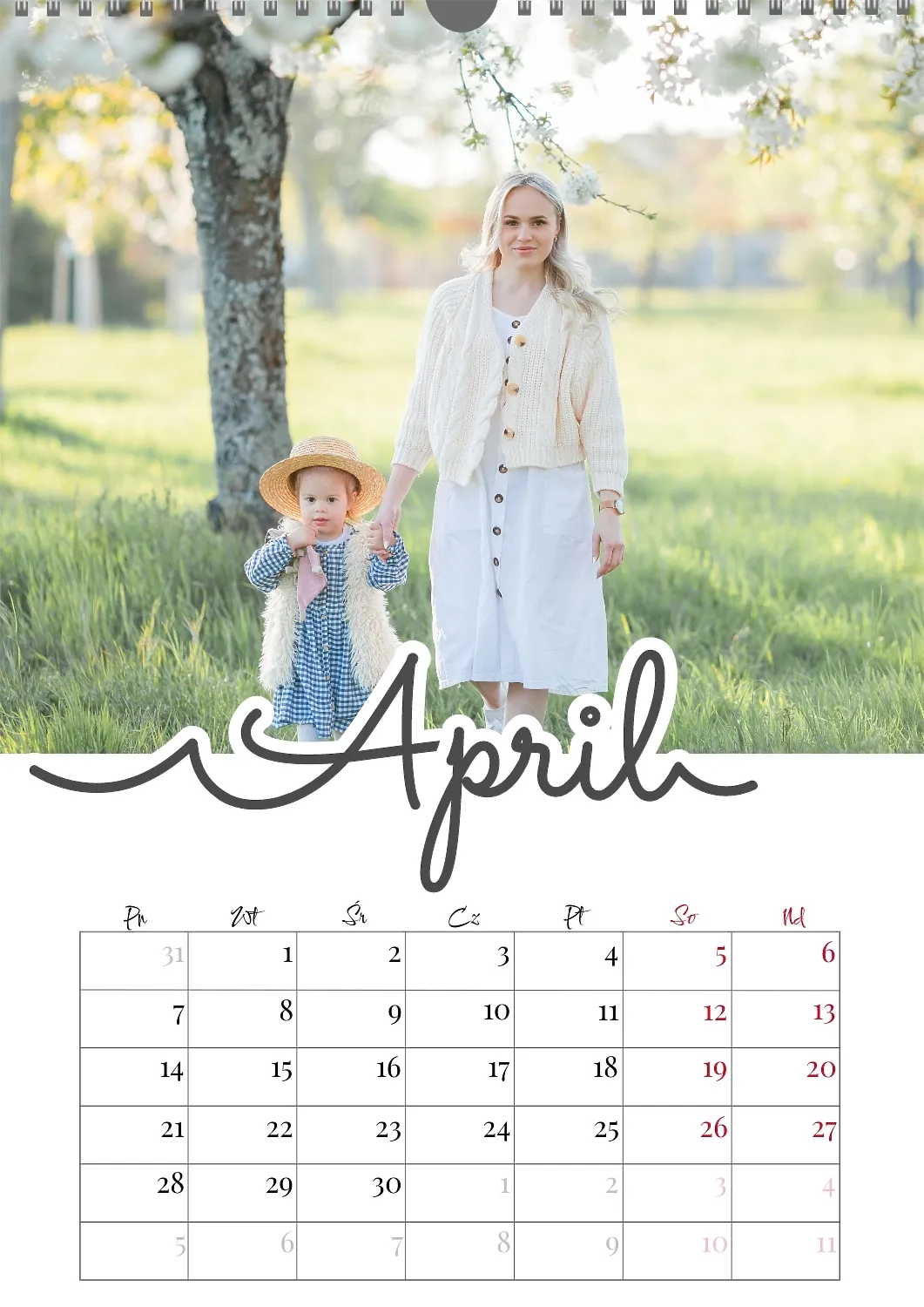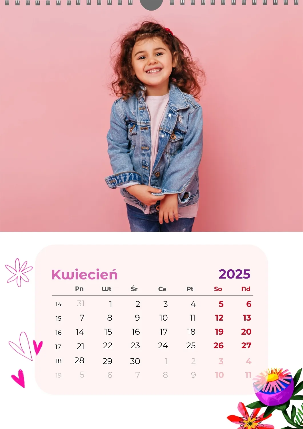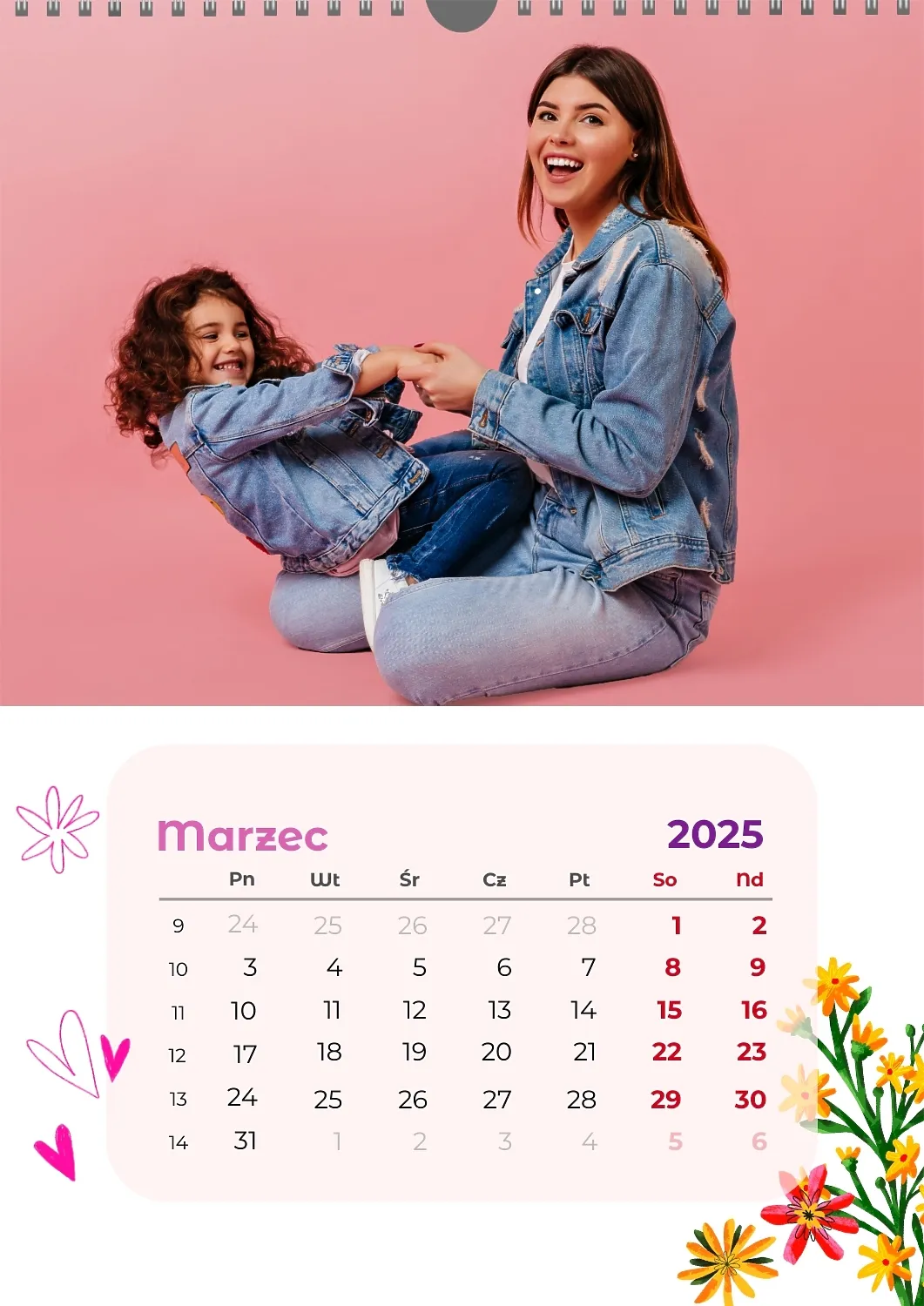 Gotowy szablon ściennego kalendarza rodzinnego to wygodne i wszechstronne rozwiązanie dla tych, którzy cenią sobie indywidualne podejście do planowania i chcą zachować ważne rodzinne chwile w stylowej i praktycznej formie. Ten szablon jest idealny do tworzenia spersonalizowanego kalendarza własnymi rękami, który zachwyci Ciebie i Twoich bliskich przez cały rok. Jedną z głównych zalet rodzinnego kalendarza pionowego na ścianie jest możliwość pełnej edycji w naszym kreatorze online. Możesz zmienić tło, dodać zdjęcia, podpisać każdy miesiąc indywidualnie, świętując urodziny, rocznice i inne ważne daty. Intuicyjny interfejs projektanta ułatwia zamianę obrazów, Wybór odpowiednich czcionek i kolorów oraz ułożenie elementów tak, aby idealnie pasowały do Twojego stylu i zadań. Ten gotowy szablon będzie podstawą do stworzenia unikalnego kalendarza, który będzie odzwierciedlał Twoją historię i styl życia. Odkryj kreatywność i wygodę w tworzeniu spersonalizowanych kalendarzy rodzinnych w naszym kreatorze online!