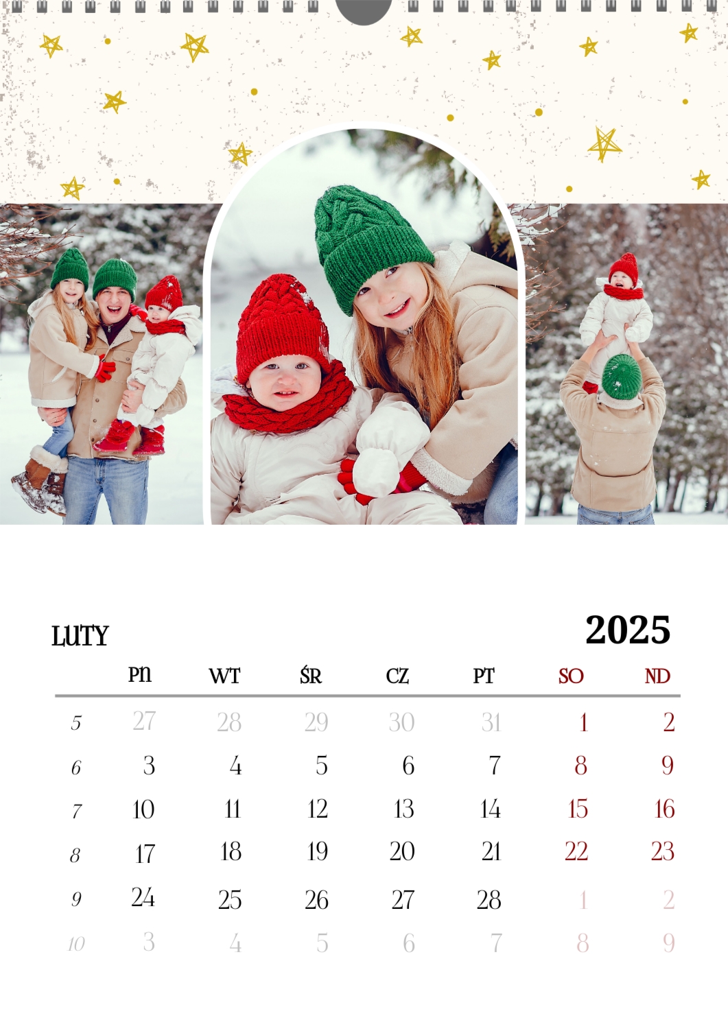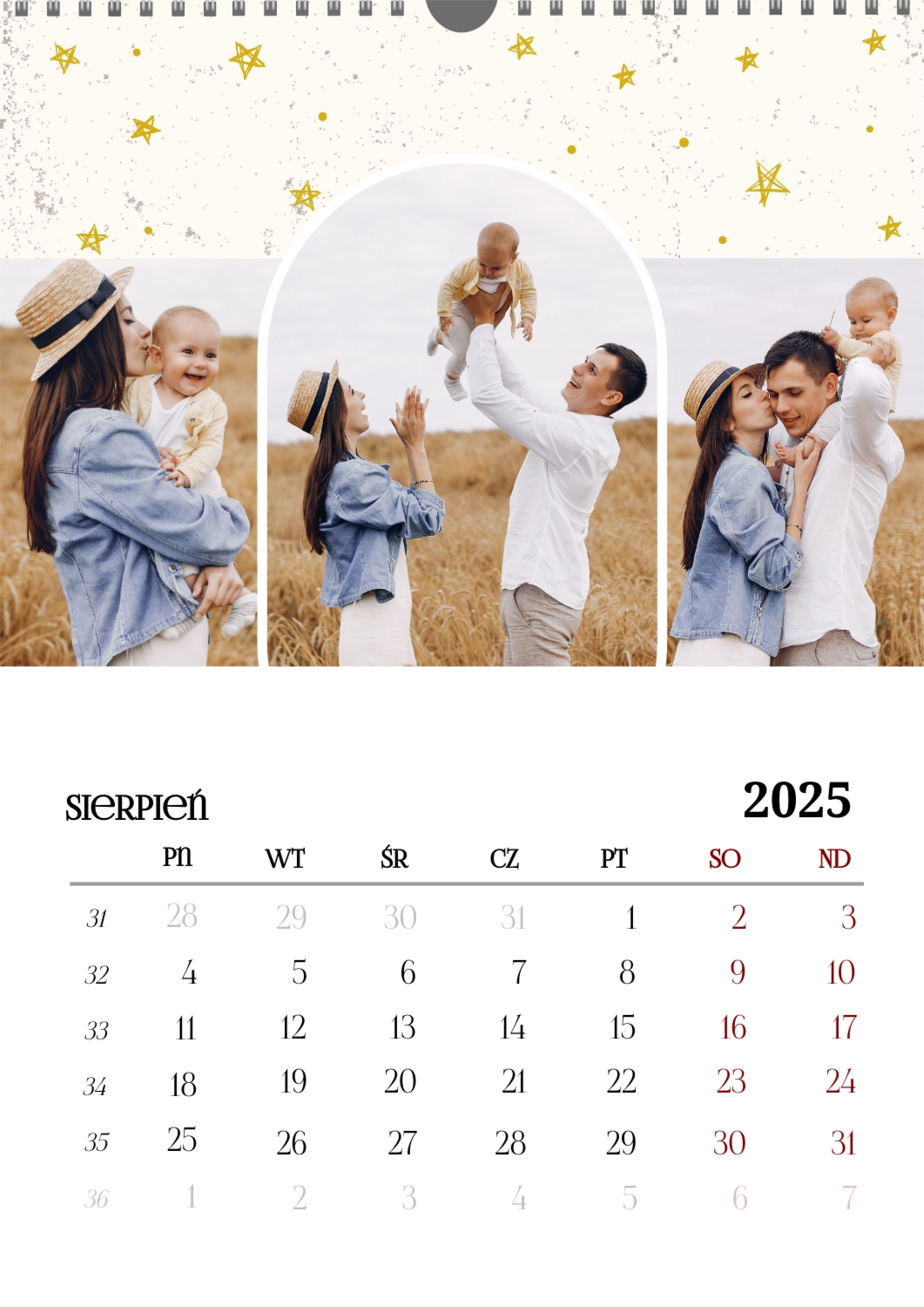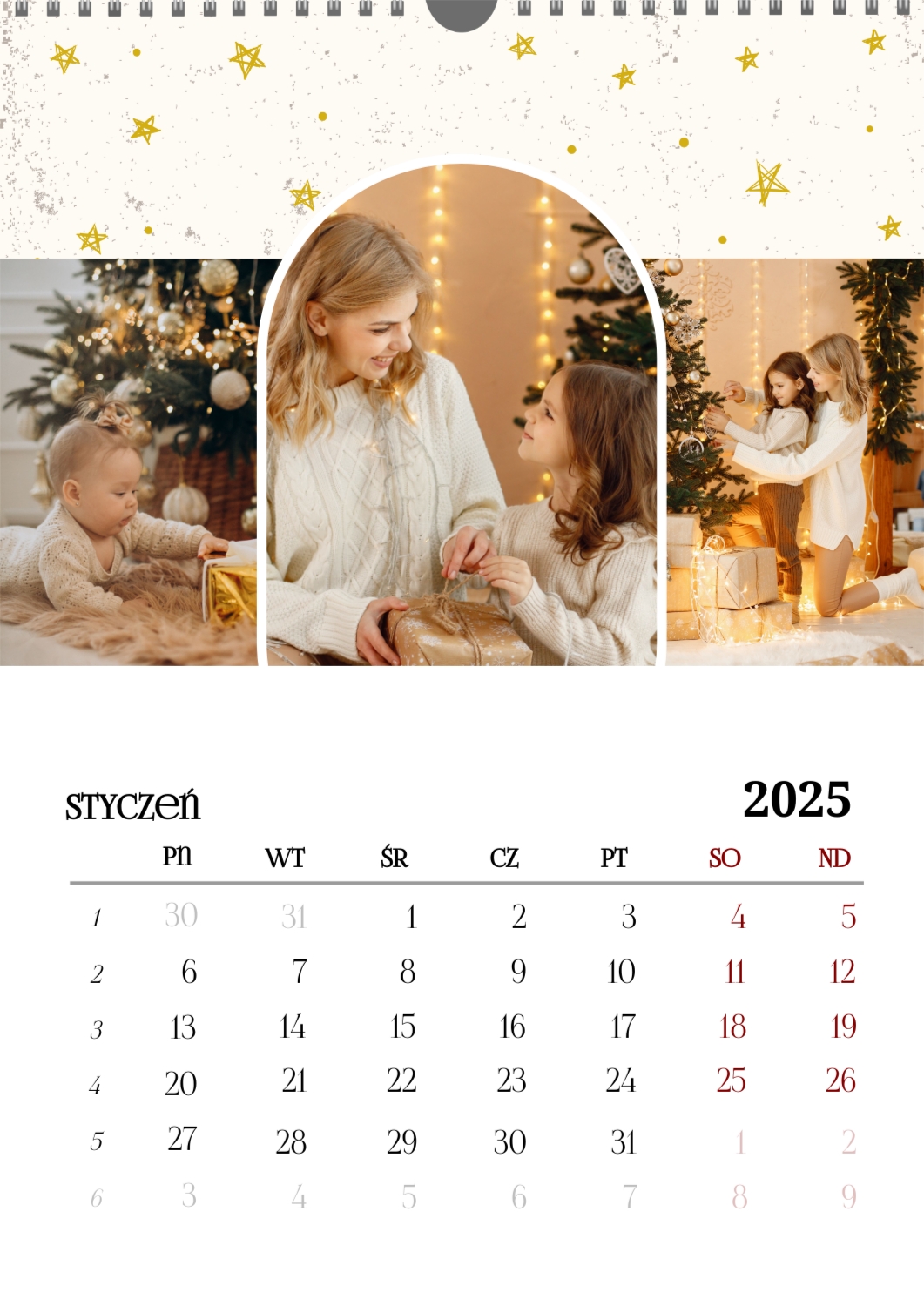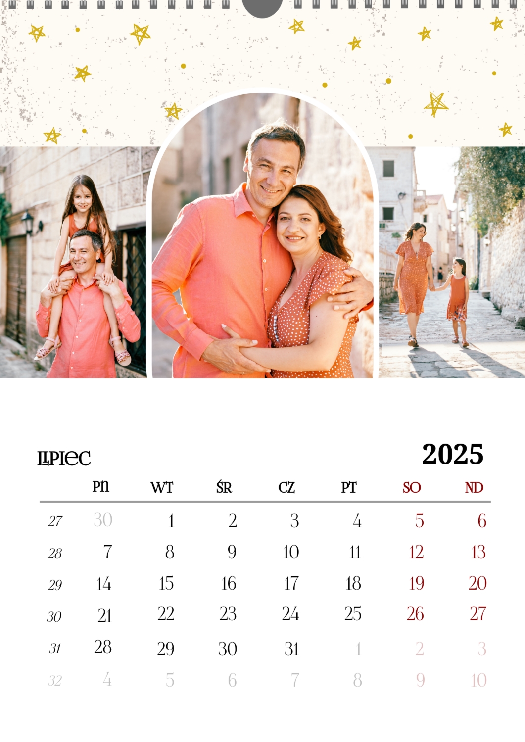 Gotowy szablon ściennego kalendarza rodzinnego to wygodne i wszechstronne rozwiązanie dla tych, którzy cenią sobie indywidualne podejście do planowania i chcą zachować ważne rodzinne chwile w stylowej i praktycznej formie. Ten szablon jest idealny do tworzenia spersonalizowanego kalendarza własnymi rękami, który zachwyci Ciebie i Twoich bliskich przez cały rok. Jedną z głównych zalet rodzinnego kalendarza pionowego na ścianie jest możliwość pełnej edycji w naszym kreatorze online. Możesz zmienić tło, dodać zdjęcia, podpisać każdy miesiąc indywidualnie, świętując urodziny, rocznice i inne ważne daty. Intuicyjny interfejs projektanta ułatwia zamianę obrazów, Wybór odpowiednich czcionek i kolorów oraz ułożenie elementów tak, aby idealnie pasowały do Twojego stylu i zadań. Ten gotowy szablon będzie podstawą do stworzenia unikalnego kalendarza, który będzie odzwierciedlał Twoją historię i styl życia. Odkryj kreatywność i wygodę w tworzeniu spersonalizowanych kalendarzy rodzinnych w naszym kreatorze online!