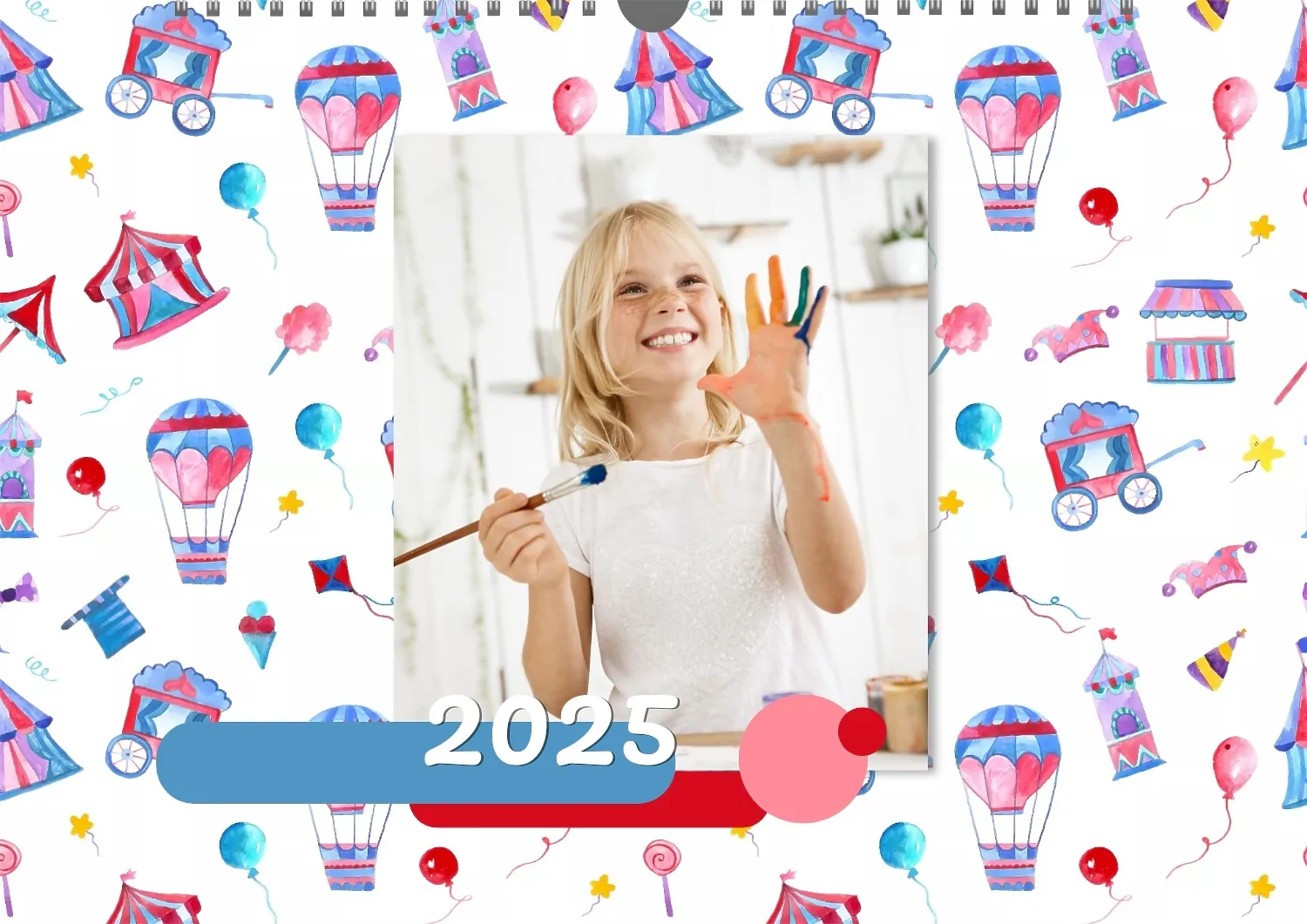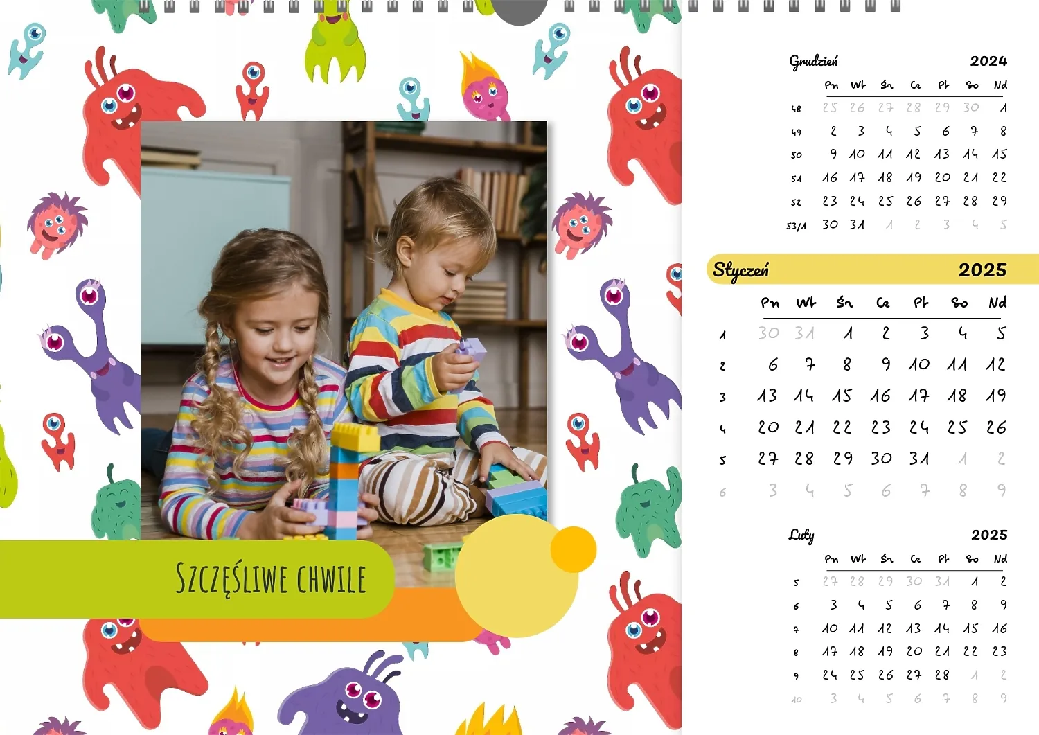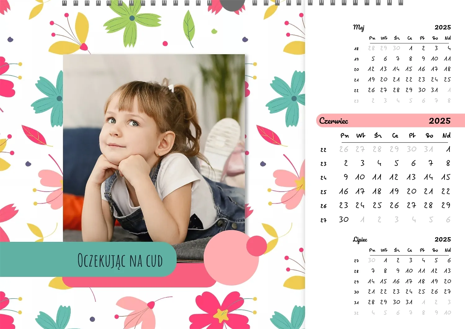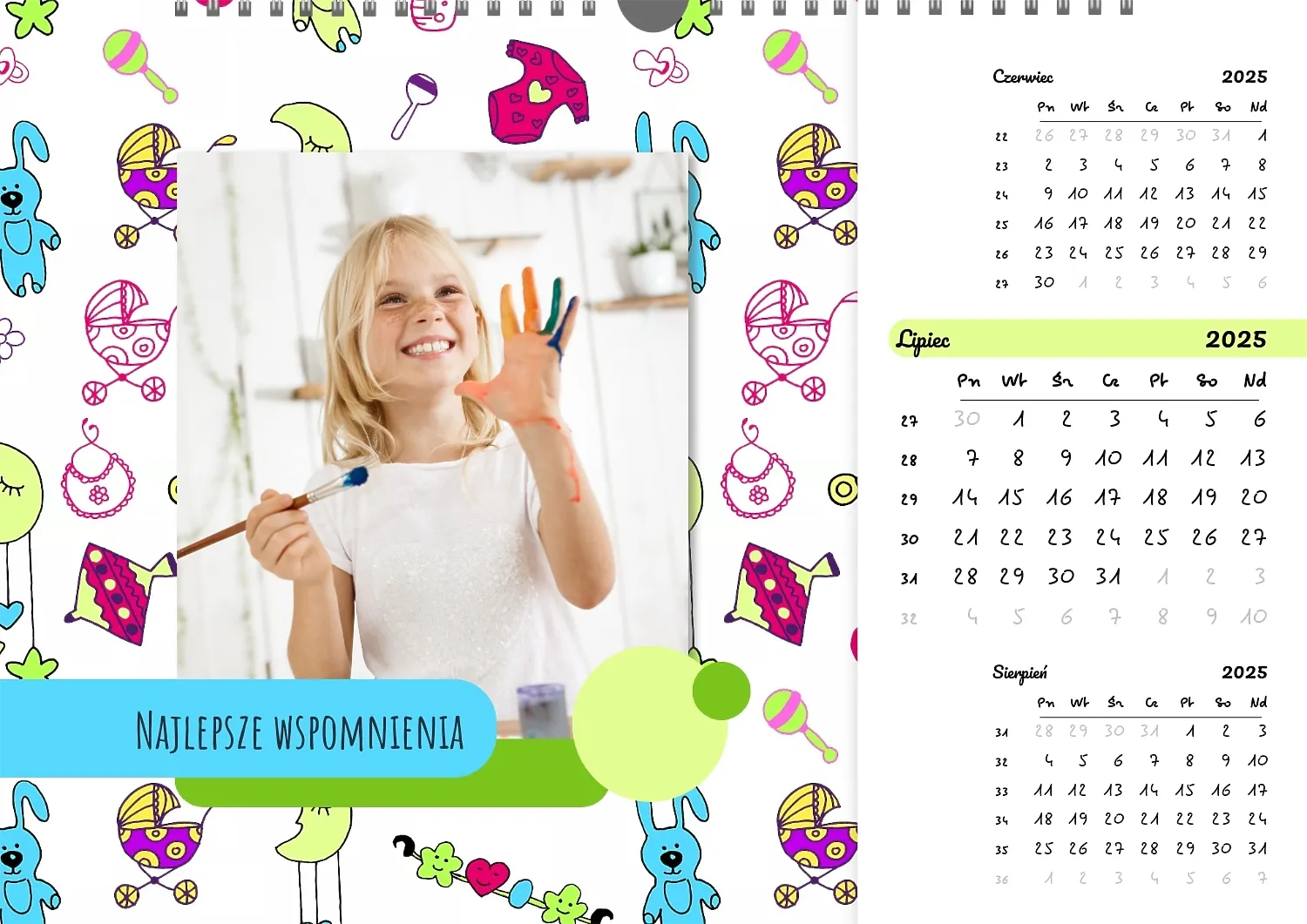 Darmowy szablon kalendarza ściennego dla dzieci na niezapomniane chwile, z możliwością edycji w kreatorze kalendarza.