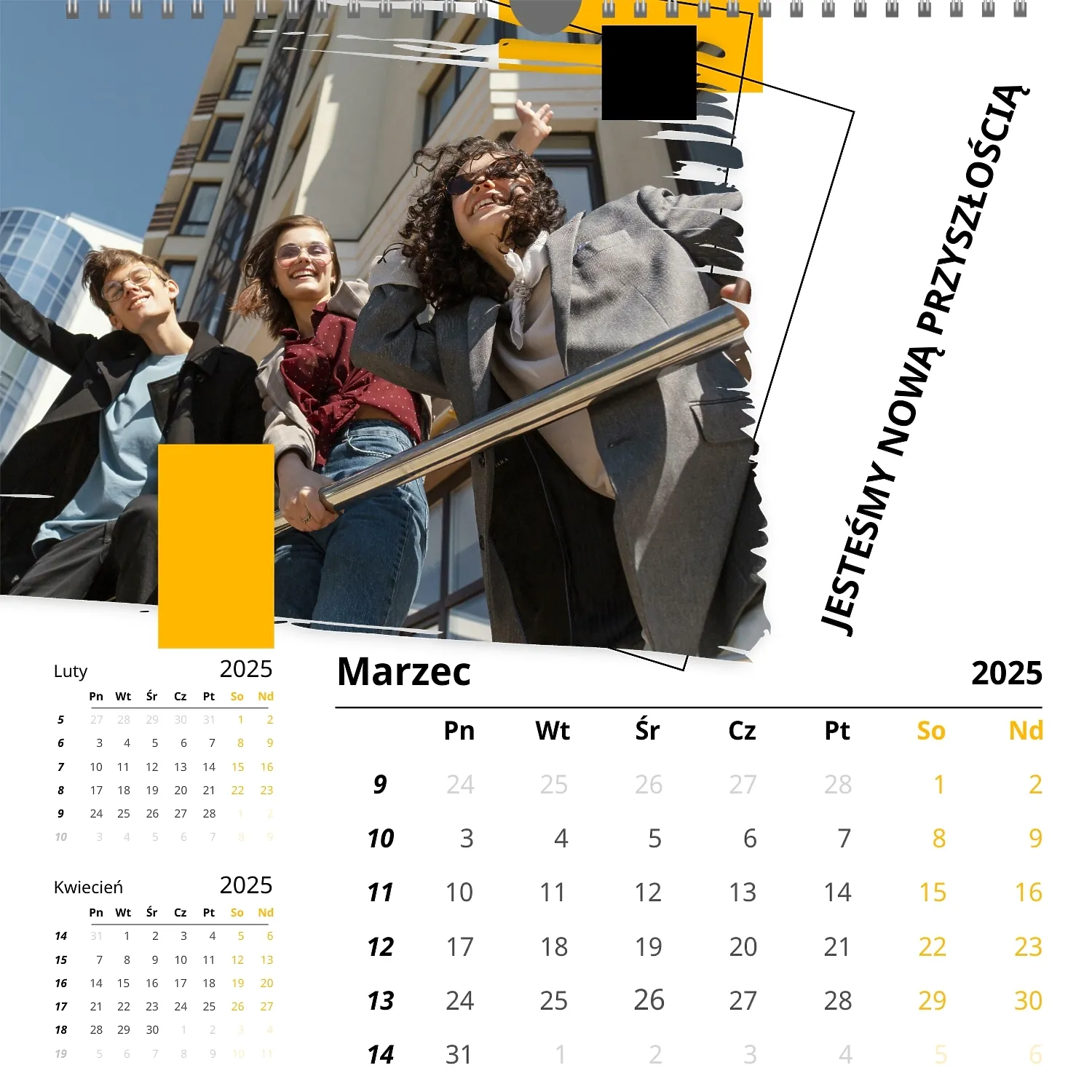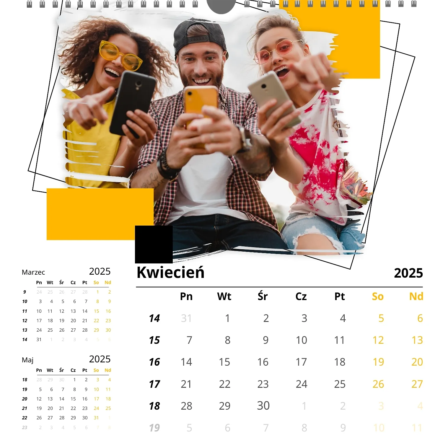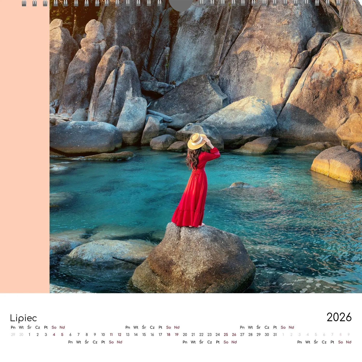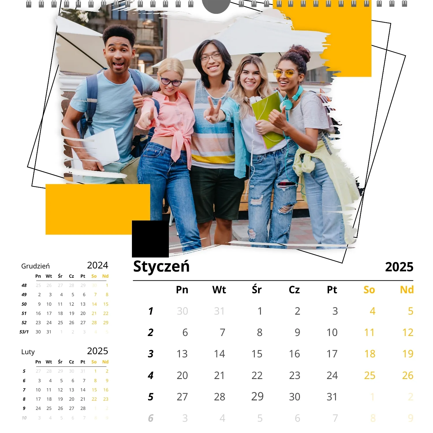Szablon kalendarza "najlepsze wspomnienia" to idealna podstawa do stworzenia spersonalizowanego kwadratowego kalendarza ściennego, który będzie odzwierciedlał najważniejsze momenty Twojego życia. Ten szablon jest odpowiedni dla każdego użytkownika, który chce podkreślić osobowość i zachować ważne wydarzenia w stylowym i funkcjonalnym formacie. Szczególnie przyda się fotografom, parom, właścicielom kreatywnych studiów lub małym firmom, które chcą stworzyć wyjątkowy produkt dla klientów lub podarować swoim bliskim coś wyjątkowego. Główną cechą szablonu "najlepsze wspomnienia" jest jego wszechstronność. Możesz łatwo dostosować projekt do swoich potrzeb dzięki naszemu poręcznemu kreatorowi online. Edycja pozwala zastąpić zdjęcia, dodać bloki tekstowe z ważnymi datami lub inspirującymi cytatami oraz wybrać kolorystykę, która podkreśli Twój nastrój. Kreator oferuje prosty interfejs, w którym dosłownie tworzysz unikalny kalendarz własnymi rękami, dodając osobiste akcenty i eksperymentując z elementami projektu.