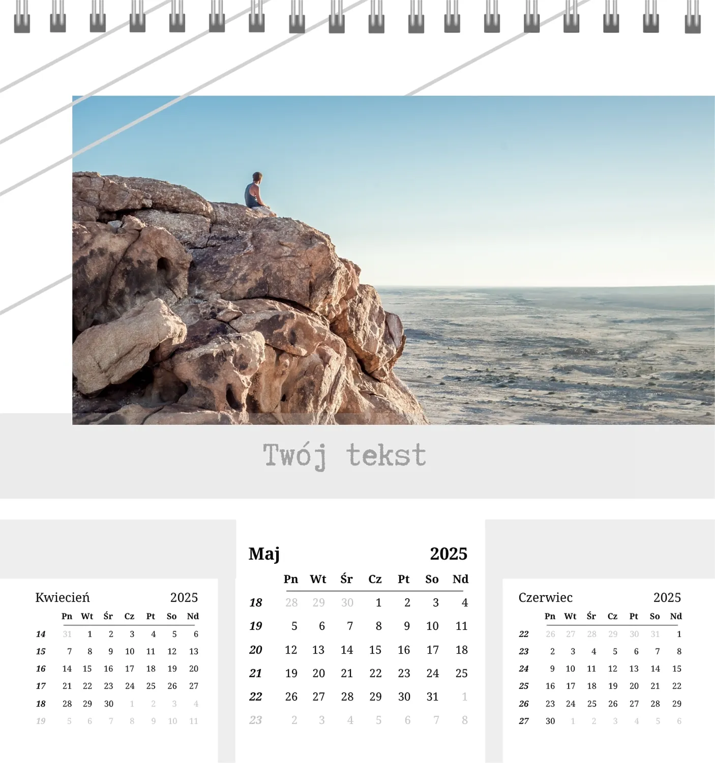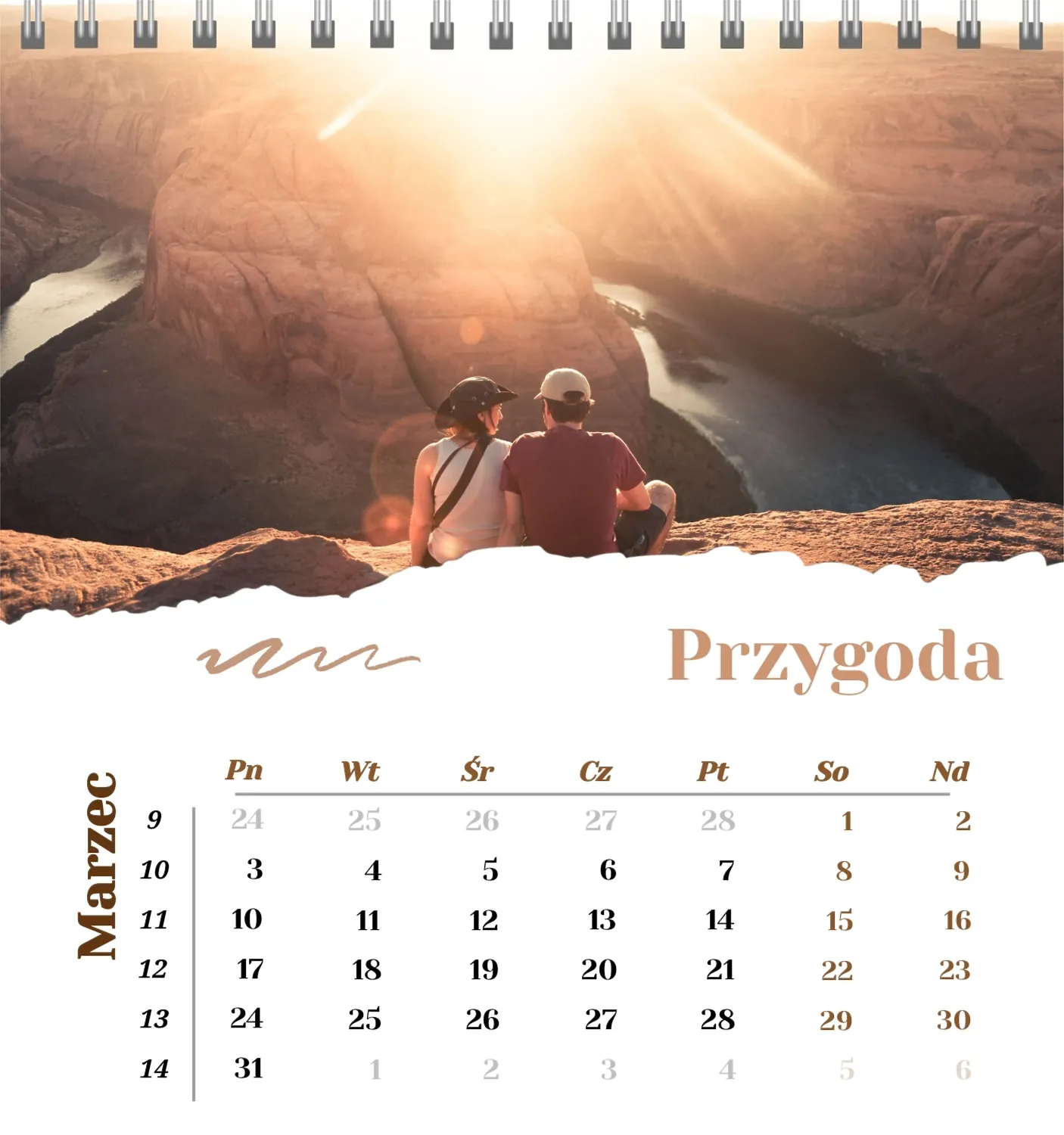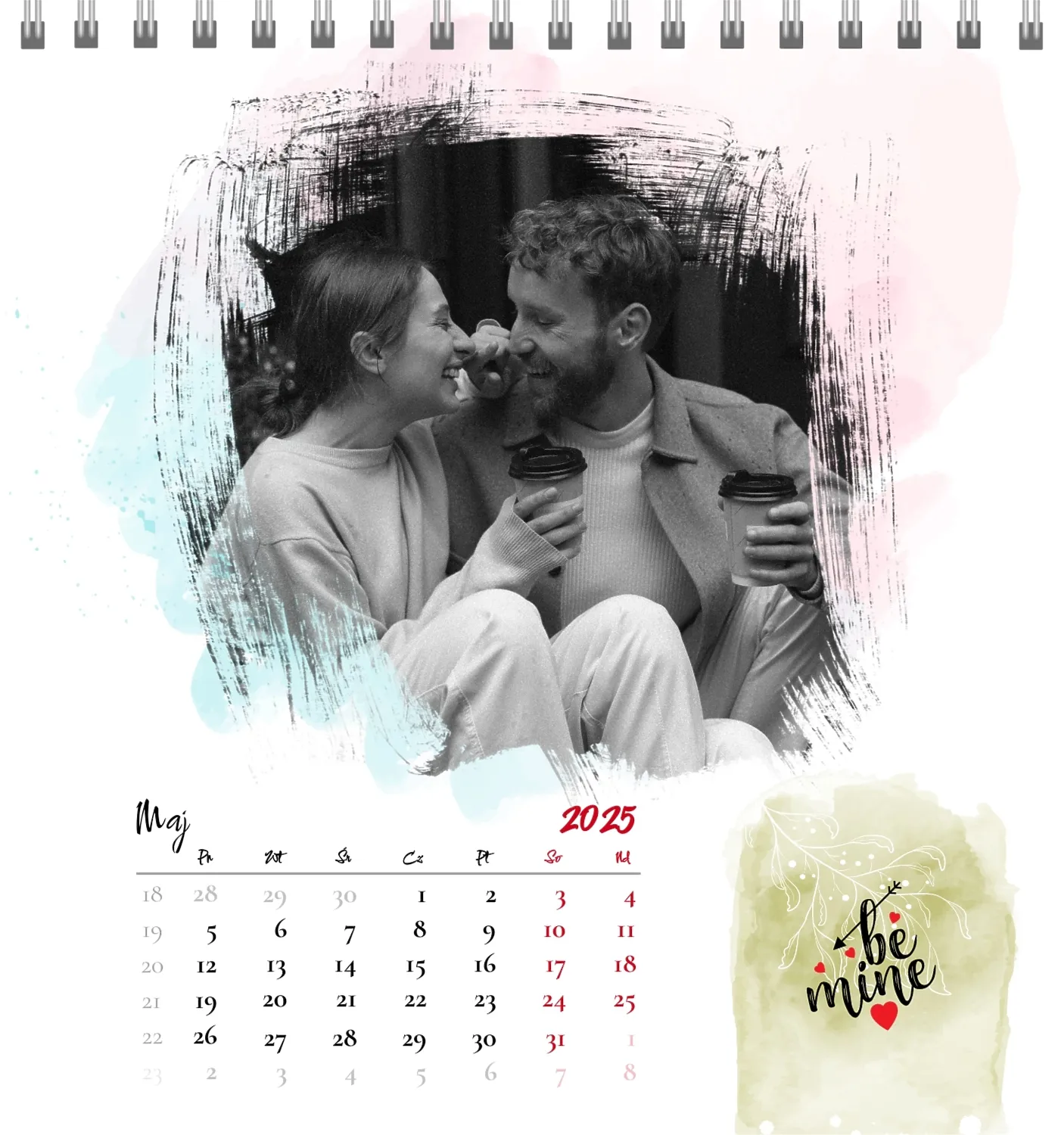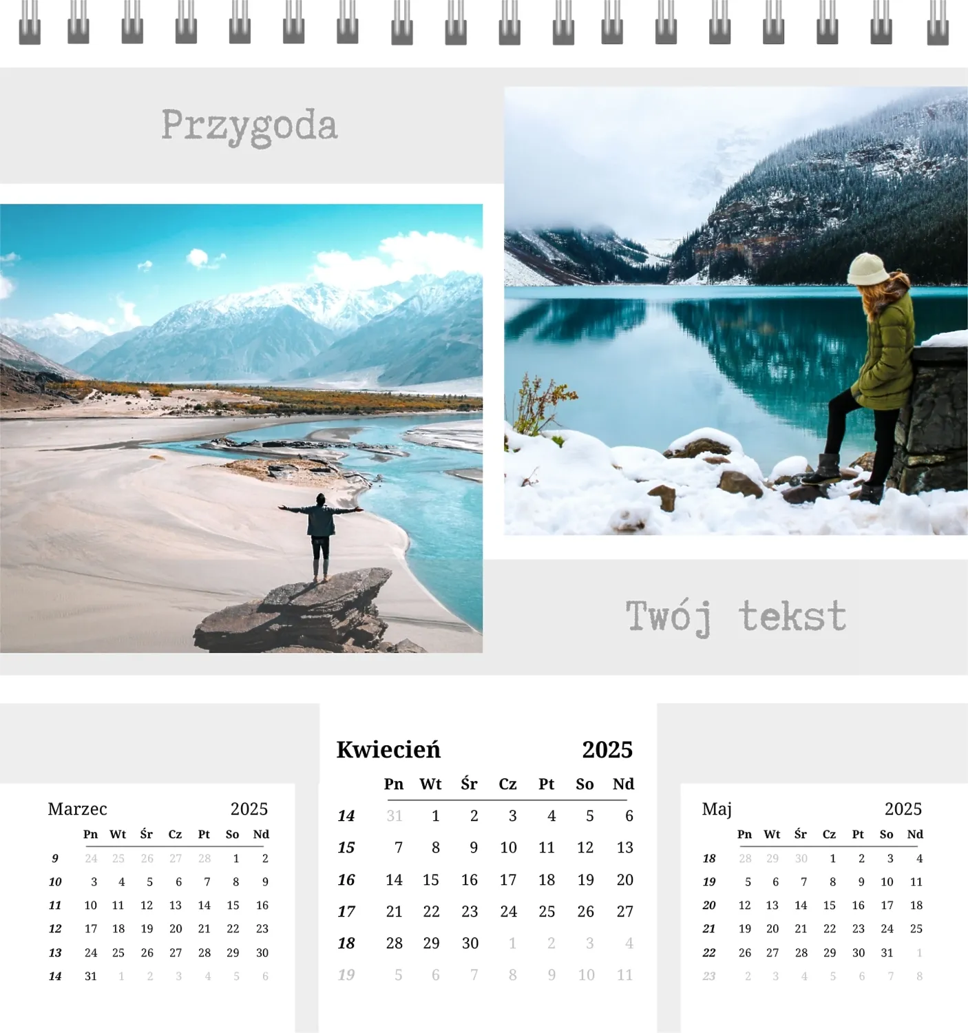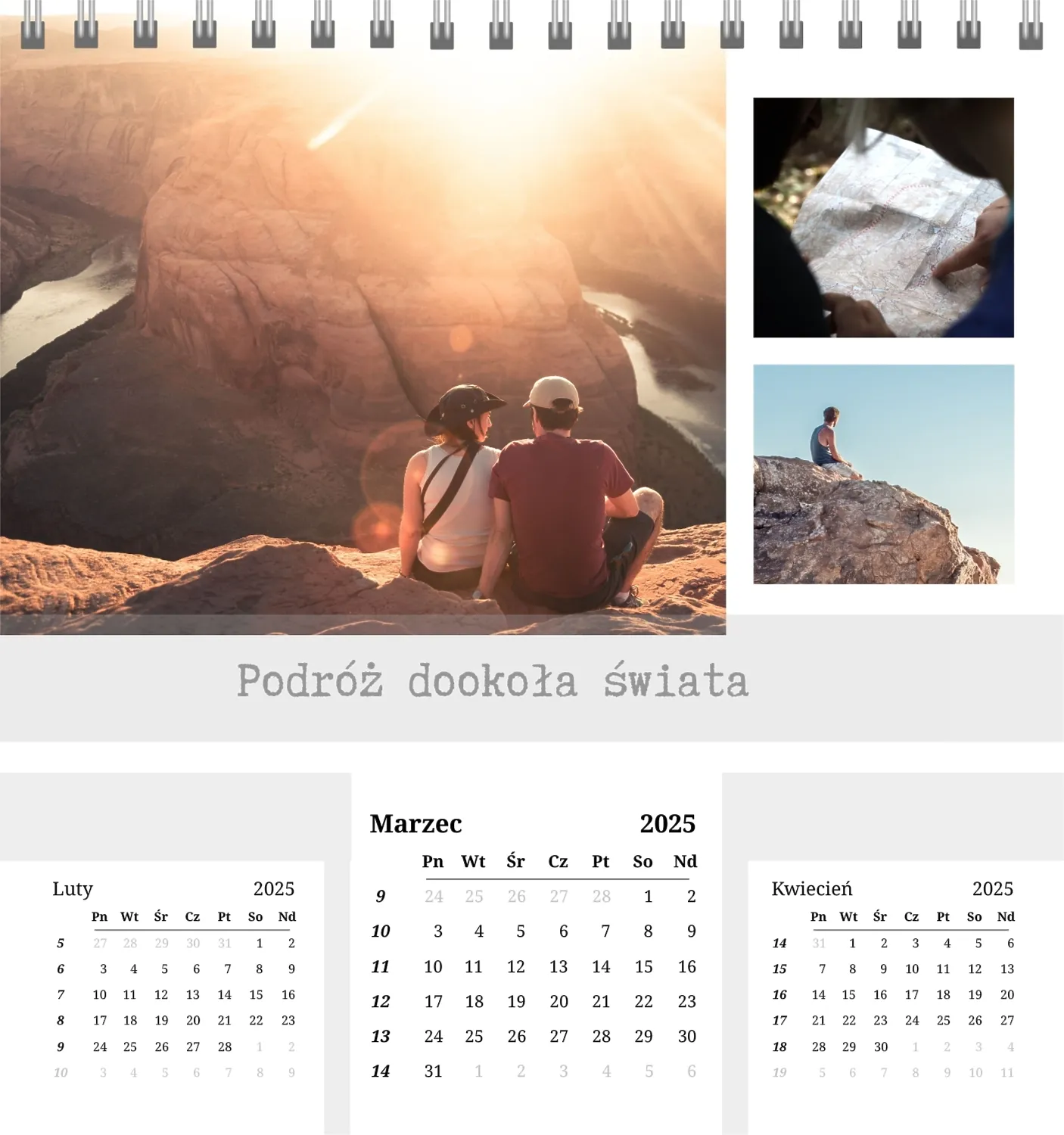 Szablon kalendarza "najlepsze wspomnienia" to idealna podstawa do stworzenia spersonalizowanego 13-stronicowego kalendarza biurkowego, który będzie odzwierciedlał najważniejsze momenty Twojego życia. Ten szablon jest odpowiedni dla każdego użytkownika, który chce podkreślić osobowość i zachować ważne wydarzenia w stylowym i funkcjonalnym formacie. Szczególnie przyda się fotografom, parom, właścicielom kreatywnych studiów lub małym firmom, które chcą stworzyć wyjątkowy produkt dla klientów lub podarować swoim bliskim coś wyjątkowego. Możesz łatwo dostosować projekt do swoich potrzeb dzięki naszemu poręcznemu kreatorowi online. Edycja pozwala zastąpić zdjęcia, dodać bloki tekstowe z ważnymi datami lub inspirującymi cytatami oraz wybrać kolorystykę, która podkreśli Twój nastrój. Kreator oferuje prosty interfejs, w którym dosłownie tworzysz unikalny kalendarz własnymi rękami, dodając osobiste akcenty i eksperymentując z elementami projektu.