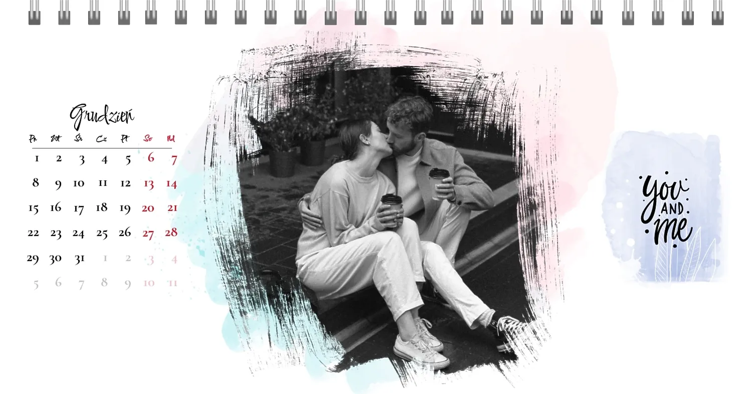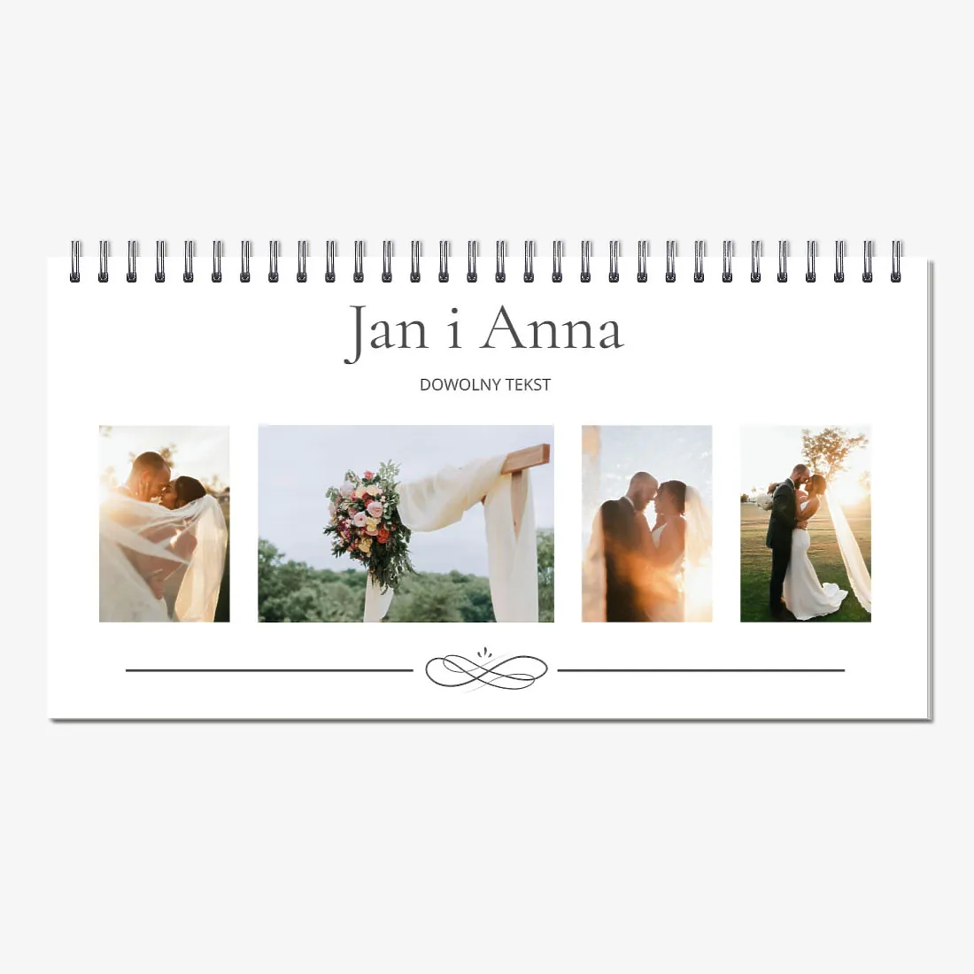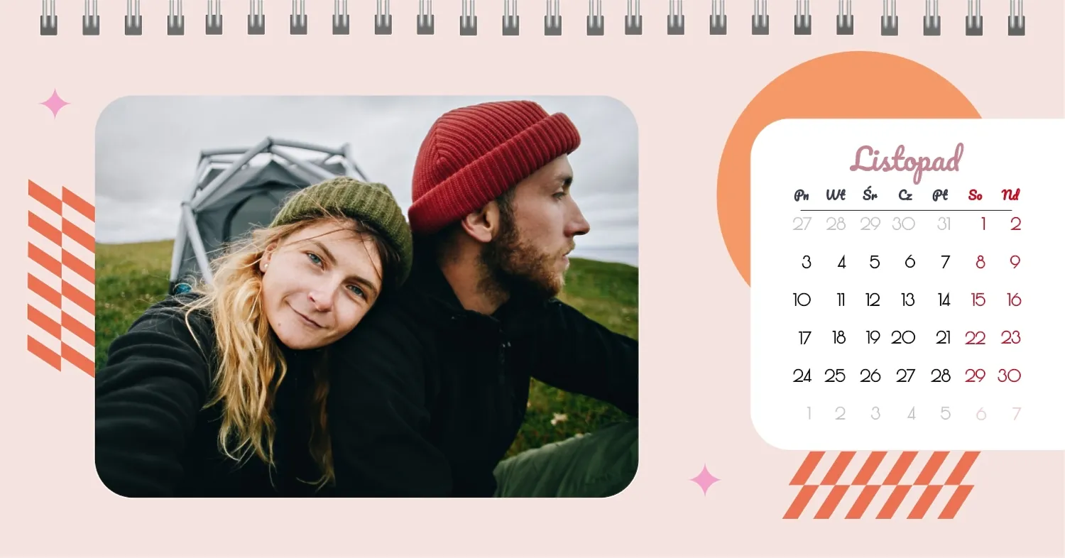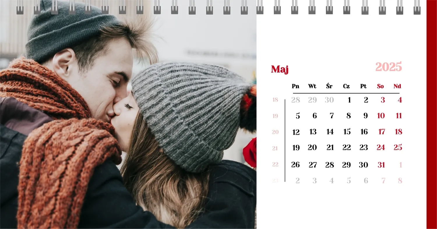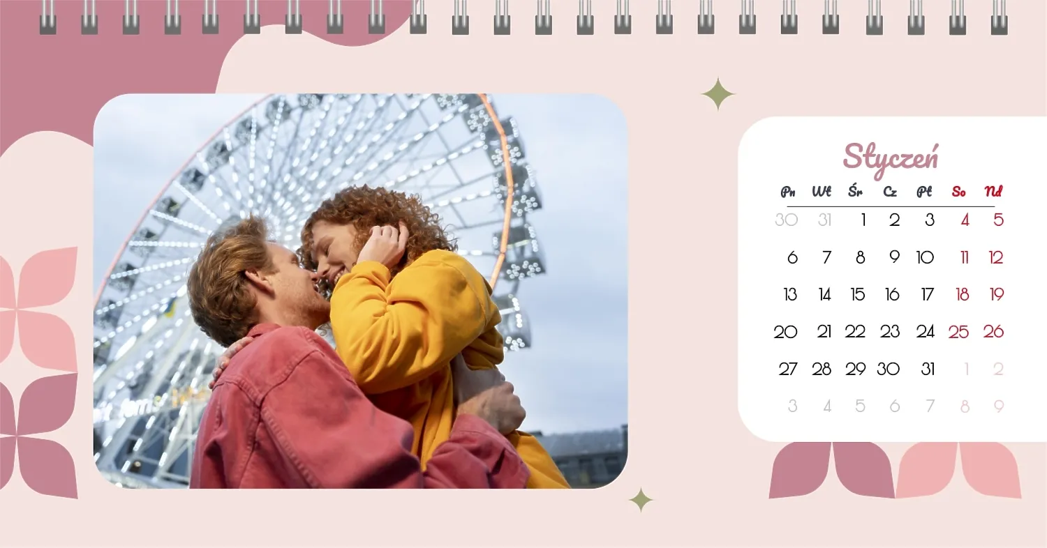 Szablon kalendarza "najlepsze wspomnienia" to idealna podstawa do stworzenia spersonalizowanego 13-stronicowego kalendarza biurkowego, który będzie odzwierciedlał najważniejsze momenty Twojego życia. Ten szablon jest odpowiedni dla każdego użytkownika, który chce podkreślić osobowość i zachować ważne wydarzenia w stylowym i funkcjonalnym formacie. Szczególnie przyda się fotografom, parom, właścicielom kreatywnych studiów lub małym firmom, które chcą stworzyć wyjątkowy produkt dla klientów lub podarować swoim bliskim coś wyjątkowego. Możesz łatwo dostosować projekt kalendarza biurkowego do swoich potrzeb dzięki naszemu poręcznemu kreatorowi online. Edycja pozwala zastąpić zdjęcia, dodać bloki tekstowe z ważnymi datami lub inspirującymi cytatami oraz wybrać kolorystykę, która podkreśli Twój nastrój. Kreator oferuje prosty interfejs, w którym dosłownie tworzysz unikalny kalendarz własnymi rękami, dodając osobiste akcenty i eksperymentując z elementami projektu.