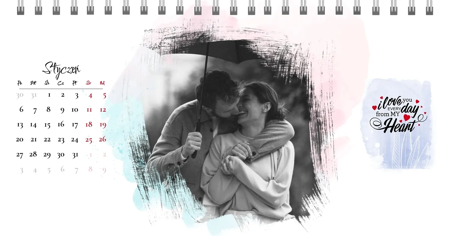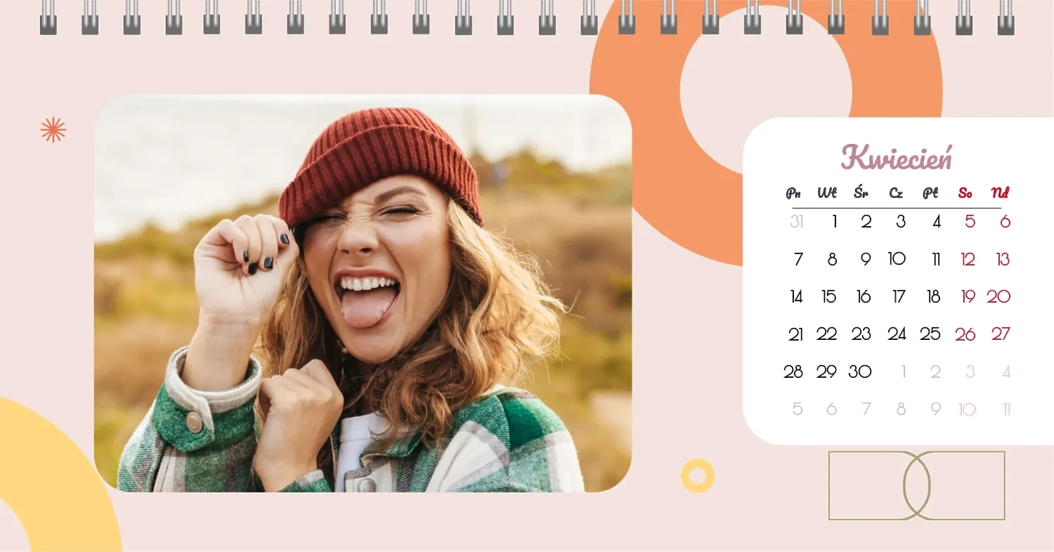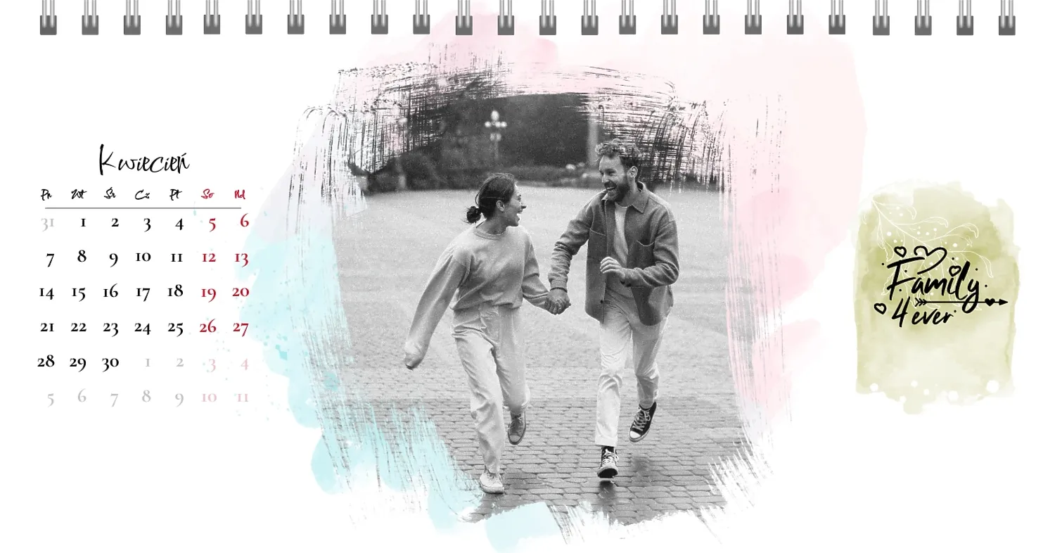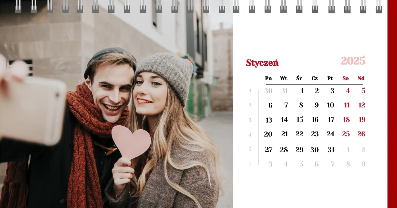 Szablon kalendarza "najlepsze wspomnienia" to idealna podstawa do stworzenia spersonalizowanego 13-stronicowego kalendarza biurkowego, który będzie odzwierciedlał najważniejsze momenty Twojego życia. Ten szablon jest odpowiedni dla każdego użytkownika, który chce podkreślić osobowość i zachować ważne wydarzenia w stylowym i funkcjonalnym formacie. Szczególnie przyda się fotografom, parom, właścicielom kreatywnych studiów lub małym firmom, które chcą stworzyć wyjątkowy produkt dla klientów lub podarować swoim bliskim coś wyjątkowego. Możesz łatwo dostosować projekt kalendarza biurkowego do swoich potrzeb dzięki naszemu poręcznemu kreatorowi online. Edycja pozwala zastąpić zdjęcia, dodać bloki tekstowe z ważnymi datami lub inspirującymi cytatami oraz wybrać kolorystykę, która podkreśli Twój nastrój. Kreator oferuje prosty interfejs, w którym dosłownie tworzysz unikalny kalendarz własnymi rękami, dodając osobiste akcenty i eksperymentując z elementami projektu.