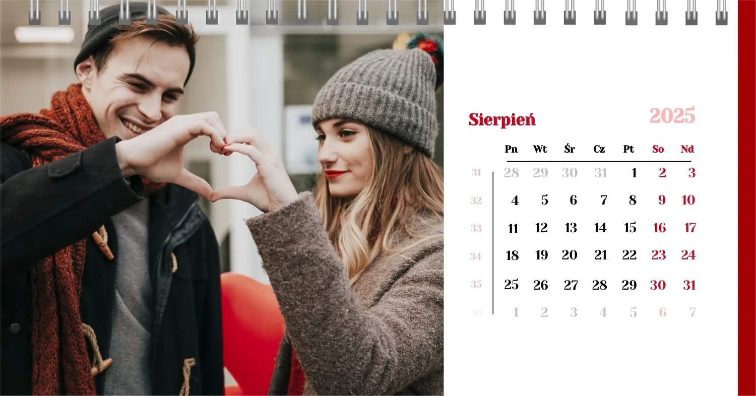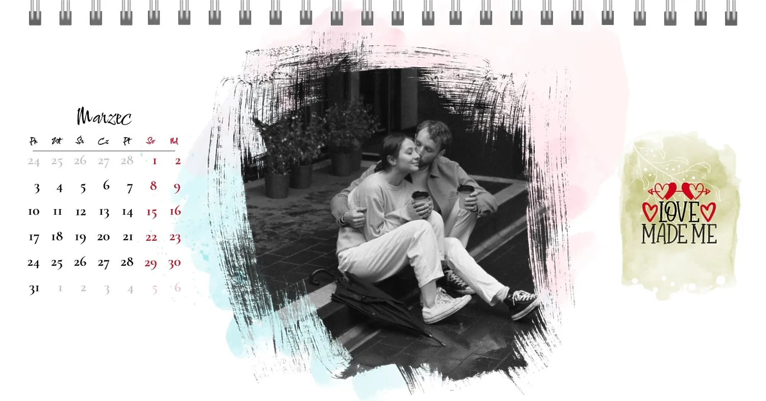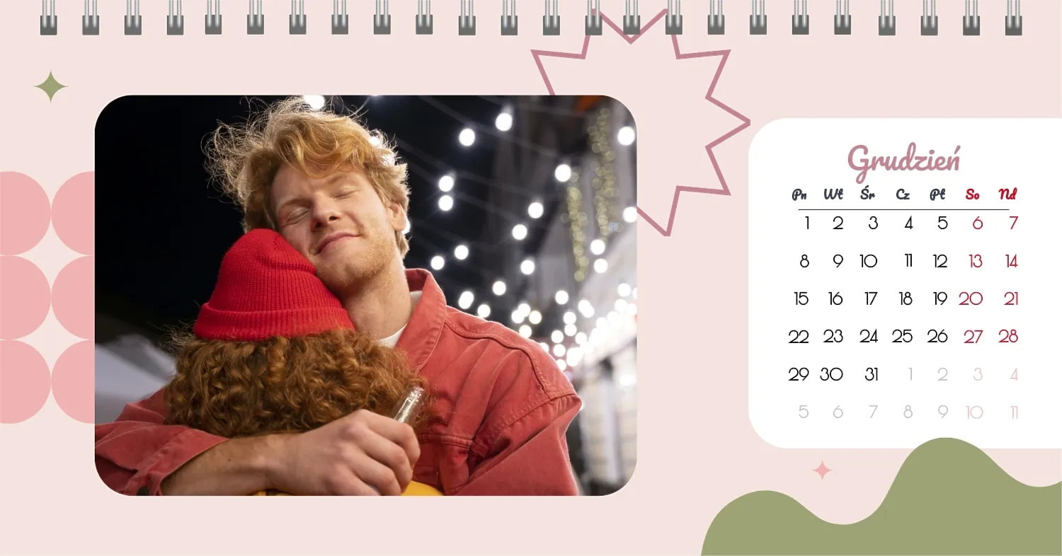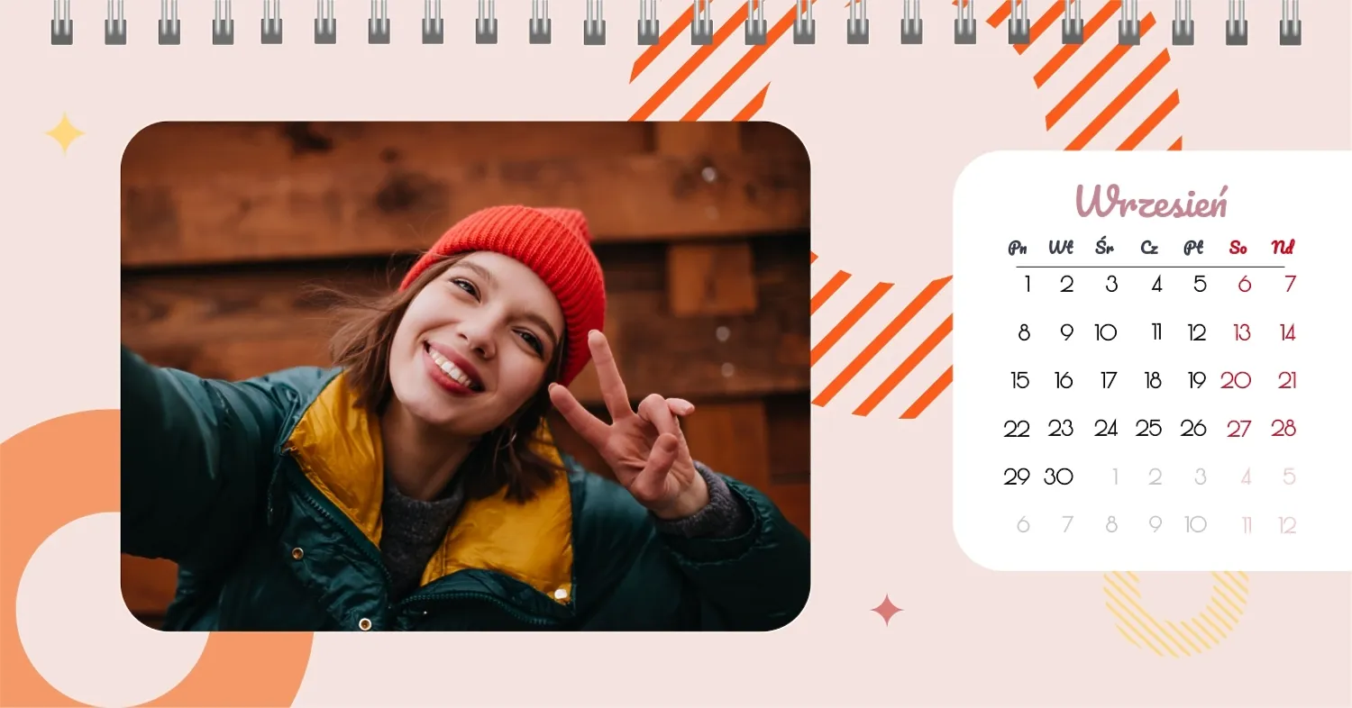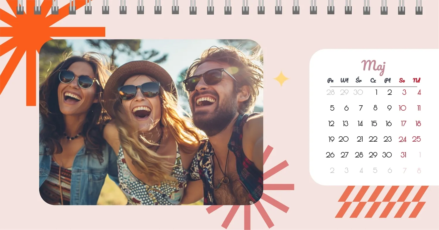 Szablon kalendarza "najlepsze wspomnienia" to idealna podstawa do stworzenia spersonalizowanego 13-stronicowego kalendarza biurkowego, który będzie odzwierciedlał najważniejsze momenty Twojego życia. Ten szablon jest odpowiedni dla każdego użytkownika, który chce podkreślić osobowość i zachować ważne wydarzenia w stylowym i funkcjonalnym formacie. Szczególnie przyda się fotografom, parom, właścicielom kreatywnych studiów lub małym firmom, które chcą stworzyć wyjątkowy produkt dla klientów lub podarować swoim bliskim coś wyjątkowego. Możesz łatwo dostosować projekt kalendarza biurkowego do swoich potrzeb dzięki naszemu poręcznemu kreatorowi online. Edycja pozwala zastąpić zdjęcia, dodać bloki tekstowe z ważnymi datami lub inspirującymi cytatami oraz wybrać kolorystykę, która podkreśli Twój nastrój. Kreator oferuje prosty interfejs, w którym dosłownie tworzysz unikalny kalendarz własnymi rękami, dodając osobiste akcenty i eksperymentując z elementami projektu.