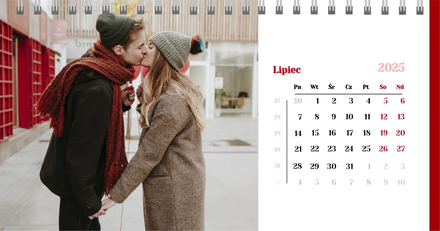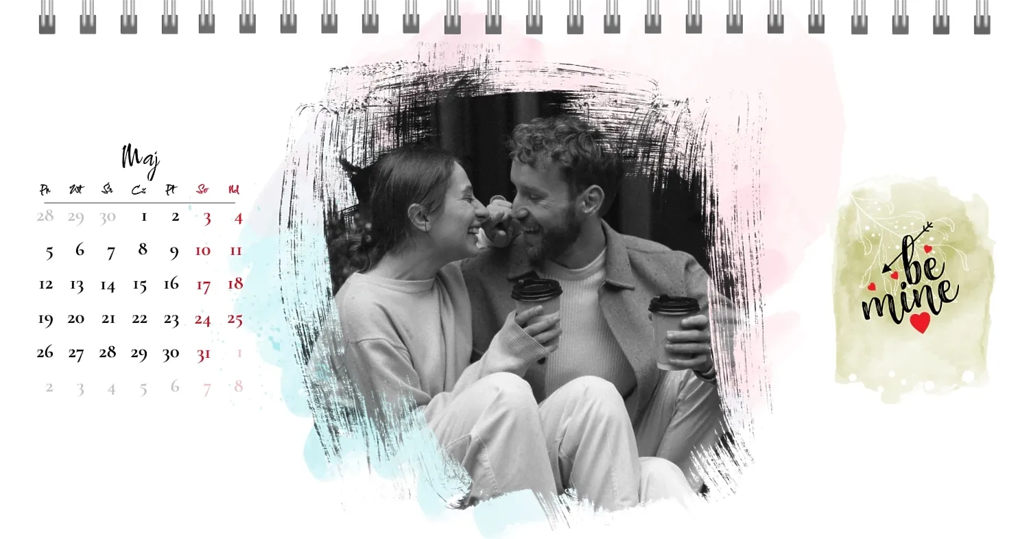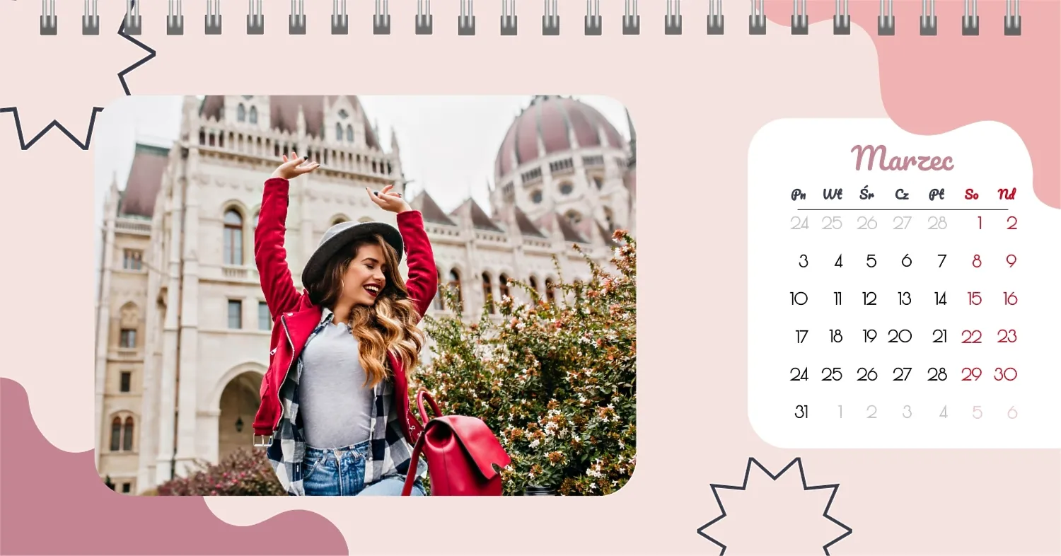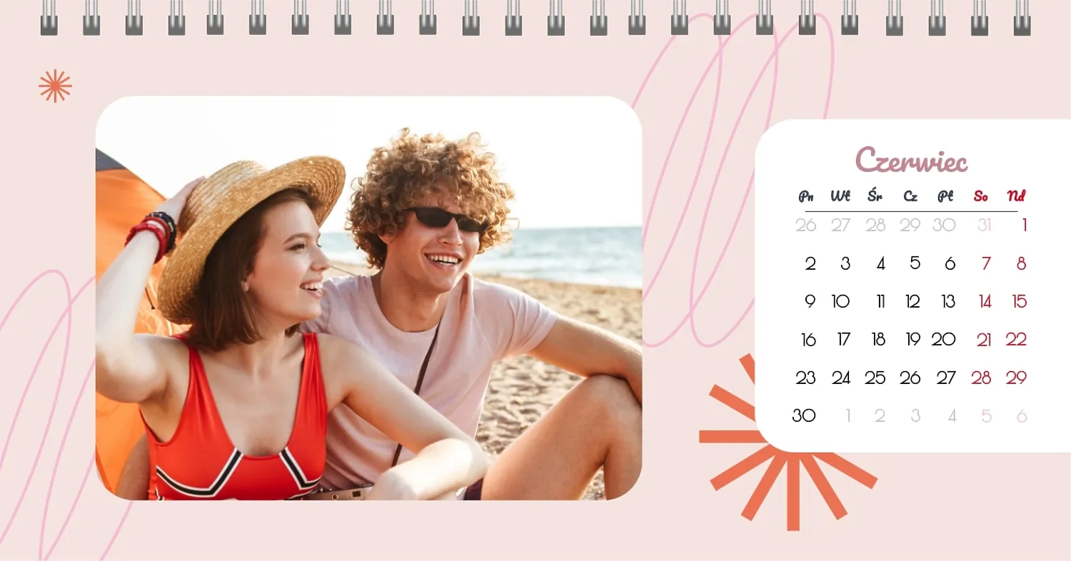 Szablon kalendarza "najlepsze wspomnienia" to idealna podstawa do stworzenia spersonalizowanego 13-stronicowego kalendarza biurkowego, który będzie odzwierciedlał najważniejsze momenty Twojego życia. Ten szablon jest odpowiedni dla każdego użytkownika, który chce podkreślić osobowość i zachować ważne wydarzenia w stylowym i funkcjonalnym formacie. Szczególnie przyda się fotografom, parom, właścicielom kreatywnych studiów lub małym firmom, które chcą stworzyć wyjątkowy produkt dla klientów lub podarować swoim bliskim coś wyjątkowego. Możesz łatwo dostosować projekt kalendarza biurkowego do swoich potrzeb dzięki naszemu poręcznemu kreatorowi online. Edycja pozwala zastąpić zdjęcia, dodać bloki tekstowe z ważnymi datami lub inspirującymi cytatami oraz wybrać kolorystykę, która podkreśli Twój nastrój. Kreator oferuje prosty interfejs, w którym dosłownie tworzysz unikalny kalendarz własnymi rękami, dodając osobiste akcenty i eksperymentując z elementami projektu.