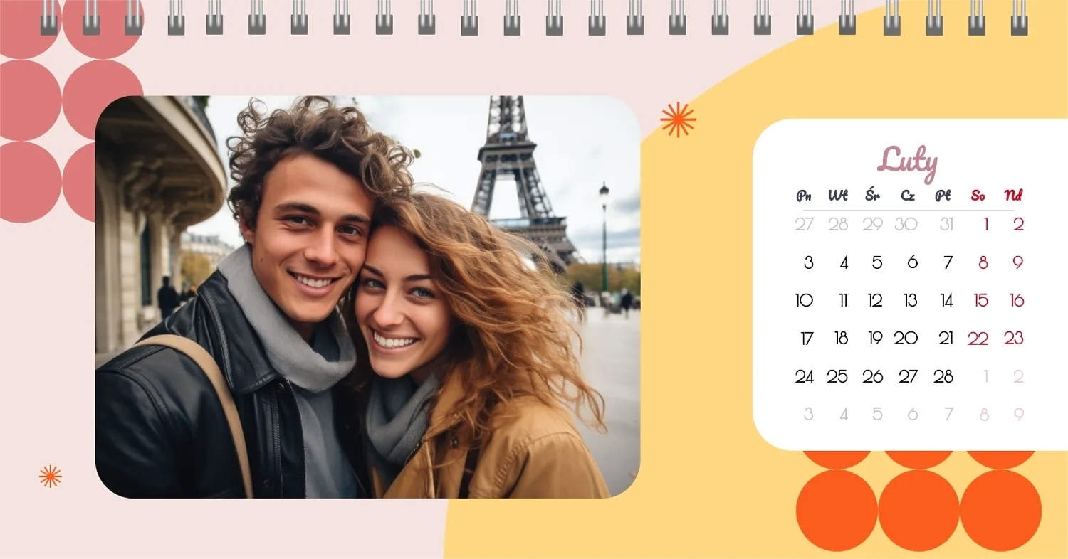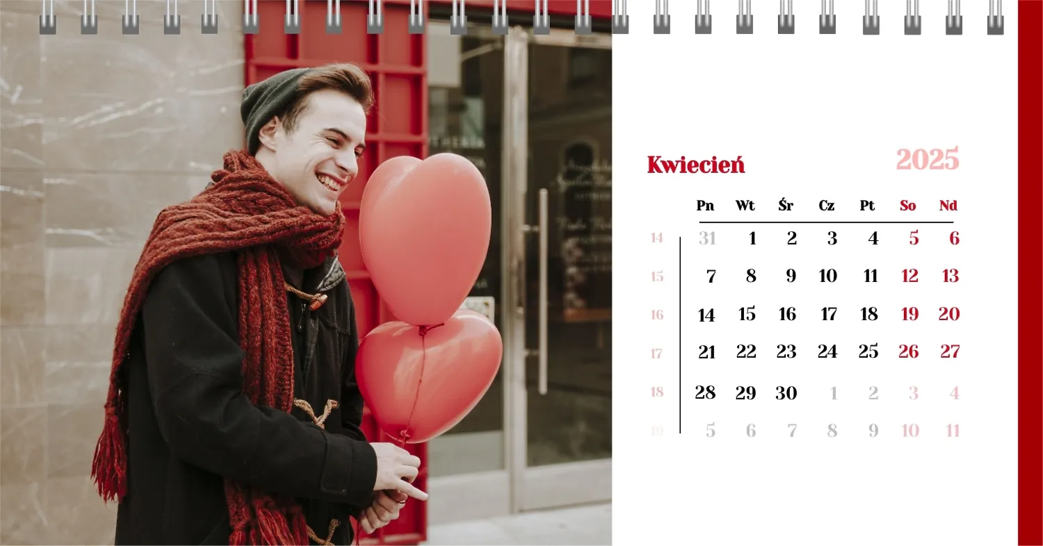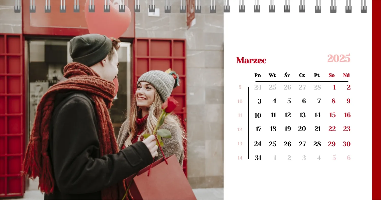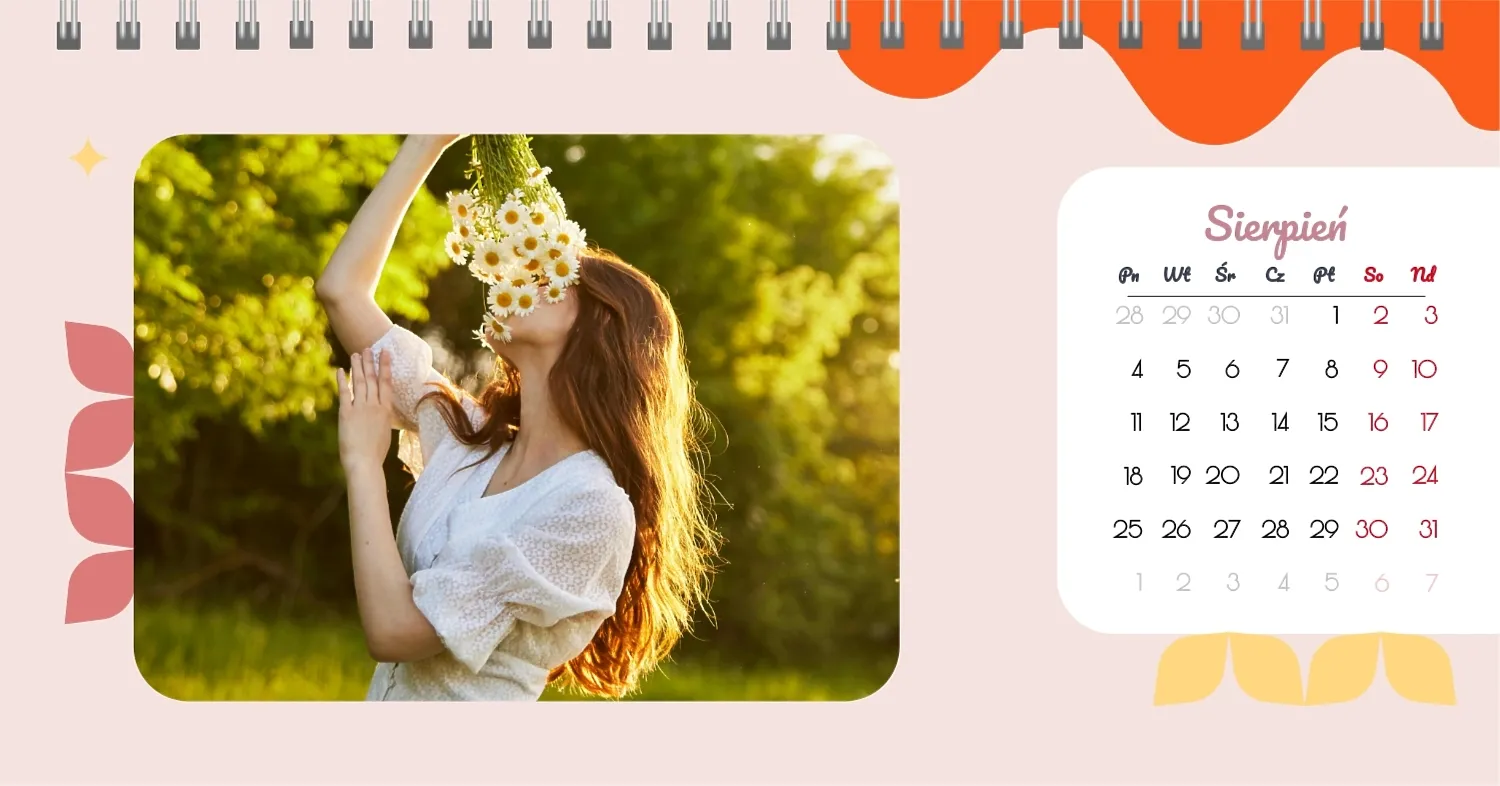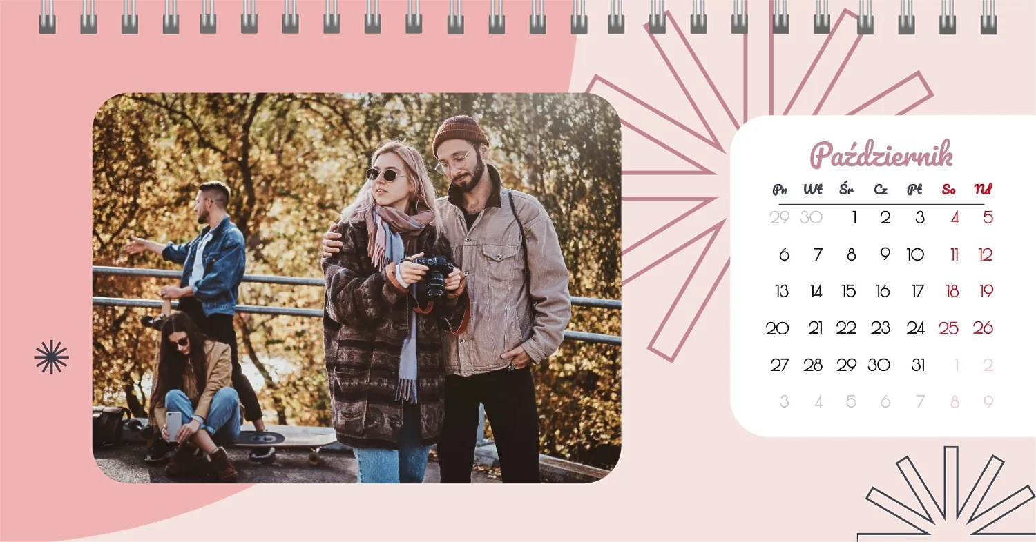 Szablon kalendarza "najlepsze wspomnienia" to idealna podstawa do stworzenia spersonalizowanego 13-stronicowego kalendarza biurkowego, który będzie odzwierciedlał najważniejsze momenty Twojego życia. Ten szablon jest odpowiedni dla każdego użytkownika, który chce podkreślić osobowość i zachować ważne wydarzenia w stylowym i funkcjonalnym formacie. Szczególnie przyda się fotografom, parom, właścicielom kreatywnych studiów lub małym firmom, które chcą stworzyć wyjątkowy produkt dla klientów lub podarować swoim bliskim coś wyjątkowego. Możesz łatwo dostosować projekt kalendarza biurkowego do swoich potrzeb dzięki naszemu poręcznemu kreatorowi online. Edycja pozwala zastąpić zdjęcia, dodać bloki tekstowe z ważnymi datami lub inspirującymi cytatami oraz wybrać kolorystykę, która podkreśli Twój nastrój. Kreator oferuje prosty interfejs, w którym dosłownie tworzysz unikalny kalendarz własnymi rękami, dodając osobiste akcenty i eksperymentując z elementami projektu.