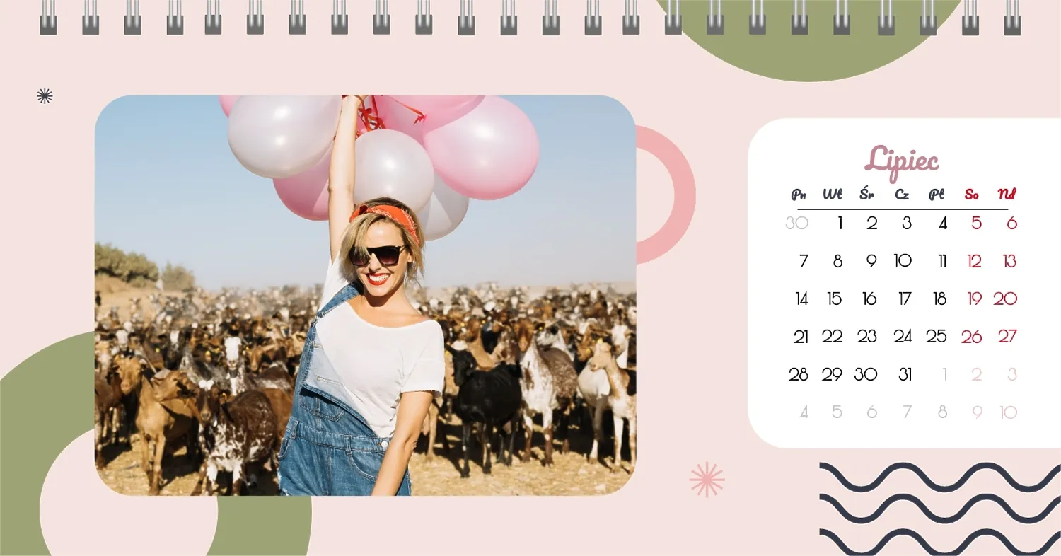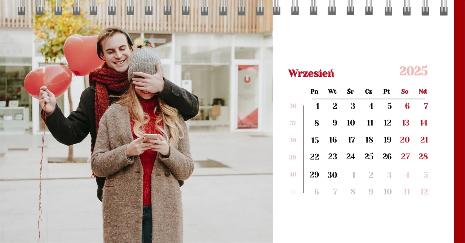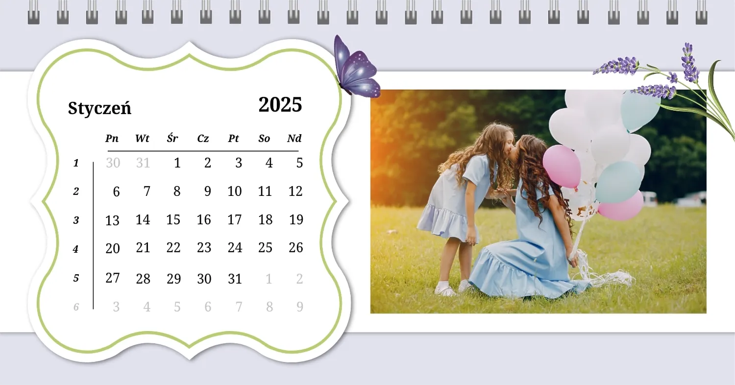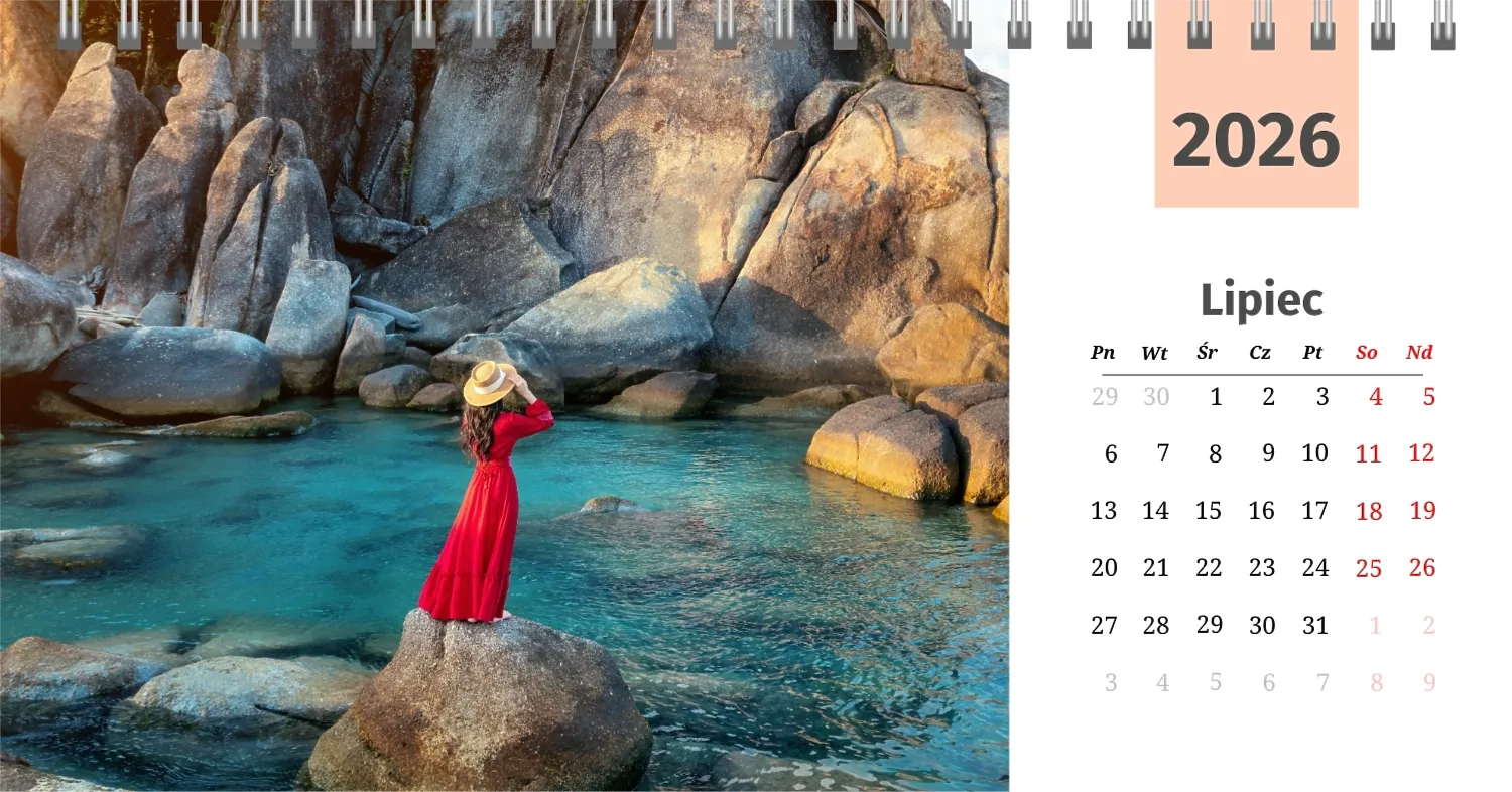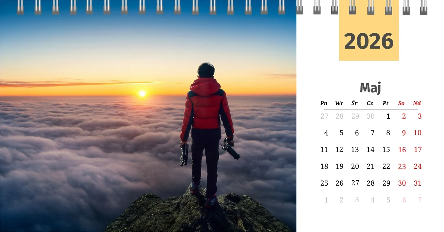Szablon kalendarza "najlepsze wspomnienia" to idealna podstawa do stworzenia spersonalizowanego 13-stronicowego kalendarza biurkowego, który będzie odzwierciedlał najważniejsze momenty Twojego życia. Ten szablon jest odpowiedni dla każdego użytkownika, który chce podkreślić osobowość i zachować ważne wydarzenia w stylowym i funkcjonalnym formacie. Szczególnie przyda się fotografom, parom, właścicielom kreatywnych studiów lub małym firmom, które chcą stworzyć wyjątkowy produkt dla klientów lub podarować swoim bliskim coś wyjątkowego. Możesz łatwo dostosować projekt kalendarza biurkowego do swoich potrzeb dzięki naszemu poręcznemu kreatorowi online. Edycja pozwala zastąpić zdjęcia, dodać bloki tekstowe z ważnymi datami lub inspirującymi cytatami oraz wybrać kolorystykę, która podkreśli Twój nastrój. Kreator oferuje prosty interfejs, w którym dosłownie tworzysz unikalny kalendarz własnymi rękami, dodając osobiste akcenty i eksperymentując z elementami projektu.