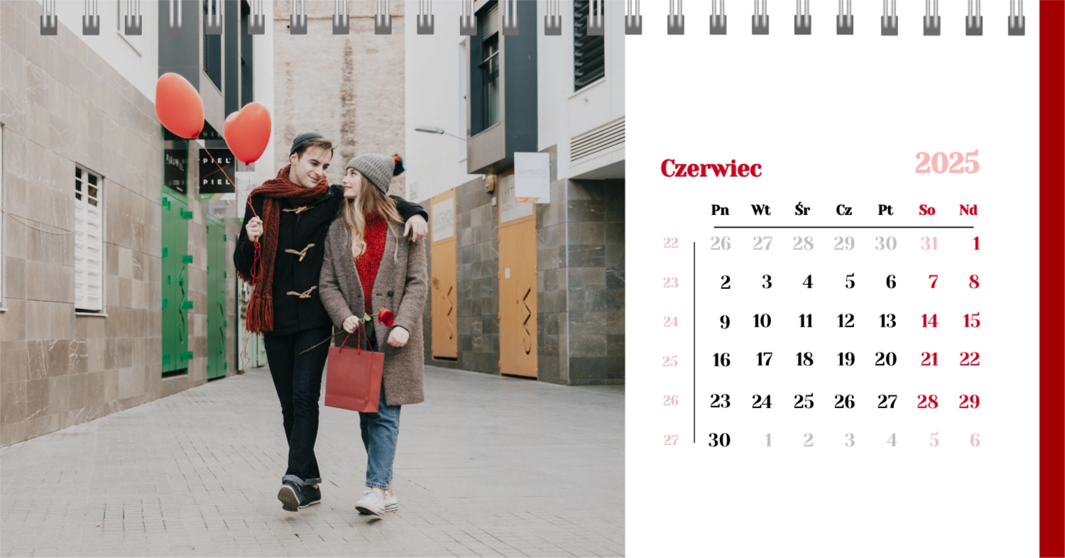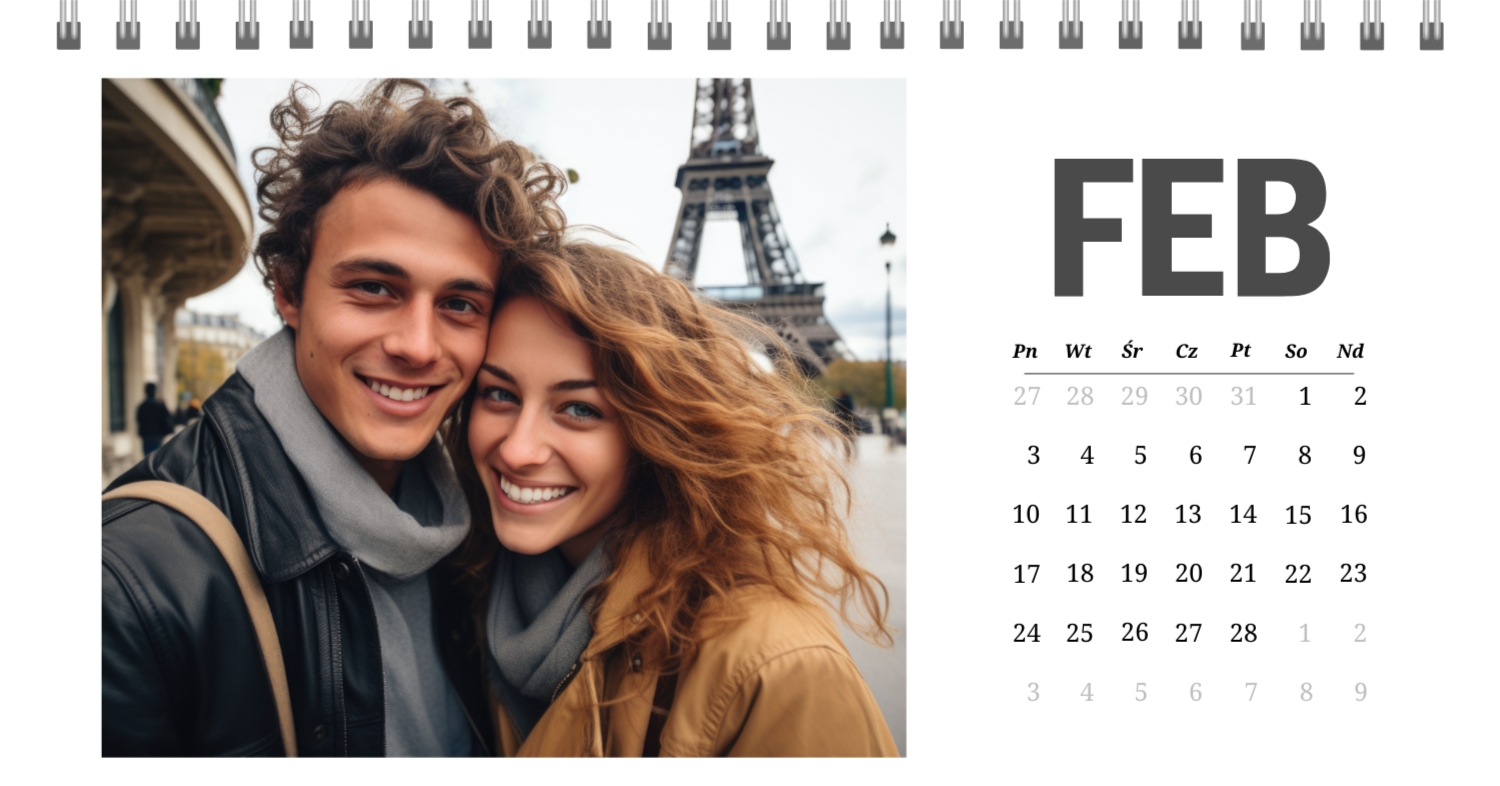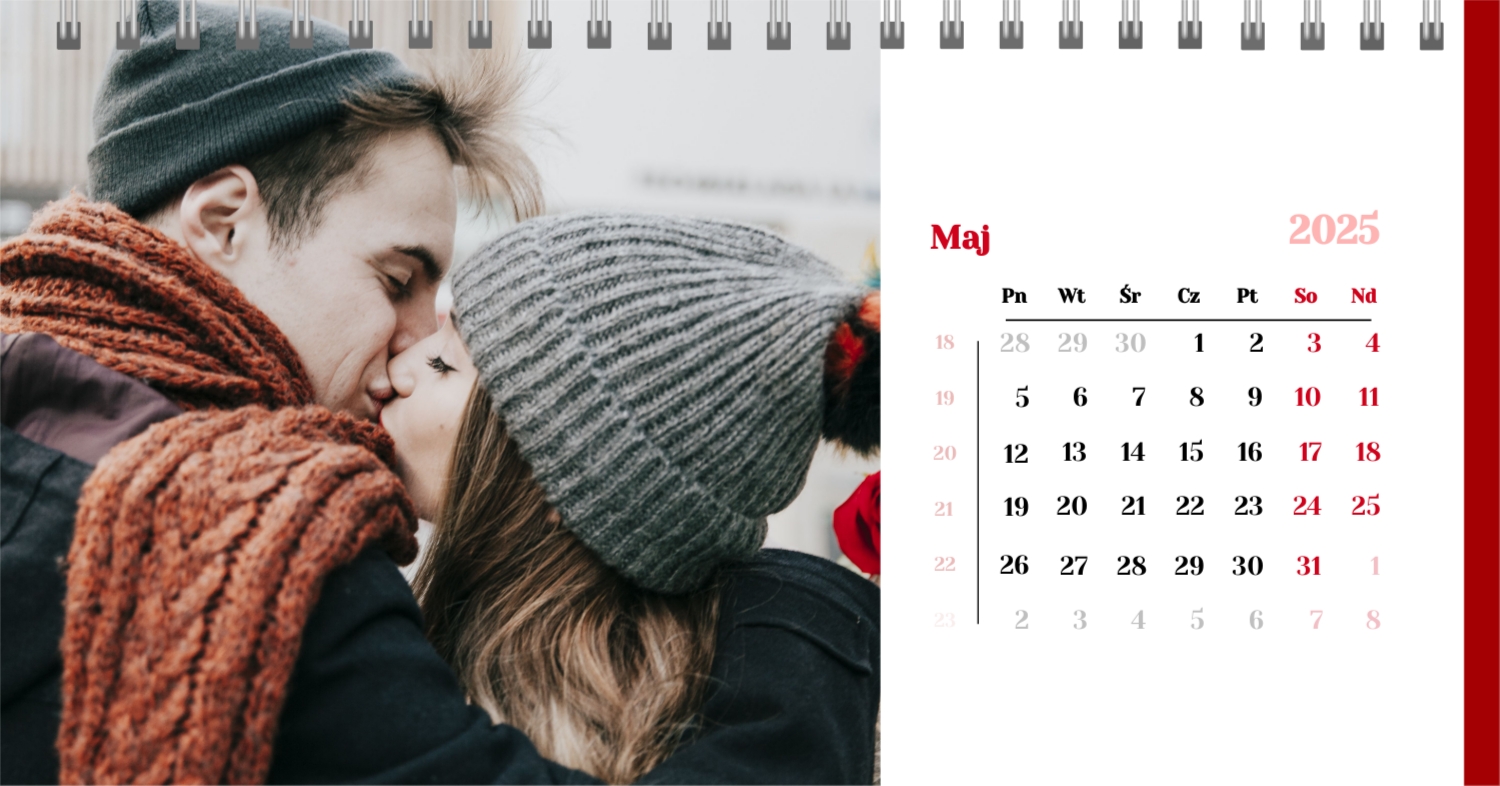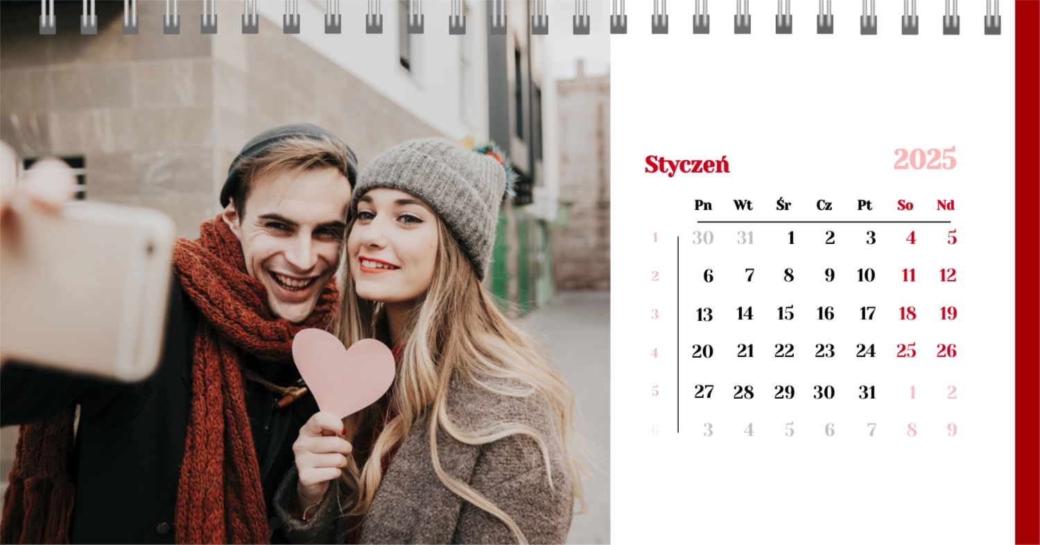 Szablon kalendarza "najlepsze wspomnienia" to idealna podstawa do stworzenia spersonalizowanego 13-stronicowego kalendarza biurkowego, który będzie odzwierciedlał najważniejsze momenty Twojego życia. Ten szablon jest odpowiedni dla każdego użytkownika, który chce podkreślić osobowość i zachować ważne wydarzenia w stylowym i funkcjonalnym formacie. Szczególnie przyda się fotografom, parom, właścicielom kreatywnych studiów lub małym firmom, które chcą stworzyć wyjątkowy produkt dla klientów lub podarować swoim bliskim coś wyjątkowego. Możesz łatwo dostosować projekt kalendarza biurkowego do swoich potrzeb dzięki naszemu poręcznemu kreatorowi online. Edycja pozwala zastąpić zdjęcia, dodać bloki tekstowe z ważnymi datami lub inspirującymi cytatami oraz wybrać kolorystykę, która podkreśli Twój nastrój. Kreator oferuje prosty interfejs, w którym dosłownie tworzysz unikalny kalendarz własnymi rękami, dodając osobiste akcenty i eksperymentując z elementami projektu.