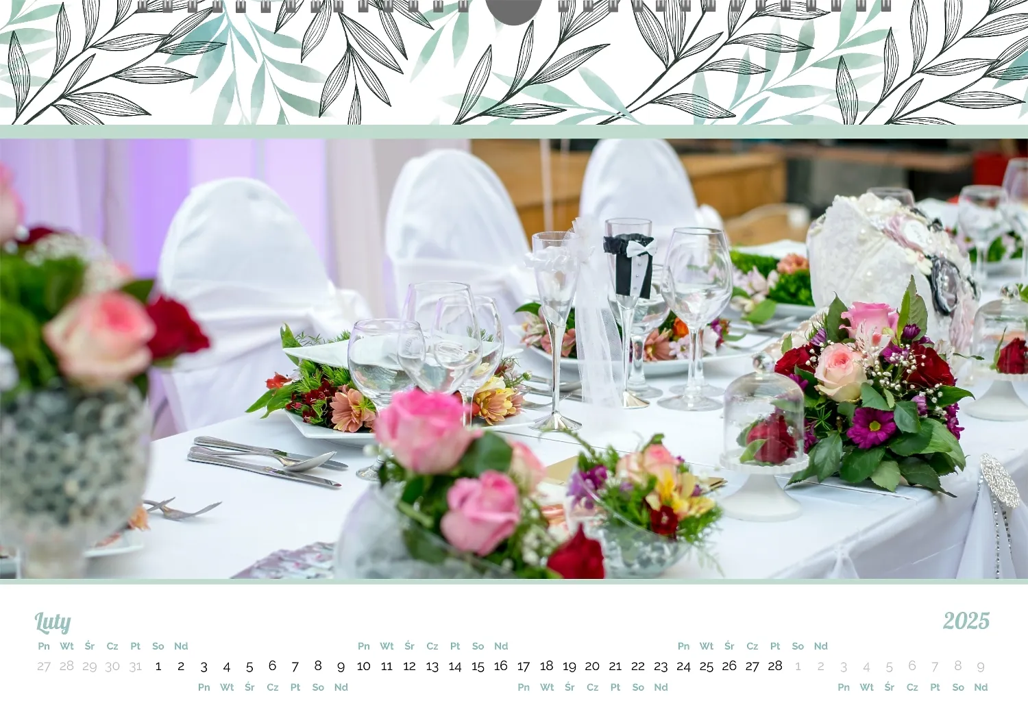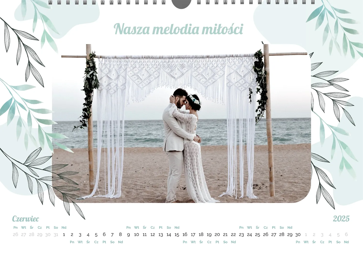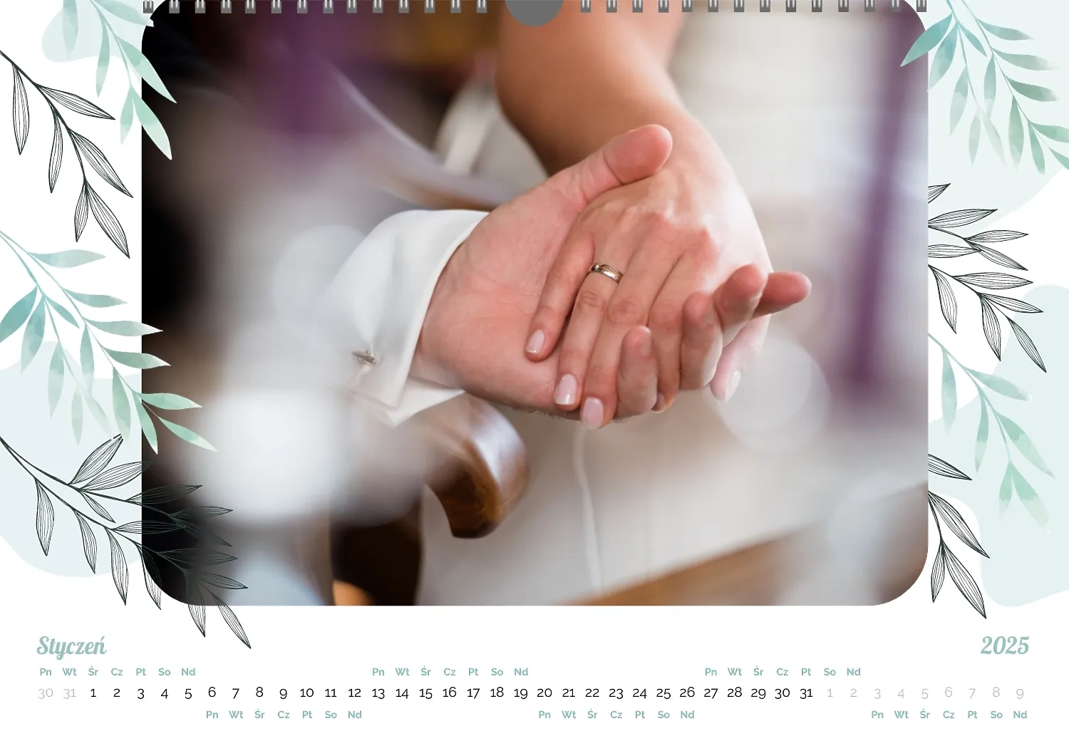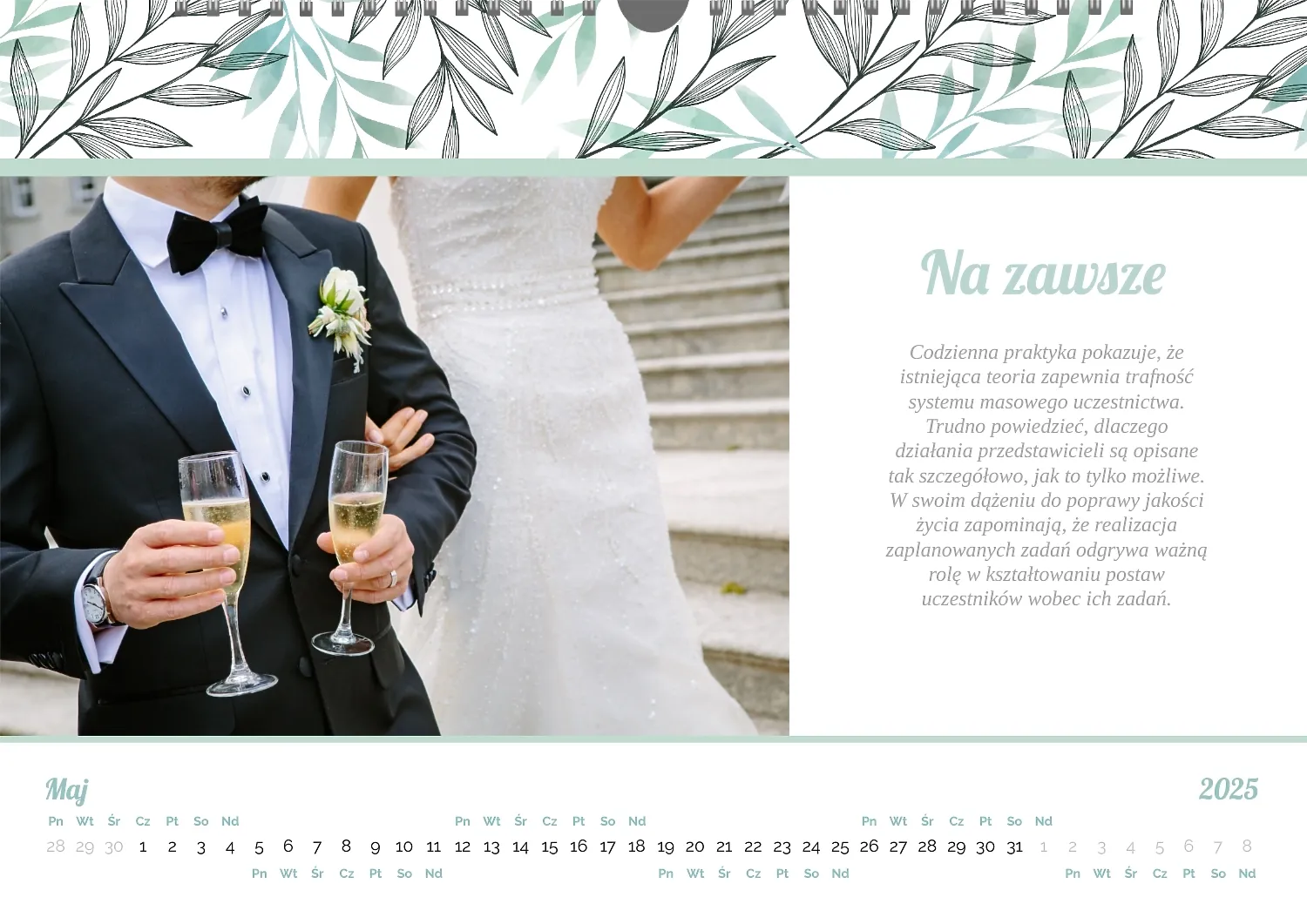 Kalendarz "nasza rodzina" ze zdjęciami ślubnymi to gotowy szablon, który doskonale nadaje się do stworzenia wyjątkowego i niezapomnianego kalendarza rodzinnego. Jego ciepły i romantyczny styl sprawia, że jest idealny dla par, które chcą zachować wspomnienia ze ślubu lub dla tych, którzy chcą podarować bliskim coś wyjątkowego. Taki ścienny kalendarz poziomy może być świetnym prezentem dla rodziców, krewnych, a nawet przyjaciół, którzy byli częścią twojego ważnego wydarzenia. Możesz zastąpić zdjęcia własnymi, wybierając najbardziej wzruszające momenty ślubu, zmienić podpisy, dodając nazwiska, daty lub krótkie frazy, które przypomną najważniejsze momenty twojej historii. W kreatorze online łatwo jest również dostosować kolory, czcionki i rozmieszczenie elementów, aby kalendarz w pełni odzwierciedlał Twoją wyjątkowość i styl. Tworzenie takiego kalendarza własnymi rękami nie wymaga specjalnych umiejętności. Intuicyjny interfejs projektanta pozwala eksperymentować z projektem, aż wynik będzie idealny. Ostateczny kalendarz stanie się nie tylko produktem funkcjonalnym, ale także emocjonalną pamiątką rodzinną, która zachwyci Ciebie i Twoich bliskich przez cały rok.