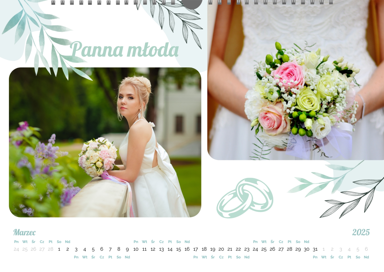 Kalendarz "nasza rodzina" ze zdjęciami ślubnymi to gotowy szablon, który doskonale nadaje się do stworzenia wyjątkowego i niezapomnianego kalendarza rodzinnego. Jego ciepły i romantyczny styl sprawia, że jest idealny dla par, które chcą zachować wspomnienia ze ślubu lub dla tych, którzy chcą podarować bliskim coś wyjątkowego. Taki ścienny kalendarz poziomy może być świetnym prezentem dla rodziców, krewnych, a nawet przyjaciół, którzy byli częścią twojego ważnego wydarzenia. Możesz zastąpić zdjęcia własnymi, wybierając najbardziej wzruszające momenty ślubu, zmienić podpisy, dodając nazwiska, daty lub krótkie frazy, które przypomną najważniejsze momenty twojej historii. W kreatorze online łatwo jest również dostosować kolory, czcionki i rozmieszczenie elementów, aby kalendarz w pełni odzwierciedlał Twoją wyjątkowość i styl. Tworzenie takiego kalendarza własnymi rękami nie wymaga specjalnych umiejętności. Intuicyjny interfejs projektanta pozwala eksperymentować z projektem, aż wynik będzie idealny. Ostateczny kalendarz stanie się nie tylko produktem funkcjonalnym, ale także emocjonalną pamiątką rodzinną, która zachwyci Ciebie i Twoich bliskich przez cały rok.