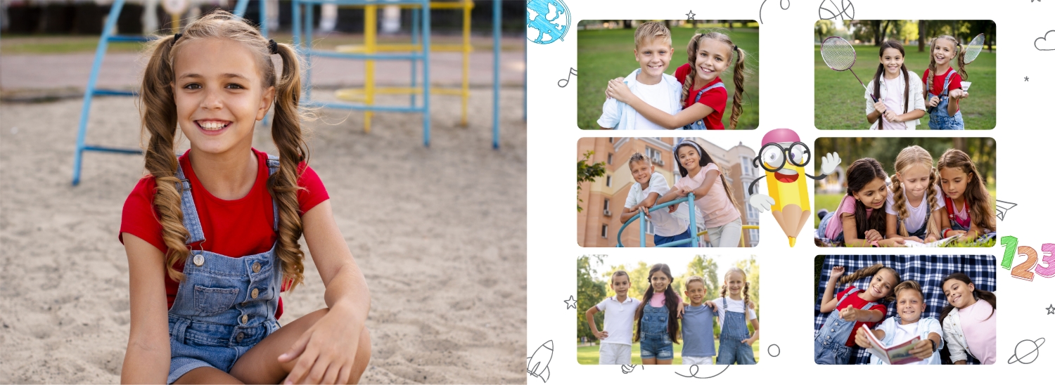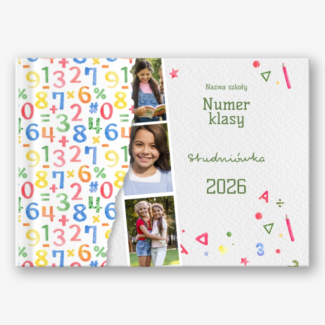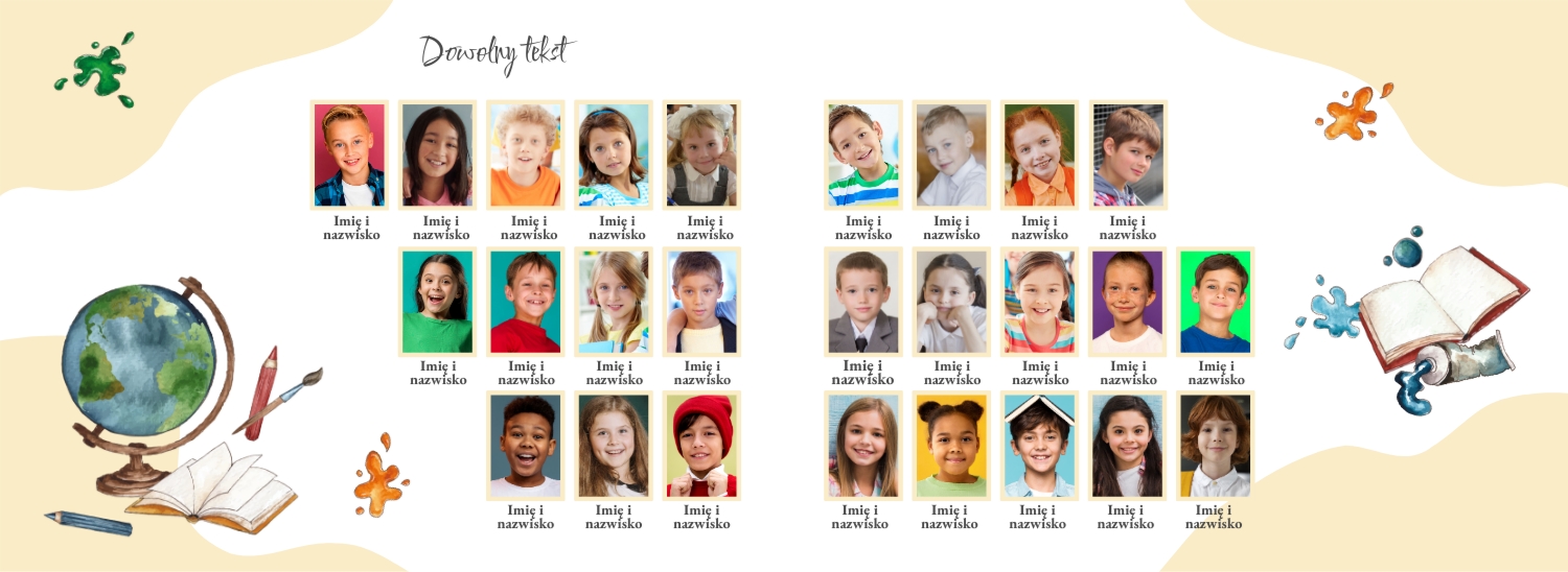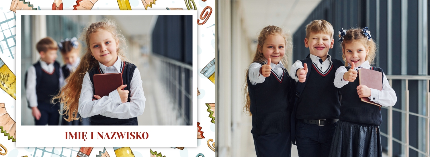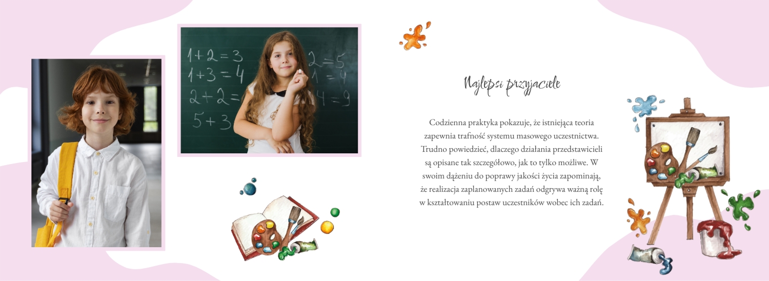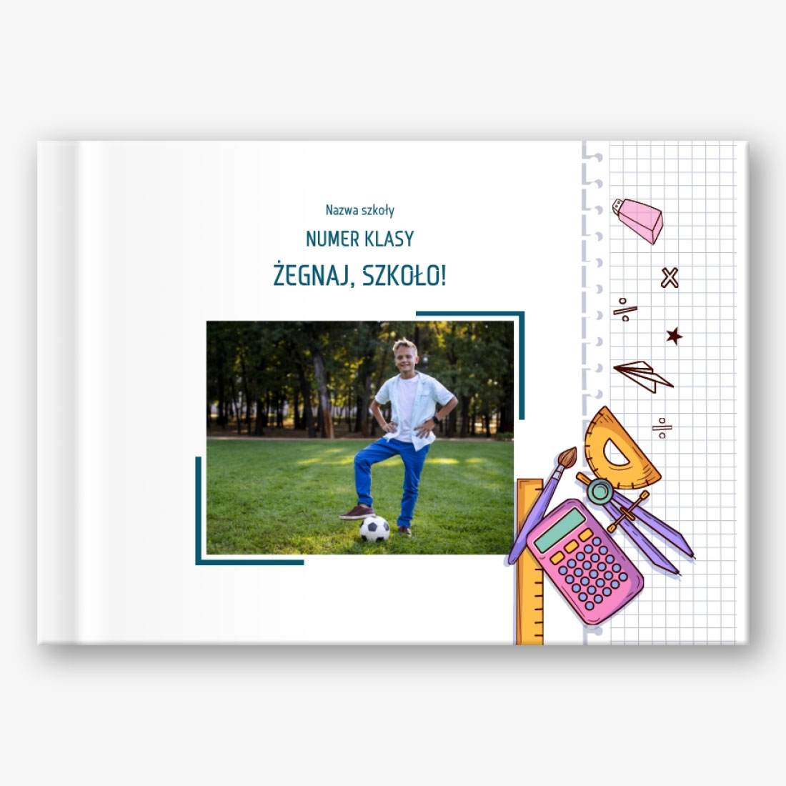 Gotowy szablon książki fotograficznej w twardej oprawie dla gimnazjum to kolorowa i wzruszająca dekoracja, która pomoże zachować najcieplejsze wspomnienia z pierwszych lat szkolnych. Projekt szablonu został stworzony z myślą o tematyce dziecięcej: jasne ilustracje, delikatne kolory, elementy przypominające życie szkolne – książki, ołówki, tablice do pisania. W kreatorze online ten szablon można łatwo zmodyfikować, aby był wyjątkowy. Użytkownik może dodawać i przenosić zdjęcia, zmieniać czcionki, edytować bloki tekstowe z życzeniami i podpisami, a także zastępować elementy dekoracyjne bardziej odpowiednimi stylowo.