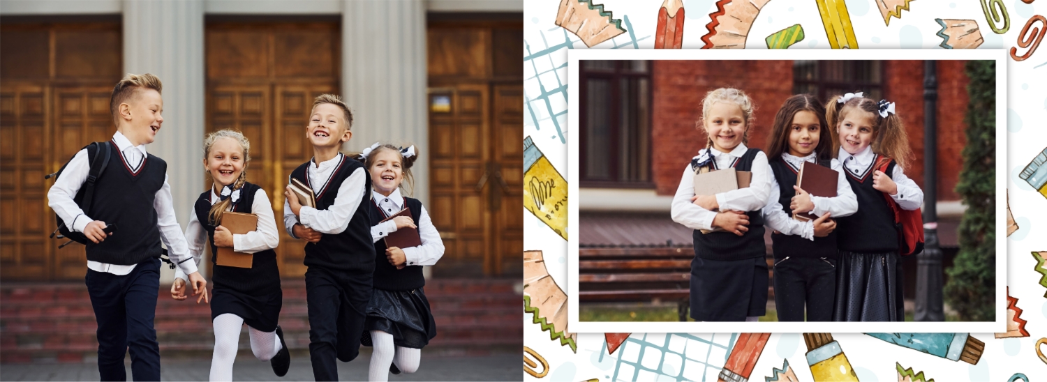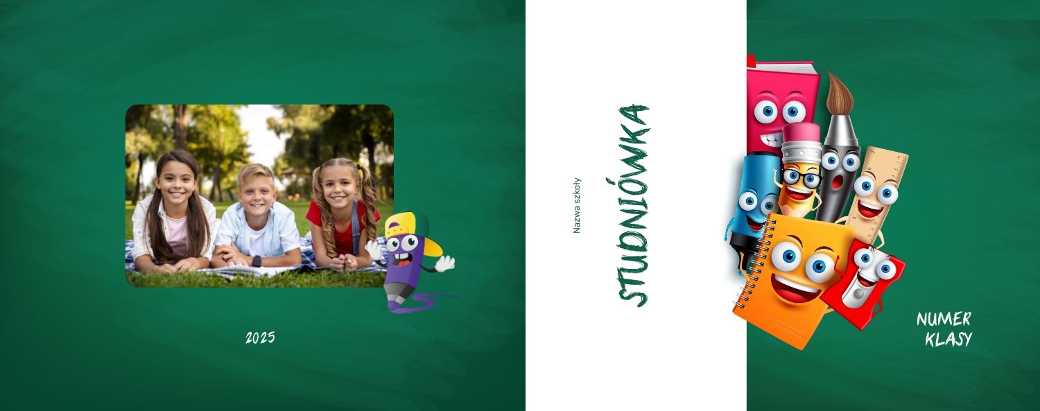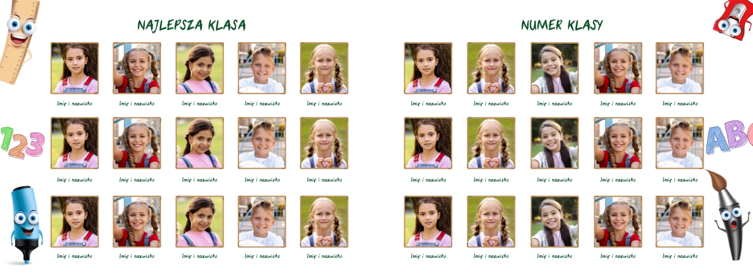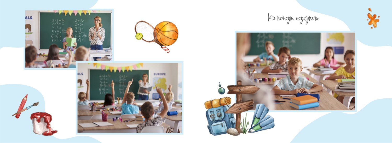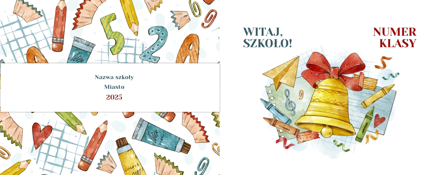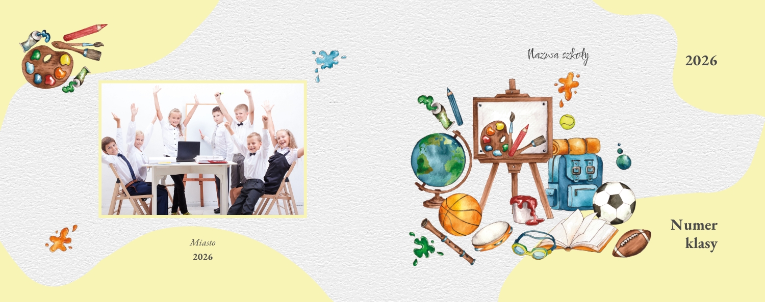 Gotowy szablon książki fotograficznej w twardej oprawie dla gimnazjum to kolorowa i wzruszająca dekoracja, która pomoże zachować najcieplejsze wspomnienia z pierwszych lat szkolnych. Projekt szablonu został stworzony z myślą o tematyce dziecięcej: jasne ilustracje, delikatne kolory, elementy przypominające życie szkolne – książki, ołówki, tablice do pisania. W kreatorze online ten szablon można łatwo zmodyfikować, aby był wyjątkowy. Użytkownik może dodawać i przenosić zdjęcia, zmieniać czcionki, edytować bloki tekstowe z życzeniami i podpisami, a także zastępować elementy dekoracyjne bardziej odpowiednimi stylowo.