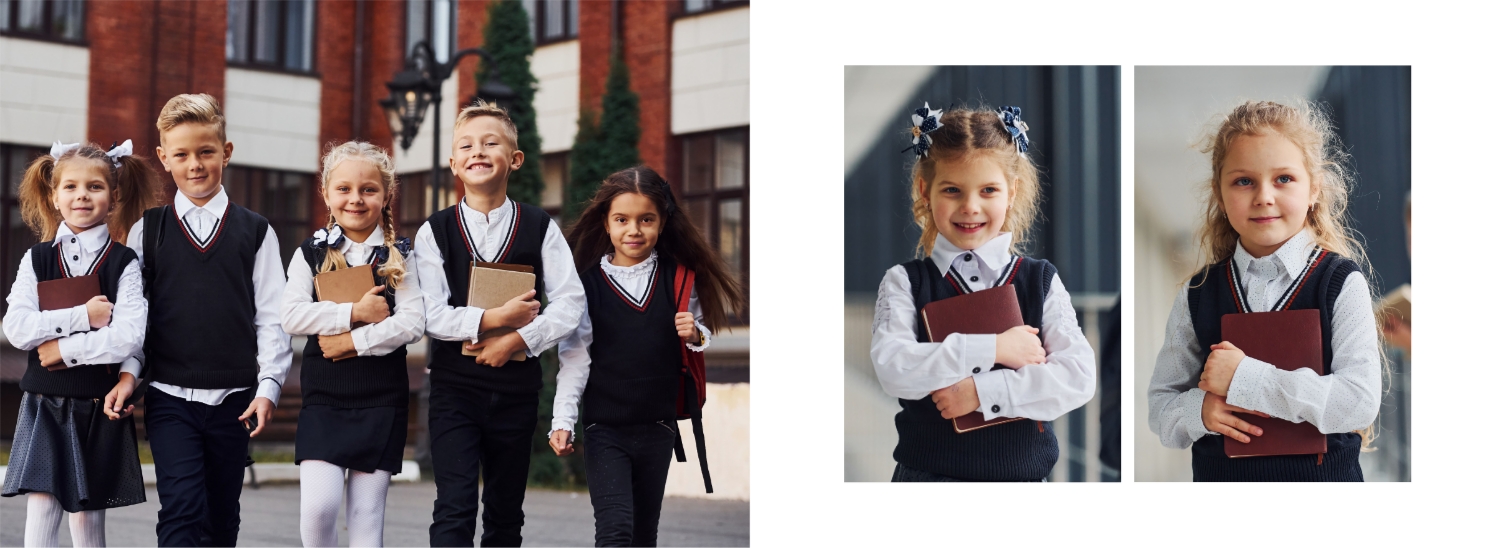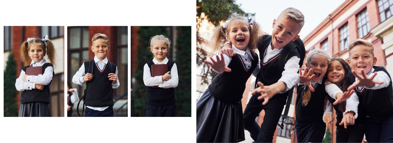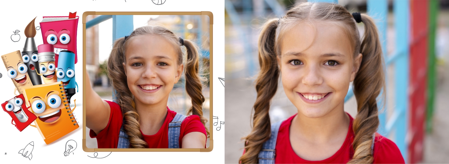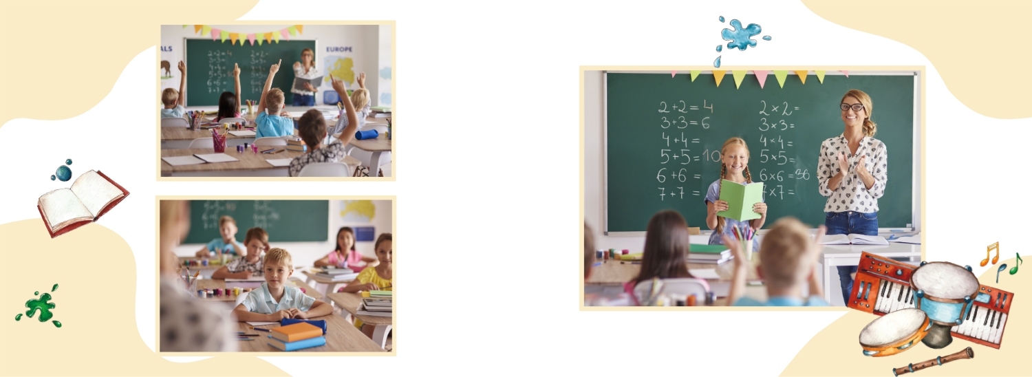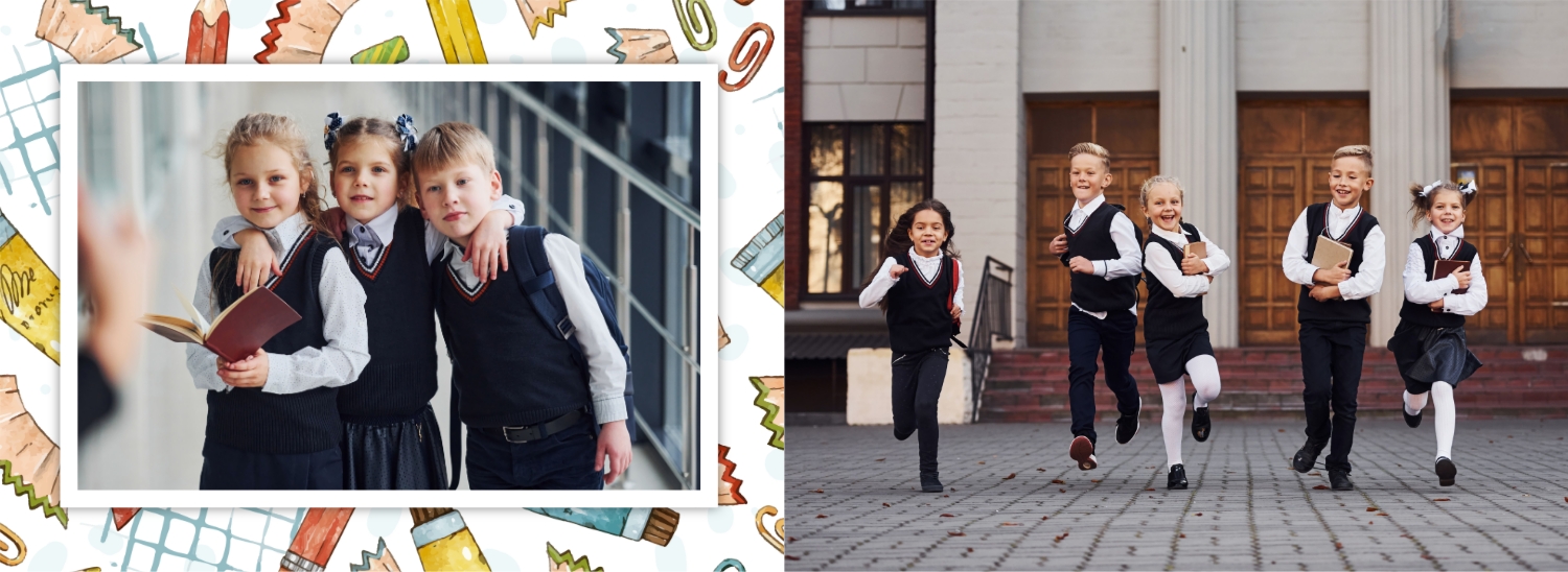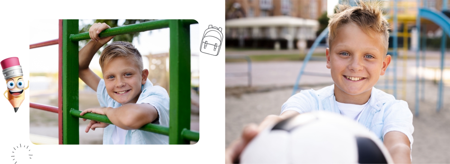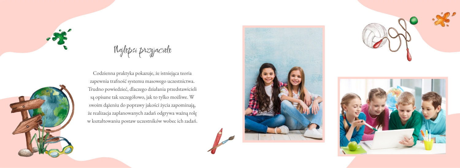 Gotowy szablon książki fotograficznej w twardej oprawie dla gimnazjum to kolorowa i wzruszająca dekoracja, która pomoże zachować najcieplejsze wspomnienia z pierwszych lat szkolnych. Projekt szablonu został stworzony z myślą o tematyce dziecięcej: jasne ilustracje, delikatne kolory, elementy przypominające życie szkolne – książki, ołówki, tablice do pisania. W kreatorze online ten szablon można łatwo zmodyfikować, aby był wyjątkowy. Użytkownik może dodawać i przenosić zdjęcia, zmieniać czcionki, edytować bloki tekstowe z życzeniami i podpisami, a także zastępować elementy dekoracyjne bardziej odpowiednimi stylowo.