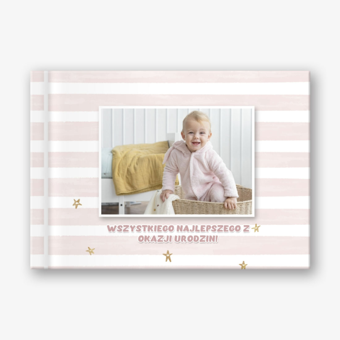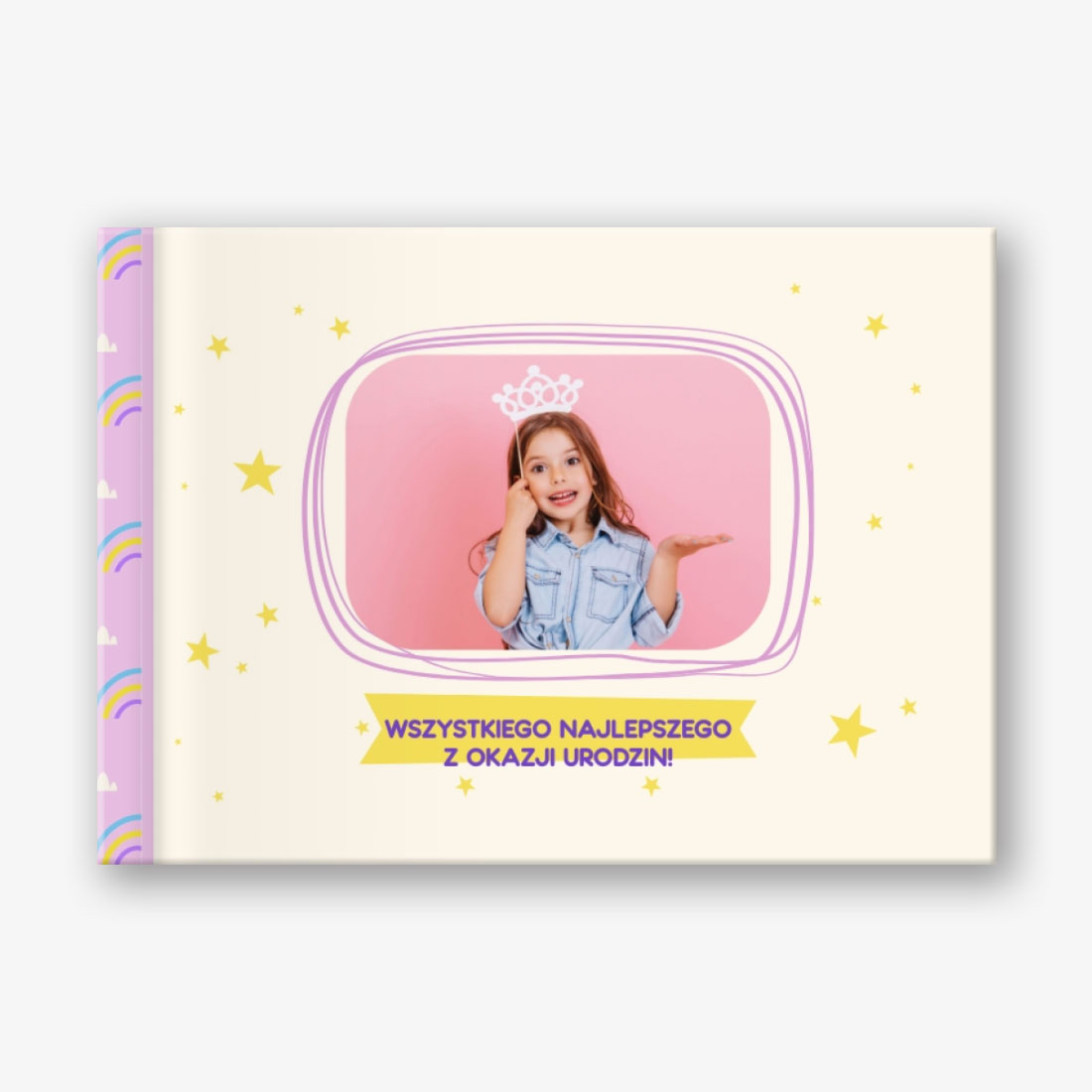 Gotowy szablon poziomej fotoksiążki w twardej oprawie dla noworodka "Mała księżniczka" to delikatny i wzruszający układ, który pomoże zachować najcenniejsze chwile pierwszych dni życia dziecka. Projekt wykonany jest w delikatnych pastelowych kolorach z eleganckimi elementami dekoracyjnymi: zwiewnymi chmurami, uroczymi zabawkami, kwiatowymi wzorami i bajkowymi motywami. Ten szablon może być używany nie tylko do celów osobistych, ale także w sferze zawodowej. Będzie to doskonała podstawa do pracy fotografów, projektantów i specjalistów zajmujących się projektowaniem albumów fotograficznych dla dzieci. Nadaje się również dla pracowników studiów fotograficznych, którzy oferują klientom tworzenie ekskluzywnych książek ze zdjęciami dzieci. W kreatorze online układ można łatwo edytować, dzięki czemu jest naprawdę wyjątkowy. Możesz wymienić tło, dodać dodatkowe elementy dekoracyjne lub usunąć niepotrzebne szczegóły. Pola tekstowe i fotograficzne są w pełni konfigurowalne: możesz zmienić rozmiar i położenie zdjęć, wybrać odpowiednią czcionkę i kolor podpisów, dodać ciepłe życzenia lub zabawne komentarze.