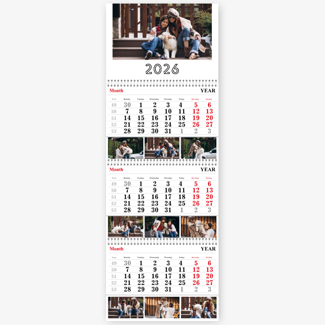 Gotowy szablon kwartalnego kalendarza ściennego "Trio" dla ukochanej mamy to wzruszająca i piękna podstawa do stworzenia osobistego prezentu, który jest pełen ciepła i troski. Projekt wykonany jest w miękkich, delikatnych kolorach, z elementami kolorów, przytulnej grafiki, która natychmiast kojarzy się z domowym komfortem i uwagą mamy. W kreatorze online szablon można łatwo przekształcić w unikalny produkt. Możesz wstawiać zdjęcia rodzinne, wybierać ulubione chwile z życia, dodawać napisy z ciepłymi słowami, zmieniać kolory i czcionki zgodnie z indywidualnymi preferencjami. Każdy miesiąc można zaprojektować w swoim stylu, wstawiając zdjęcia lub życzenia związane z określoną porą roku lub ważnymi datami rodzinnymi. Dostępne jest również dodawanie własnych Świąt i notatek bezpośrednio do siatki kalendarza. Kreator pozwala na intuicyjną pracę, nawet dla tych, którzy po raz pierwszy tworzą projekt od podstaw. Daje to pełną swobodę twórczą i możliwość stworzenia naprawdę wyjątkowego kalendarza, który zachwyci mamę każdego dnia przez cały rok.