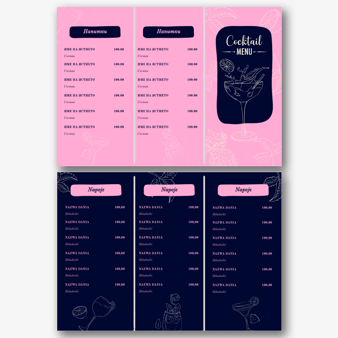 Gotowy szablon menu koktajlowego to jasne i stylowe rozwiązanie dla tych, którzy chcą szybko stworzyć efektowne menu bez pomocy projektanta. W kreatorze online szablon menu koktajlowego można łatwo edytować dla określonych potrzeb. Możesz zmieniać nazwy i opisy napojów, dostosowywać ceny, dodawać lub usuwać pozycje oraz wstawiać firmowe obrazy lub logo zakładu. Kolory, czcionki i elementy dekoracyjne są również edytowalne, co pozwala dostosować szablon do każdego stylu — od tropikalnego po minimalistyczny. Jeśli menu zmienia się w zależności od pory roku lub aktywności, możesz szybko zaktualizować gotowy układ i zachować wiele wersji. Tworzenie unikalnego menu koktajlowego własnymi rękami w naszym kreatorze online jest proste i wygodne. Nawet bez doświadczenia w projektowaniu możesz zaprojektować profesjonalny i atrakcyjny efekt, który podkreśli atmosferę Twojej instytucji i pozostawi przyjemne wrażenie na gościach.
