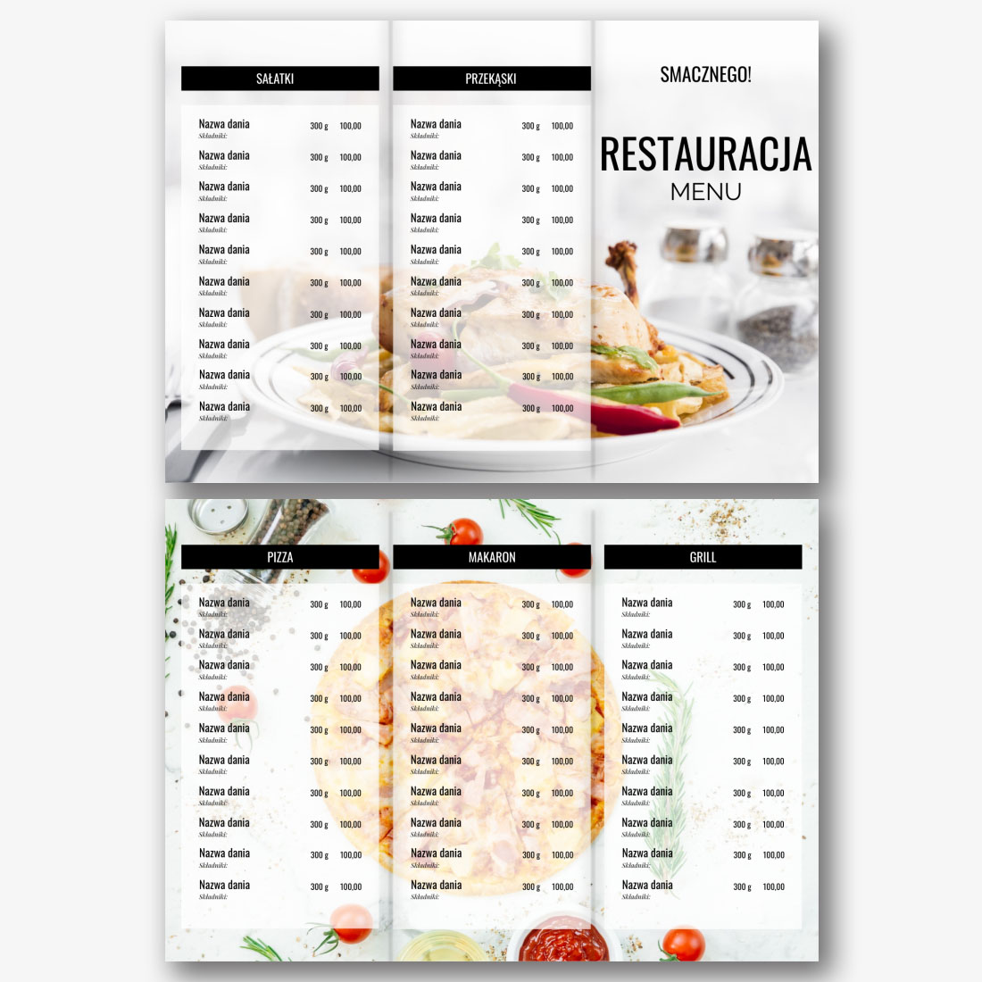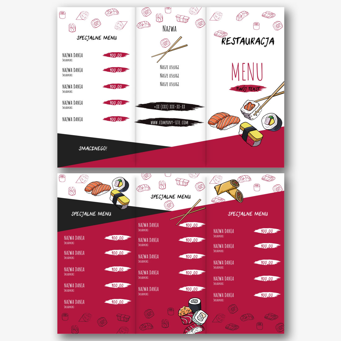 Gotowy szablon menu broszury dla restauracji sushi to nowoczesne i stylowe rozwiązanie, które natychmiast oddaje atmosferę kuchni japońskiej. Wizualny nacisk kładziony jest na minimalizm, czystość linii i harmonijne połączenie kolorów, dzięki czemu potrawy wyglądają apetycznie i atrakcyjnie. Osobliwością szablonu jest to, że można go łatwo dostosować do konkretnej instytucji w naszym kreatorze online. Tutaj dostępna jest edycja tekstu: możesz samodzielnie wpisać nazwy potraw, ceny, dodać opis składników lub wyróżnić specjalne pozycje, takie jak Nowości lub markowe bułki. Czcionki i kolory można również zmieniać, aby menu było jak najbardziej zgodne ze stylem korporacyjnym Twojej instytucji. Opcjonalnie można dodać logo, dane kontaktowe, kod QR do zamówień online lub piękne zdjęcia potraw, które sprawią, że menu będzie bardziej wizualne i wygodne dla klientów. Dzięki prostemu i przejrzystemu interfejsowi kreatora online edycja szablonu nie wymaga profesjonalnych umiejętności projektowych. Pozwala to szybko stworzyć unikalne menu własnymi rękami, podkreślając atmosferę Twojej restauracji i czyniąc ją atrakcyjną dla gości.