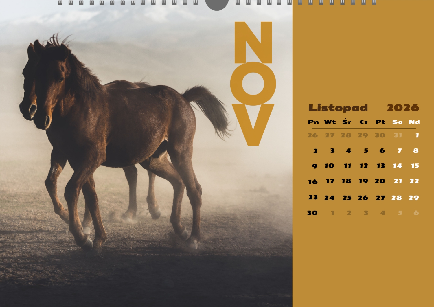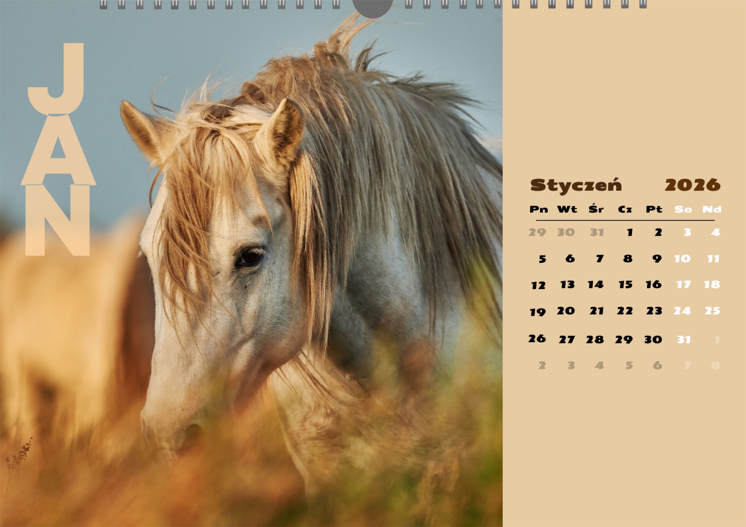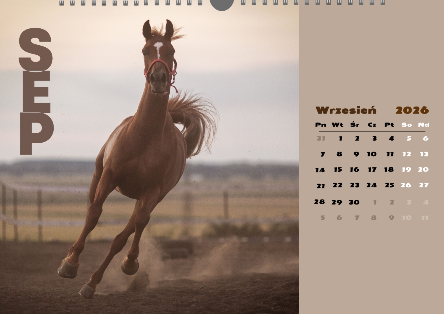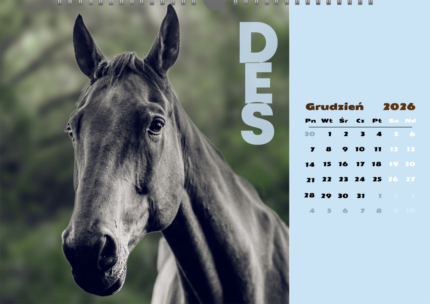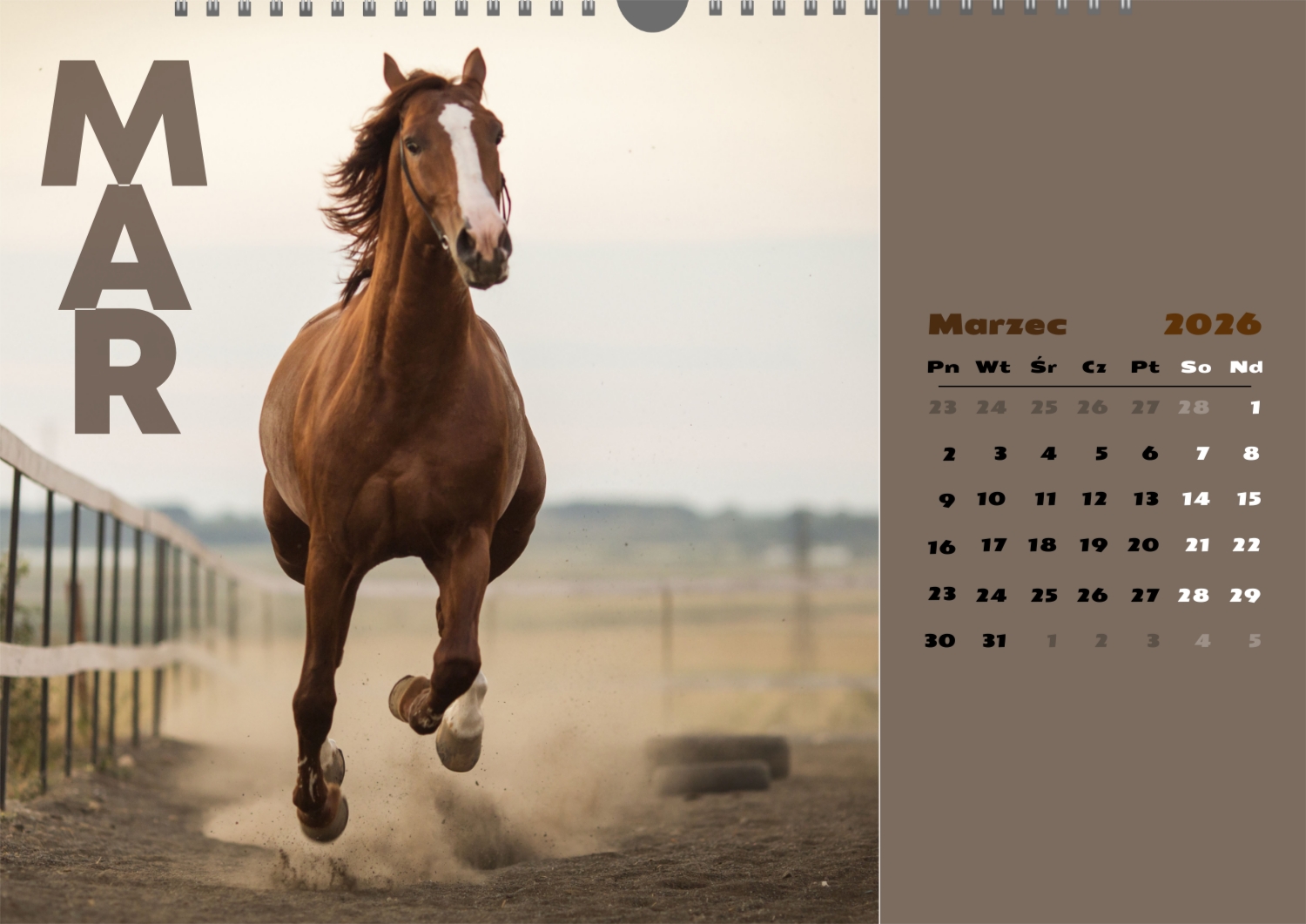 Gotowy szablon kalendarza ściennego z końmi został stworzony dla tych, którzy cenią naturalną harmonię, dynamikę i symbolikę siły. Obrazy przedstawiają potężne i szlachetne zwierzęta, które kojarzą się z wolnością, dążeniem do przodu i wewnętrzną równowagą. Taki kalendarz jest idealny dla klubów jeździeckich, Farm, ośrodków weterynaryjnych, sklepów zoologicznych, a także dla trenerów, instruktorów, fotografów i wszystkich, którzy pasjonują się jeździectwem lub po prostu kochają konie. Będzie równie odpowiedni zarówno w biurze, jak i we wnętrzu domu, tworząc atmosferę spokoju i inspiracji. W naszym kreatorze online ten szablon można łatwo dostosować do osobistych preferencji. Możesz zamienić zdjęcia na własne zdjęcia koni, dodać logo klubu lub gospodarstwa, zmienić czcionki, kolory i rozmieszczenie elementów. Istnieje możliwość podpisania miesięcy, podkreślenia ważnych dat, świętowania zawodów, treningów, urodzin i innych wydarzeń. Każdy element kalendarza – od tła po drobne szczegóły-można edytować, co pozwala stworzyć naprawdę spersonalizowaną opcję. Kreator online działa tak wygodnie i prosto, jak to możliwe: wszystkie zmiany są wyświetlane jednocześnie, możesz eksperymentować z kompozycjami, wypróbować różne style i zapisać kilka opcji.
