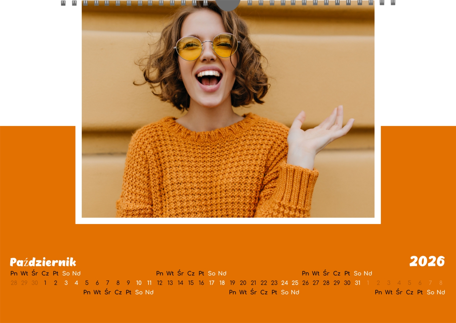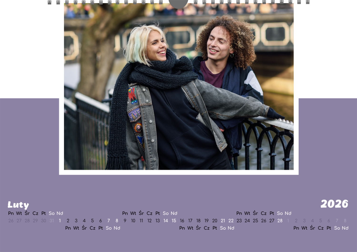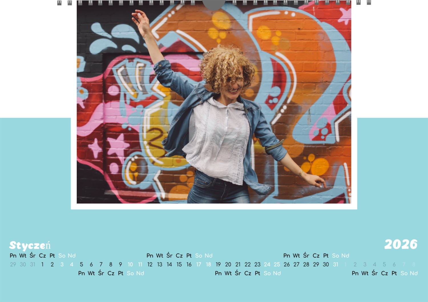 Gotowy szablon ściennego kalendarza poziomego z pożegnalnym słowem na przyszły rok został stworzony dla tych, którzy cenią inspirujący styl wizualny i chcą codziennie otrzymywać małe przypomnienie o celu, motywacji lub ważnym życiowym punkcie orientacyjnym. W naszym kreatorze online szablon można łatwo dostosować do własnego stylu i zadań. Możesz zmienić słowo pożegnalne, zastępując je frazą bliską tobie lub Twojemu zespołowi; dostosuj gamę kolorów do odcieni marki; wymień czcionki, dostosuj nasycenie tła lub dodaj dodatkowe elementy dekoracyjne. Jeśli kalendarz jest przeznaczony do użytku korporacyjnego, wygodnie jest dodać logo firmy, stronę internetową, kontakty, a nawet firmowe wartości wewnętrzne, aby kalendarz stał się częścią tożsamości wizualnej. Do użytku osobistego można przesyłać zdjęcia, wybierać ulubione kolory i stylizować kalendarz w ciepły, inspirujący lub minimalistyczny sposób. Edycja odbywa się bezpośrednio w przeglądarce i nie wymaga skomplikowanych umiejętności projektowania: wszystkie elementy można przeciągać, zmieniać ich rozmiar, obracać, usuwać lub uzupełniać. Rezultatem jest całkowicie unikalny kalendarz ścienny DIY, który nie tylko ozdobi przestrzeń, ale także stanie się miękkim, ale pewnym przypomnieniem wybranego kierunku na nadchodzący rok.