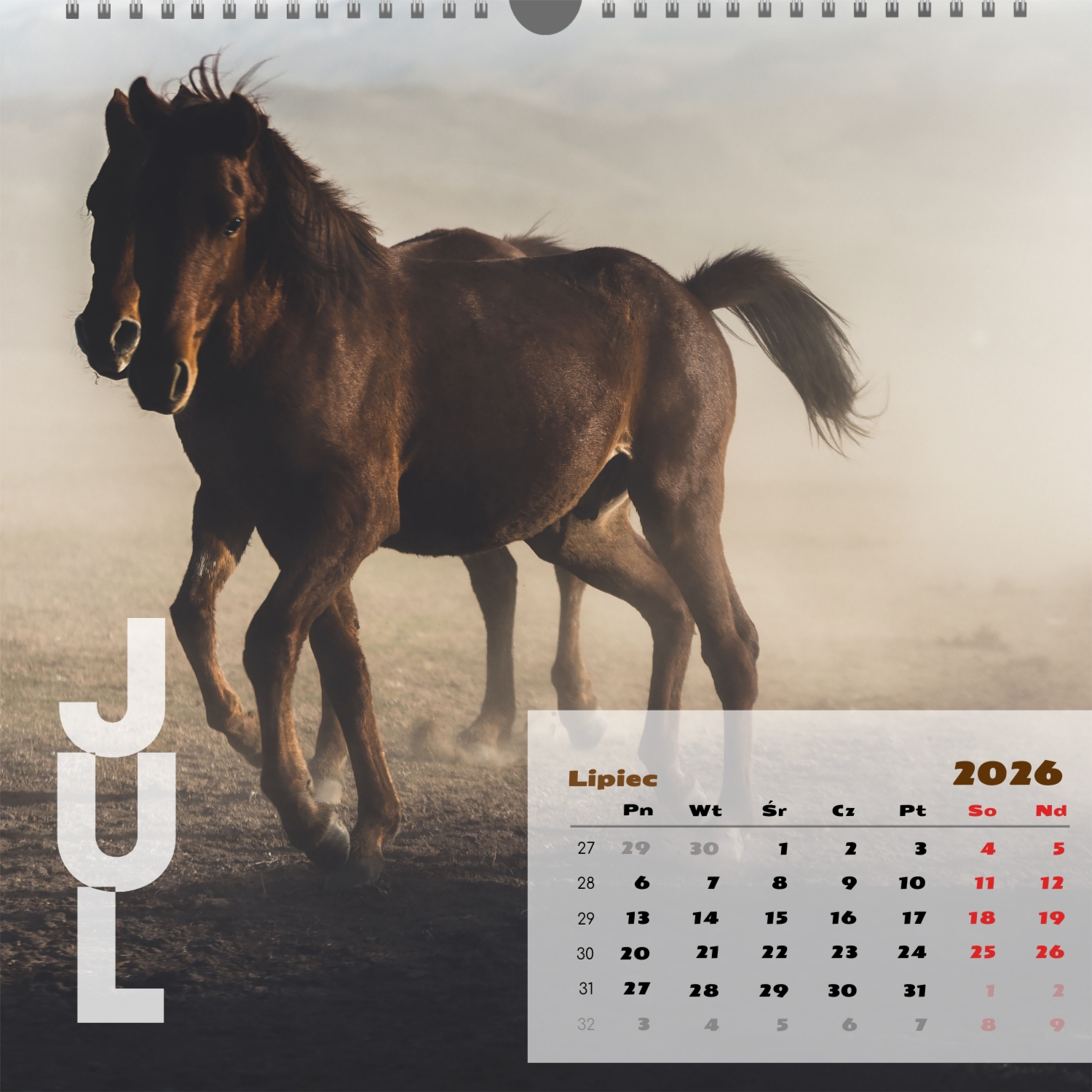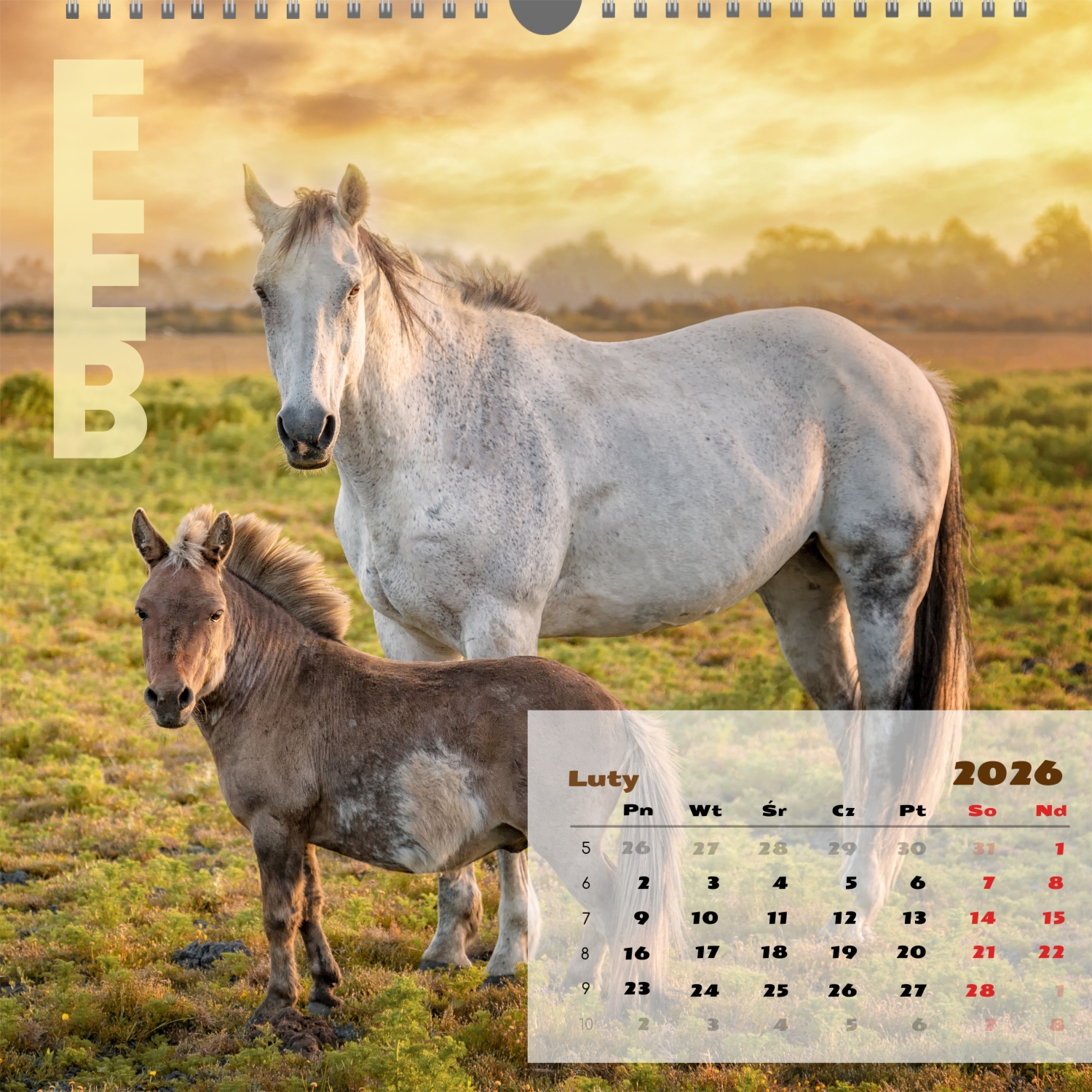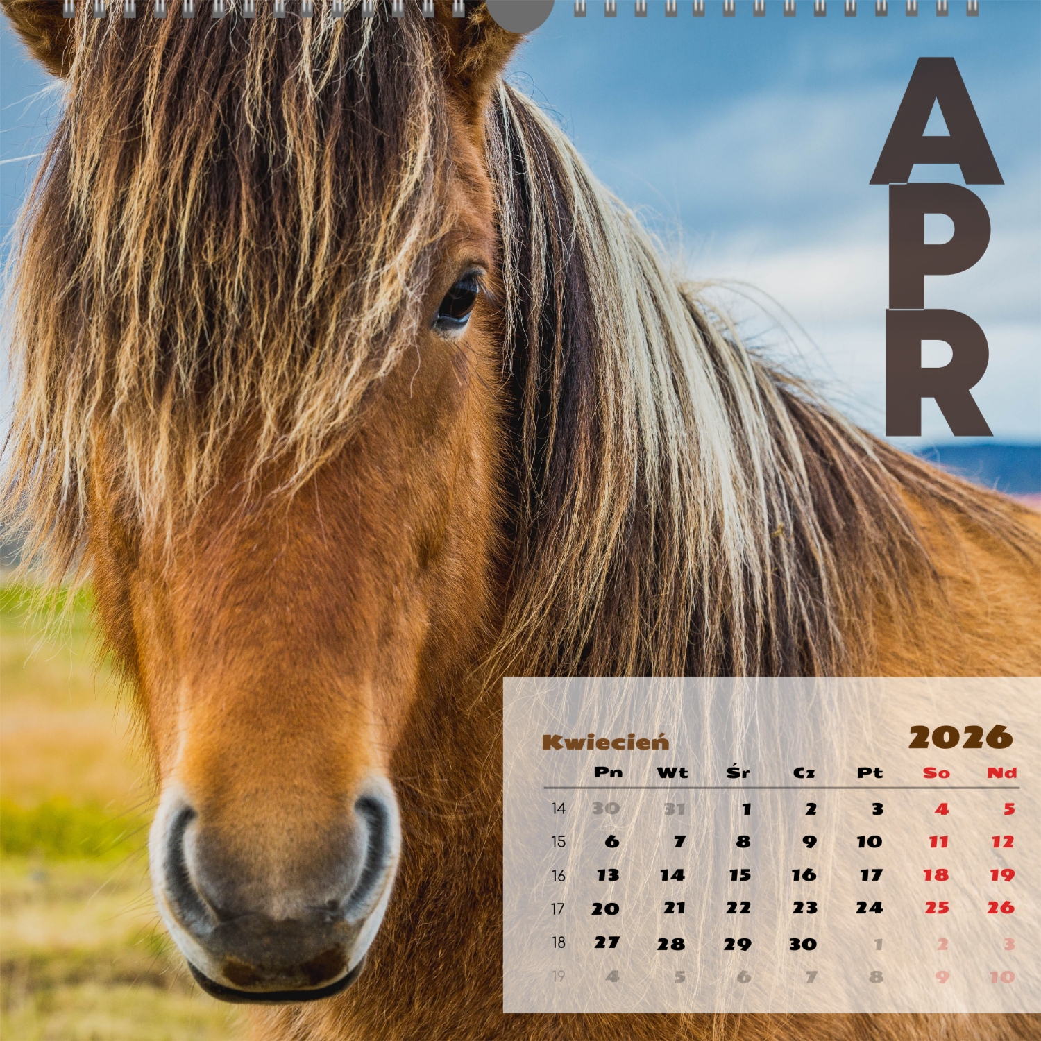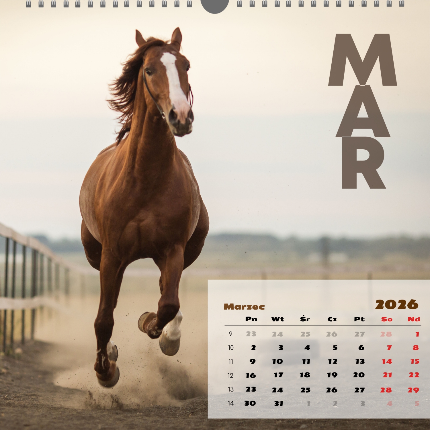 Gotowy szablon kwadratowego kalendarza ściennego z końmi został stworzony dla tych, którzy cenią naturalną harmonię, dynamikę i symbolikę siły. W naszym kreatorze online ten szablon można łatwo dostosować do osobistych preferencji. Możesz zamienić zdjęcia na własne zdjęcia koni, dodać logo klubu lub gospodarstwa, zmienić czcionki, kolory i rozmieszczenie elementów. Istnieje możliwość podpisania miesięcy, podkreślenia ważnych dat, świętowania zawodów, treningów, urodzin i innych wydarzeń. Każdy element kalendarza – od tła po drobne szczegóły-można edytować, co pozwala stworzyć naprawdę spersonalizowaną opcję. Kreator online działa tak wygodnie i prosto, jak to możliwe: wszystkie zmiany są wyświetlane jednocześnie, możesz eksperymentować z kompozycjami, wypróbować różne style i zapisać kilka opcji. W rezultacie otrzymujesz unikalny kalendarz ścienny z końmi, który odzwierciedla twój charakter, aktywność zawodową lub wartości osobiste. Taki kalendarz nie tylko stanie się funkcjonalnym asystentem na każdy dzień, ale także ozdobi przestrzeń, przypominając o ruchu do przodu i sile wewnętrznej inspiracji.