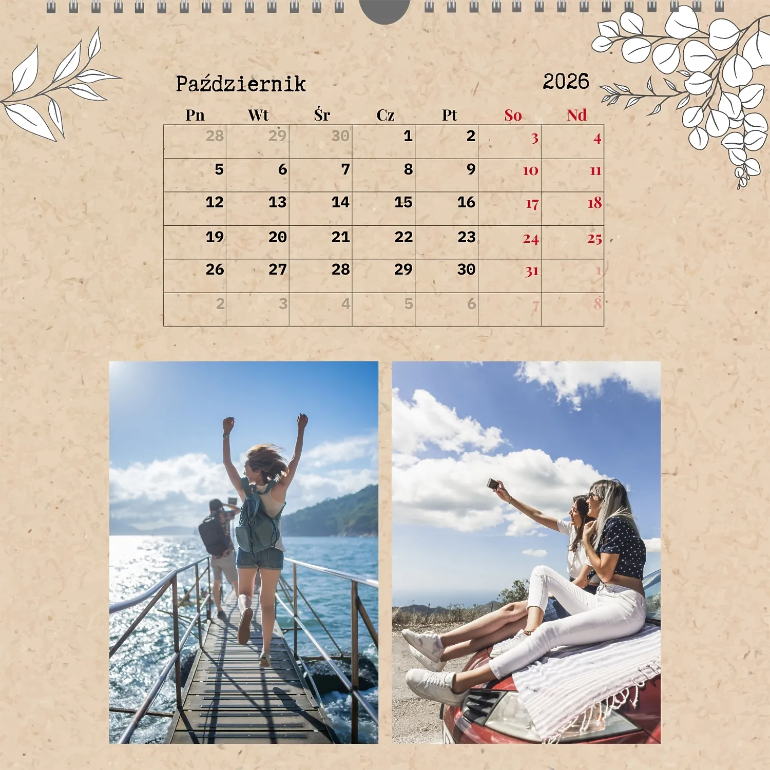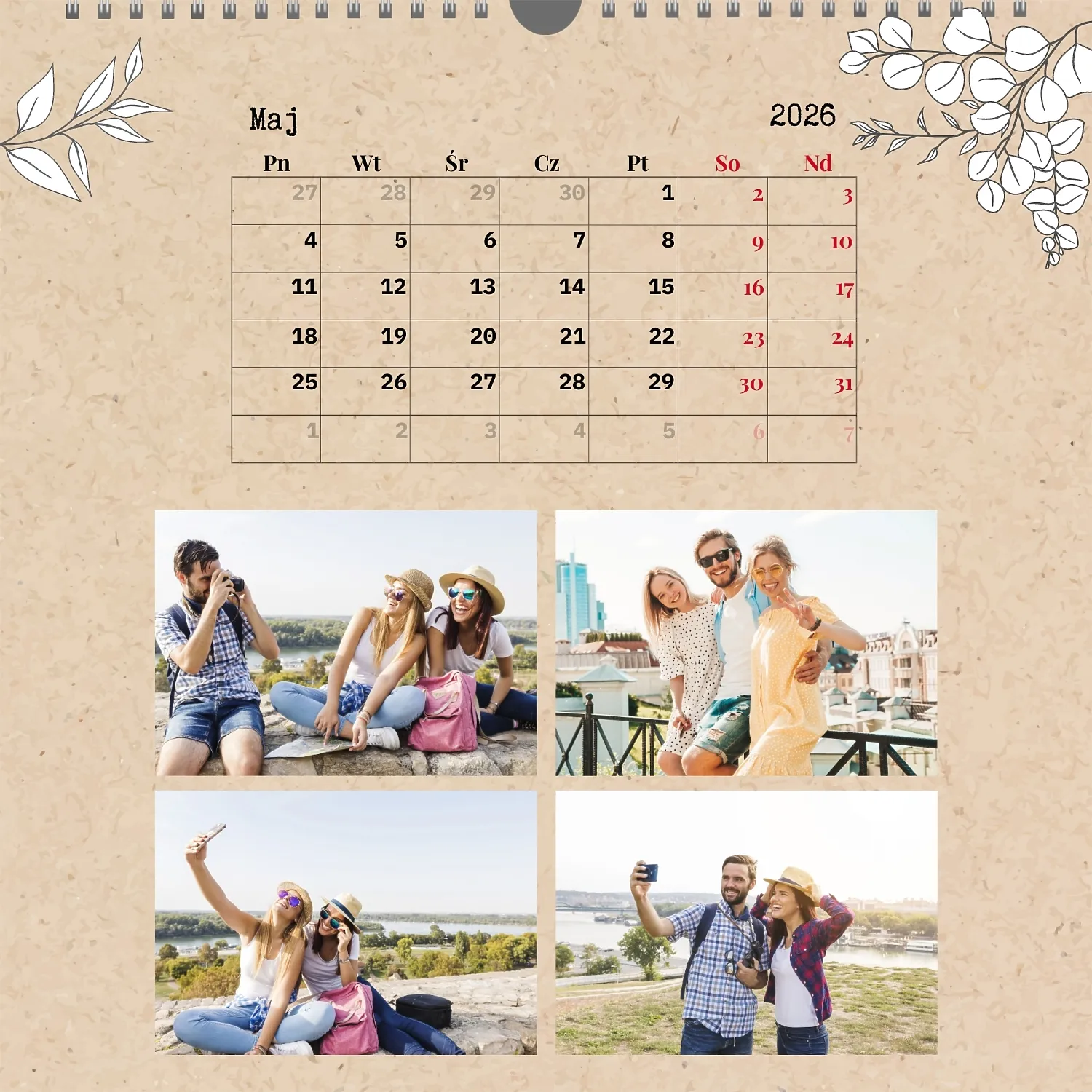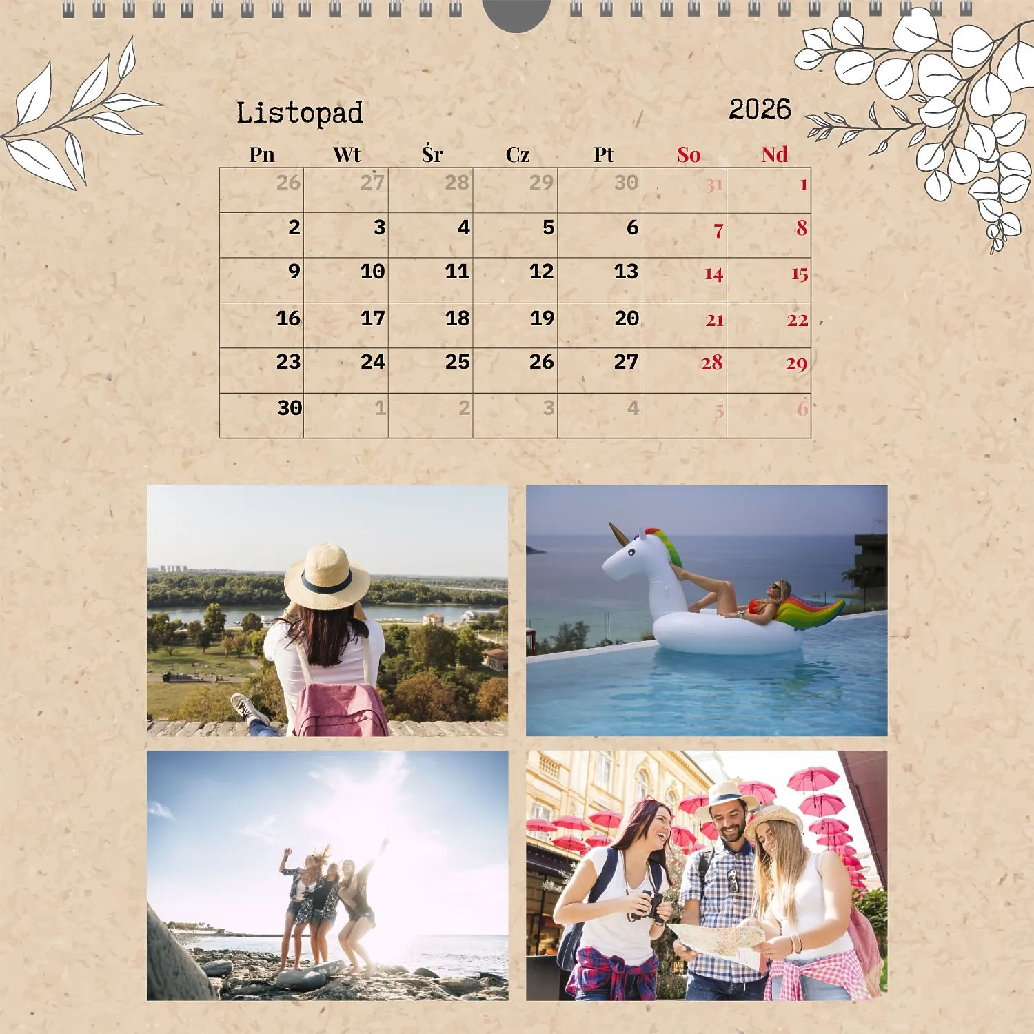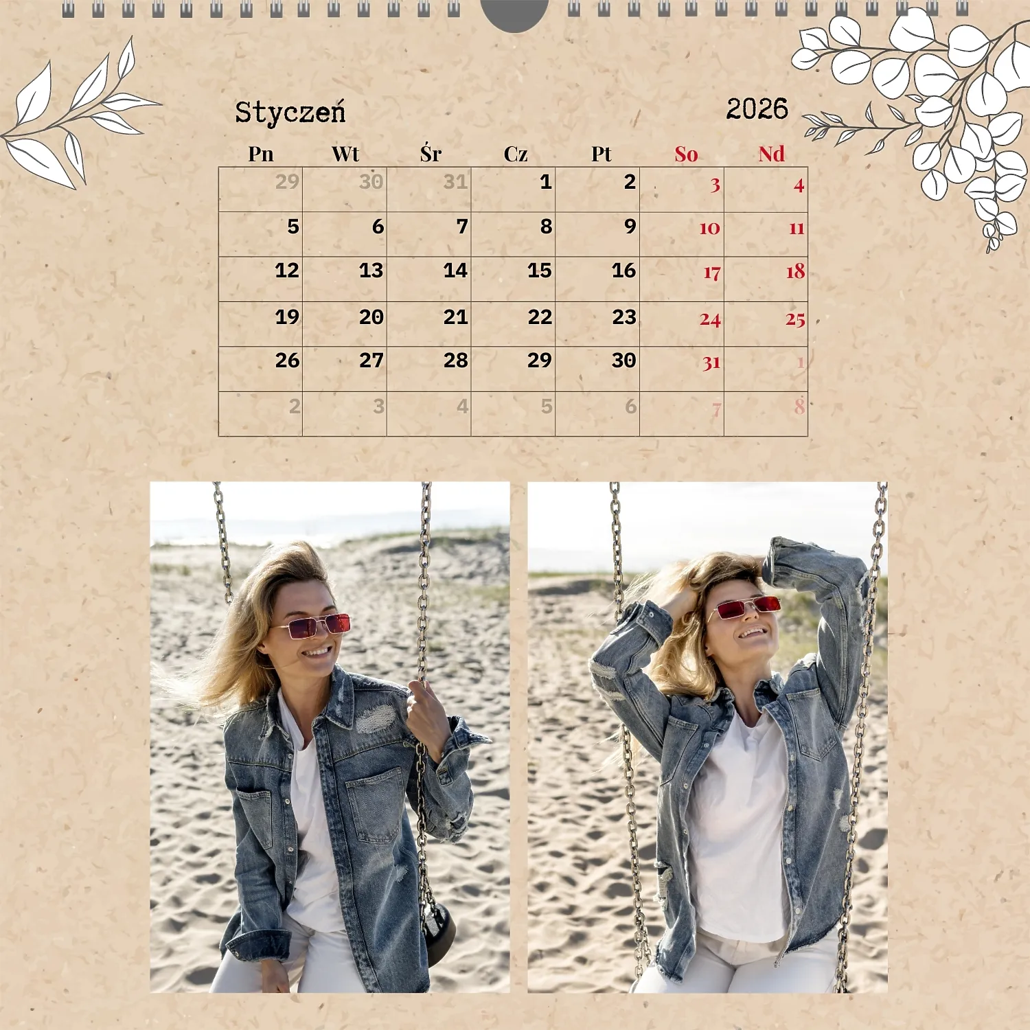 Gotowy szablon kalendarza ściennego z osobistymi zdjęciami to świetne rozwiązanie dla tych, którzy chcą stworzyć wyjątkowy i stylowy dodatek do domu, biura lub prezentu. Ten kwadratowy kalendarz jest idealny dla osób, które cenią sobie indywidualność i chcą otoczyć się rzeczami pełnymi znaczenia i miłych wspomnień. Główną zaletą szablonu jest jego dostępność w wygodnym kreatorze online. Możesz łatwo przesyłać zdjęcia, zmieniać układ elementów, dodawać komentarze tekstowe, wyróżniać ważne daty lub wydarzenia. Projektant pozwala dostosować szablon do swojego stylu: wybierz kolorystykę, czcionkę, a nawet dostosuj poszczególne szczegóły projektu.