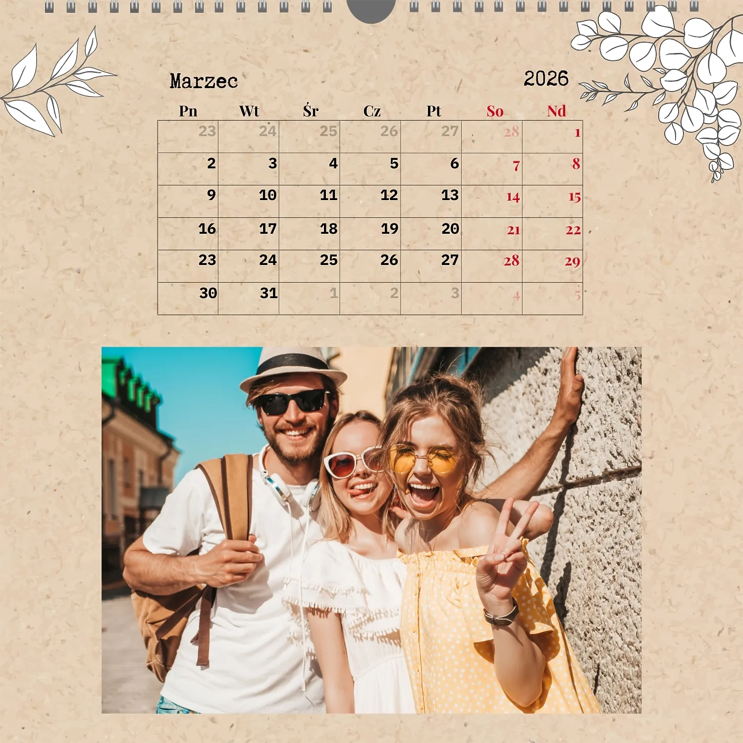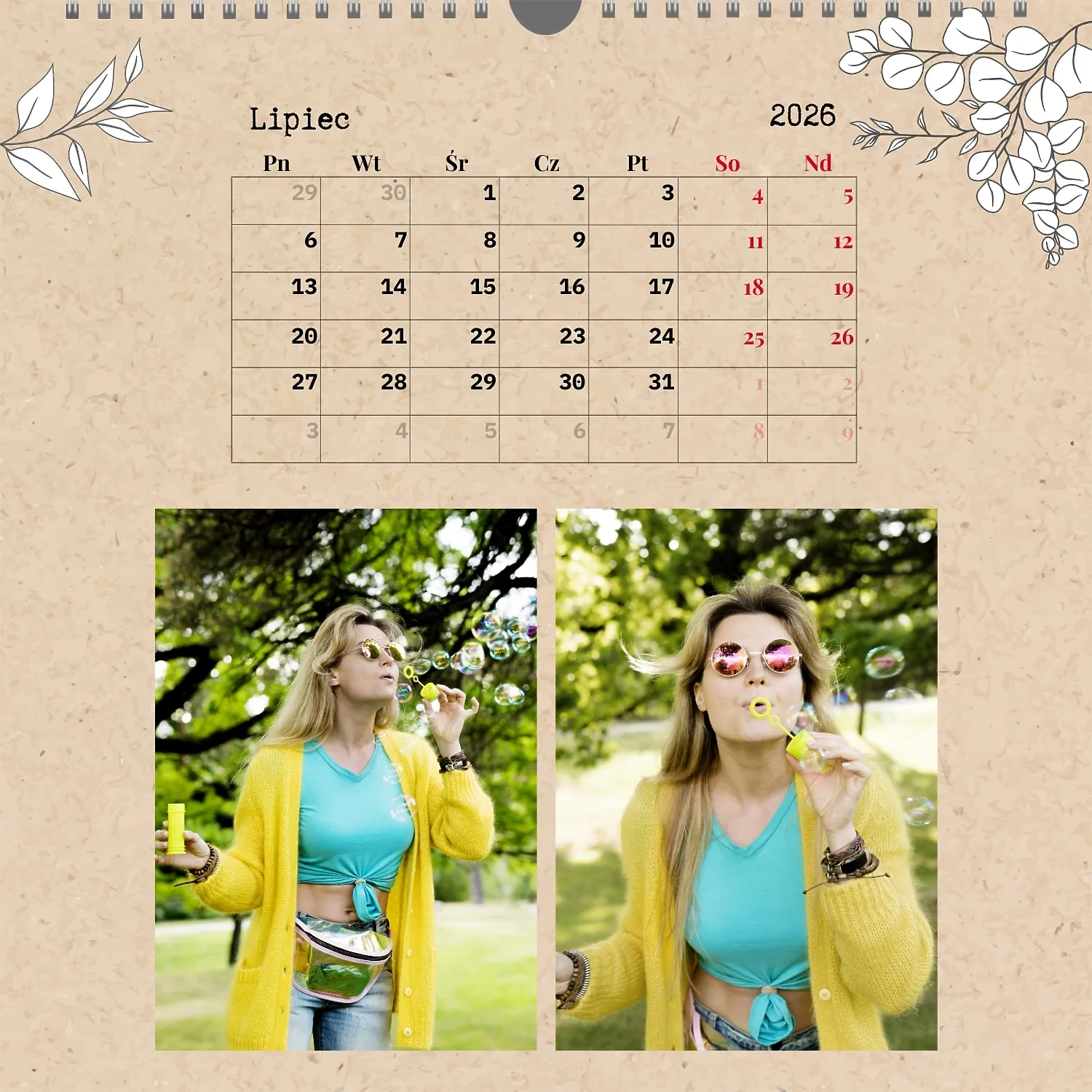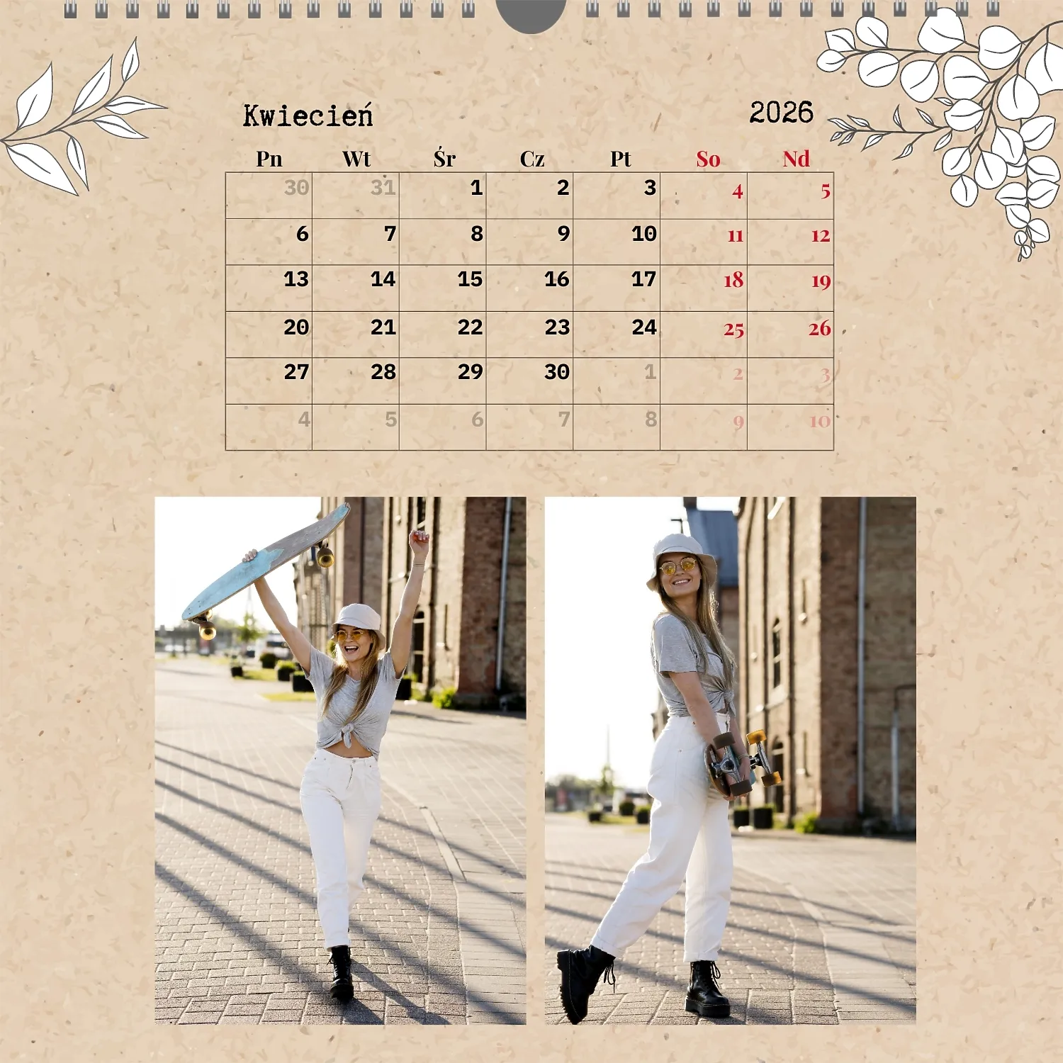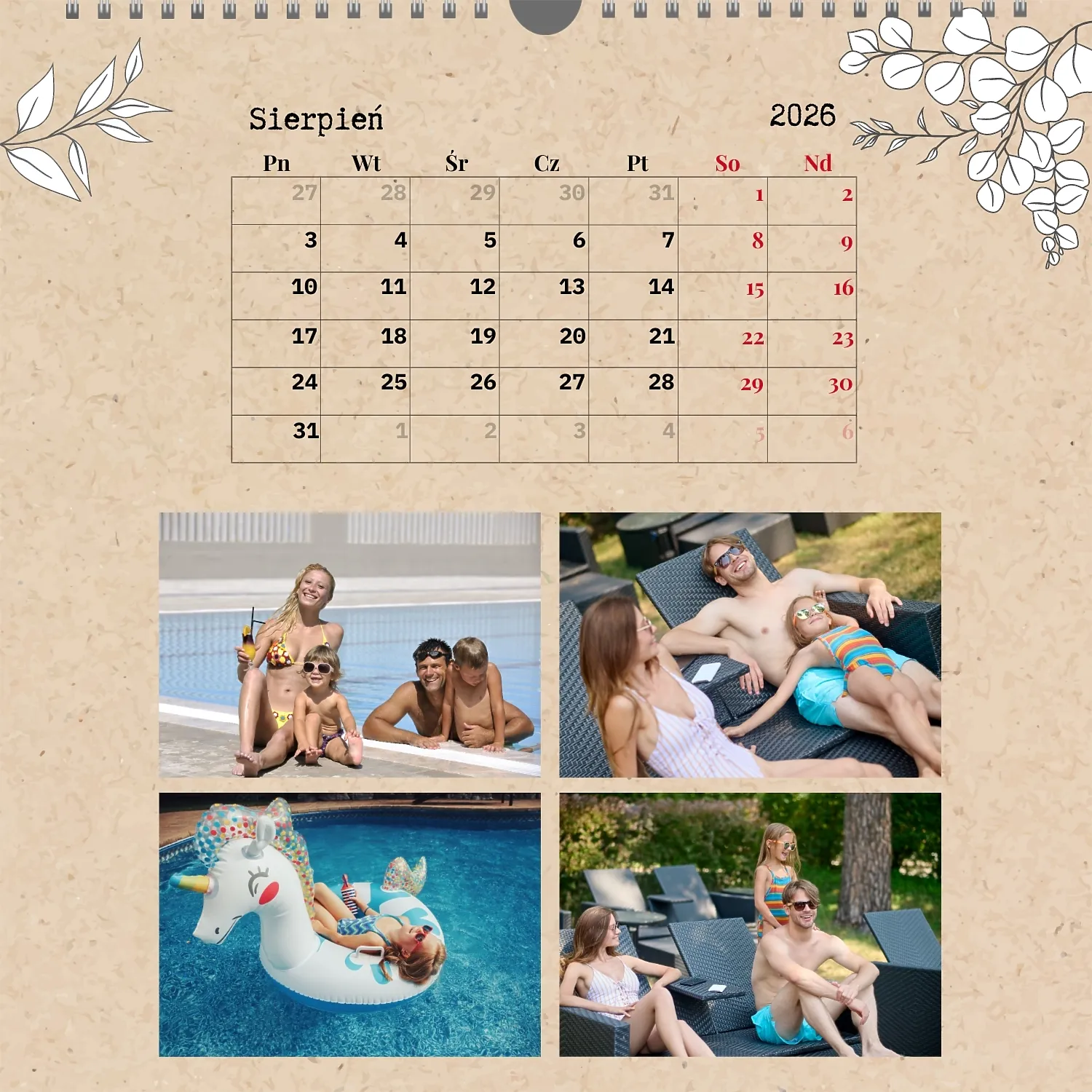 Gotowy szablon kalendarza ściennego z osobistymi zdjęciami to świetne rozwiązanie dla tych, którzy chcą stworzyć wyjątkowy i stylowy dodatek do domu, biura lub prezentu. Ten kwadratowy kalendarz jest idealny dla osób, które cenią sobie indywidualność i chcą otoczyć się rzeczami pełnymi znaczenia i miłych wspomnień. Główną zaletą szablonu jest jego dostępność w wygodnym kreatorze online. Możesz łatwo przesyłać zdjęcia, zmieniać układ elementów, dodawać komentarze tekstowe, wyróżniać ważne daty lub wydarzenia. Projektant pozwala dostosować szablon do swojego stylu: wybierz kolorystykę, czcionkę, a nawet dostosuj poszczególne szczegóły projektu.