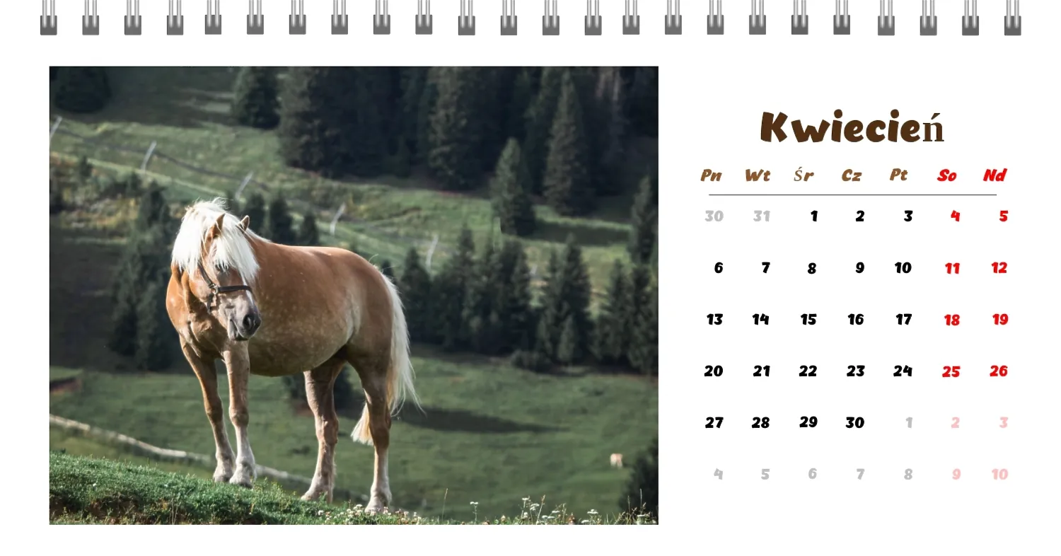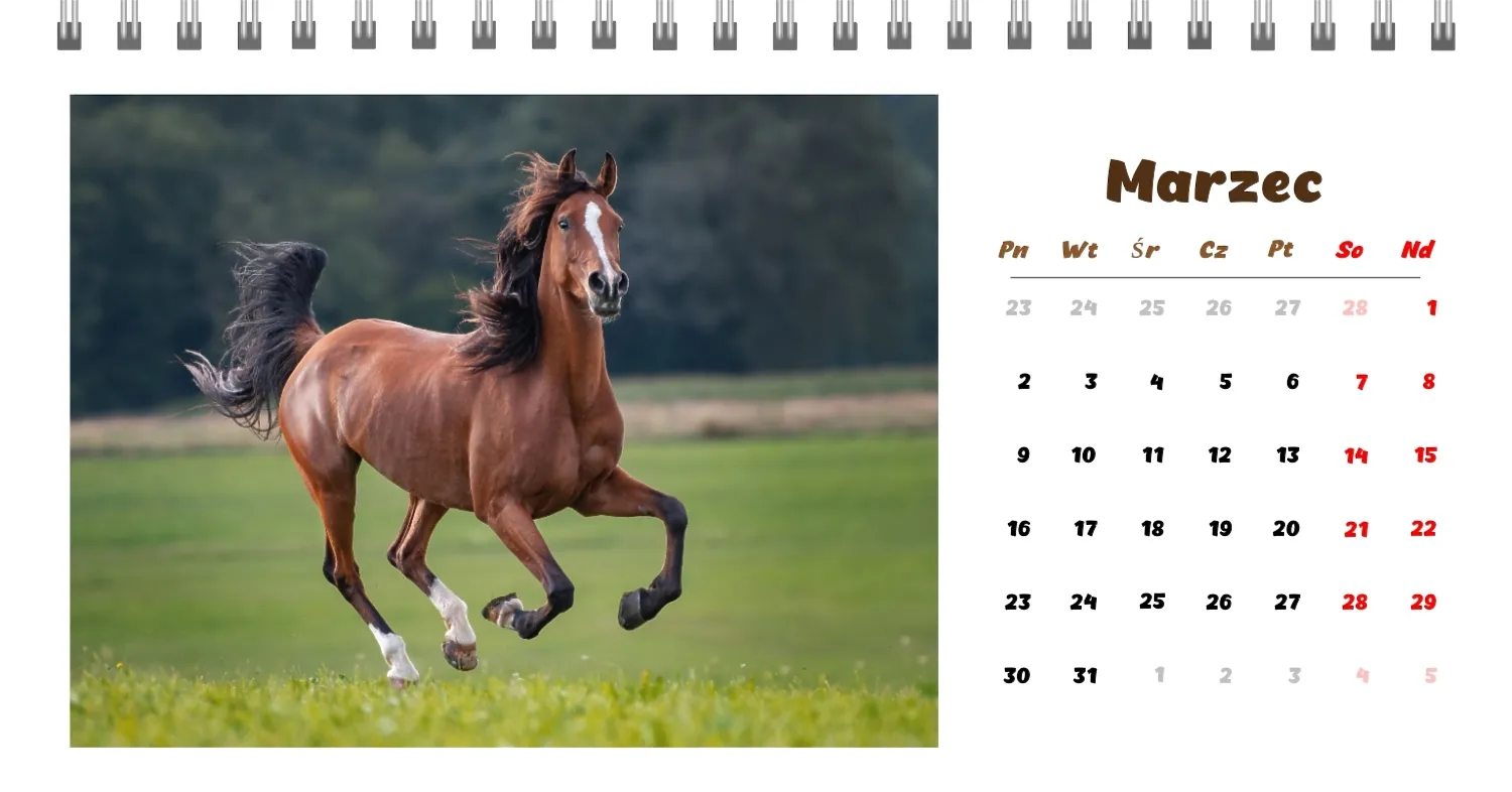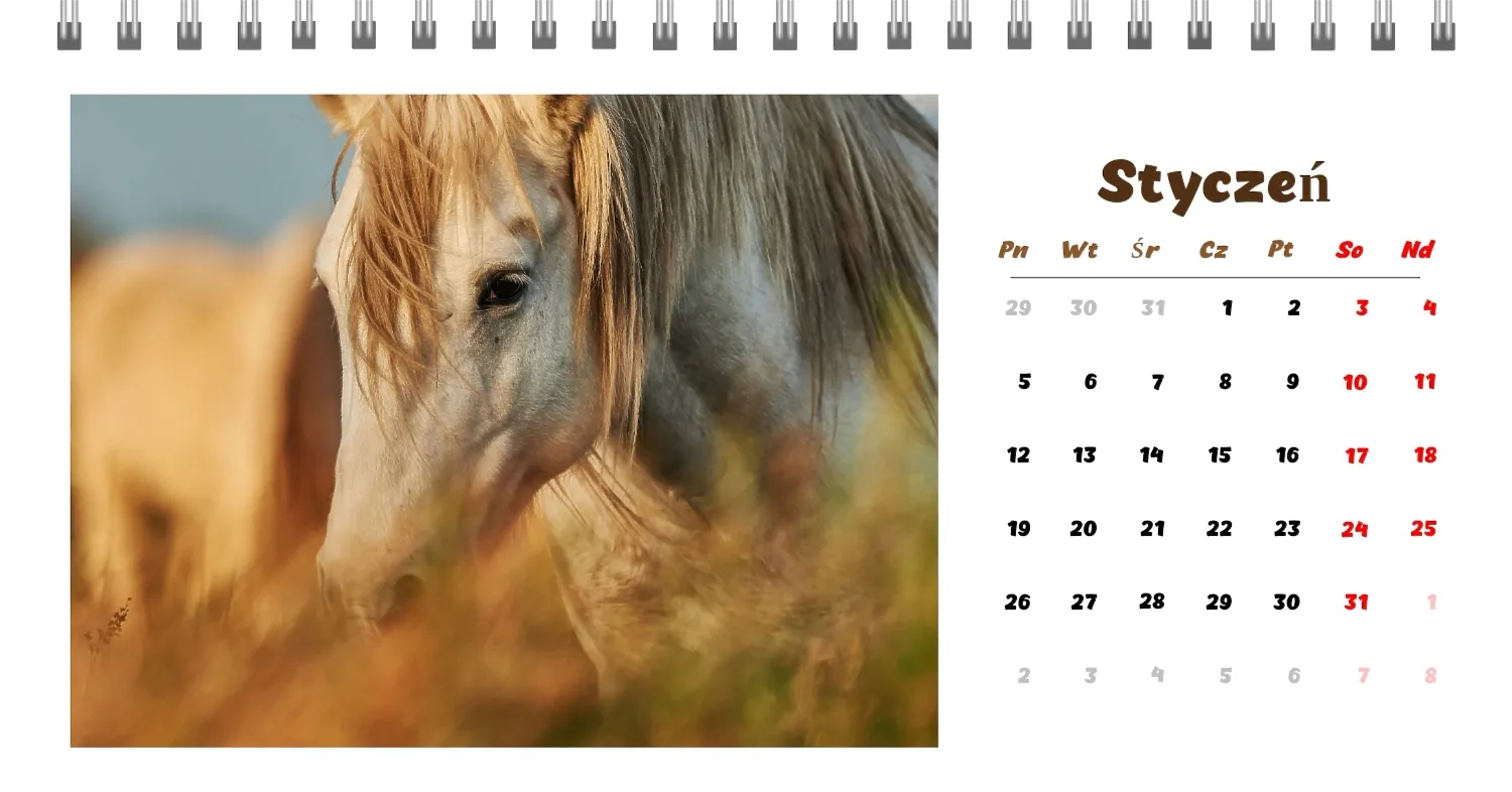 Gotowy szablon stołowego poziomego kalendarza z końmi został stworzony dla tych, którzy cenią naturalną harmonię, dynamikę i symbolikę siły. Obrazy przedstawiają potężne i szlachetne zwierzęta, które kojarzą się z wolnością, dążeniem do przodu i wewnętrzną równowagą. Taki kalendarz jest idealny dla klubów jeździeckich, Farm, ośrodków weterynaryjnych, sklepów zoologicznych, a także dla trenerów, instruktorów, fotografów i wszystkich, którzy pasjonują się jeździectwem lub po prostu kochają konie. Będzie równie odpowiedni zarówno w biurze, jak i we wnętrzu domu, tworząc atmosferę spokoju i inspiracji. W naszym kreatorze online ten szablon można łatwo dostosować do osobistych preferencji. Możesz zamienić zdjęcia na własne zdjęcia koni, dodać logo klubu lub gospodarstwa, zmienić czcionki, kolory i rozmieszczenie elementów. Istnieje możliwość podpisania miesięcy, podkreślenia ważnych dat, świętowania zawodów, treningów, urodzin i innych wydarzeń. Każdy element kalendarza – od tła po drobne szczegóły-można edytować, co pozwala stworzyć naprawdę spersonalizowaną opcję. Kreator online działa tak wygodnie i prosto, jak to możliwe: wszystkie zmiany są wyświetlane jednocześnie, możesz eksperymentować z kompozycjami, wypróbować różne style i zapisać kilka opcji.