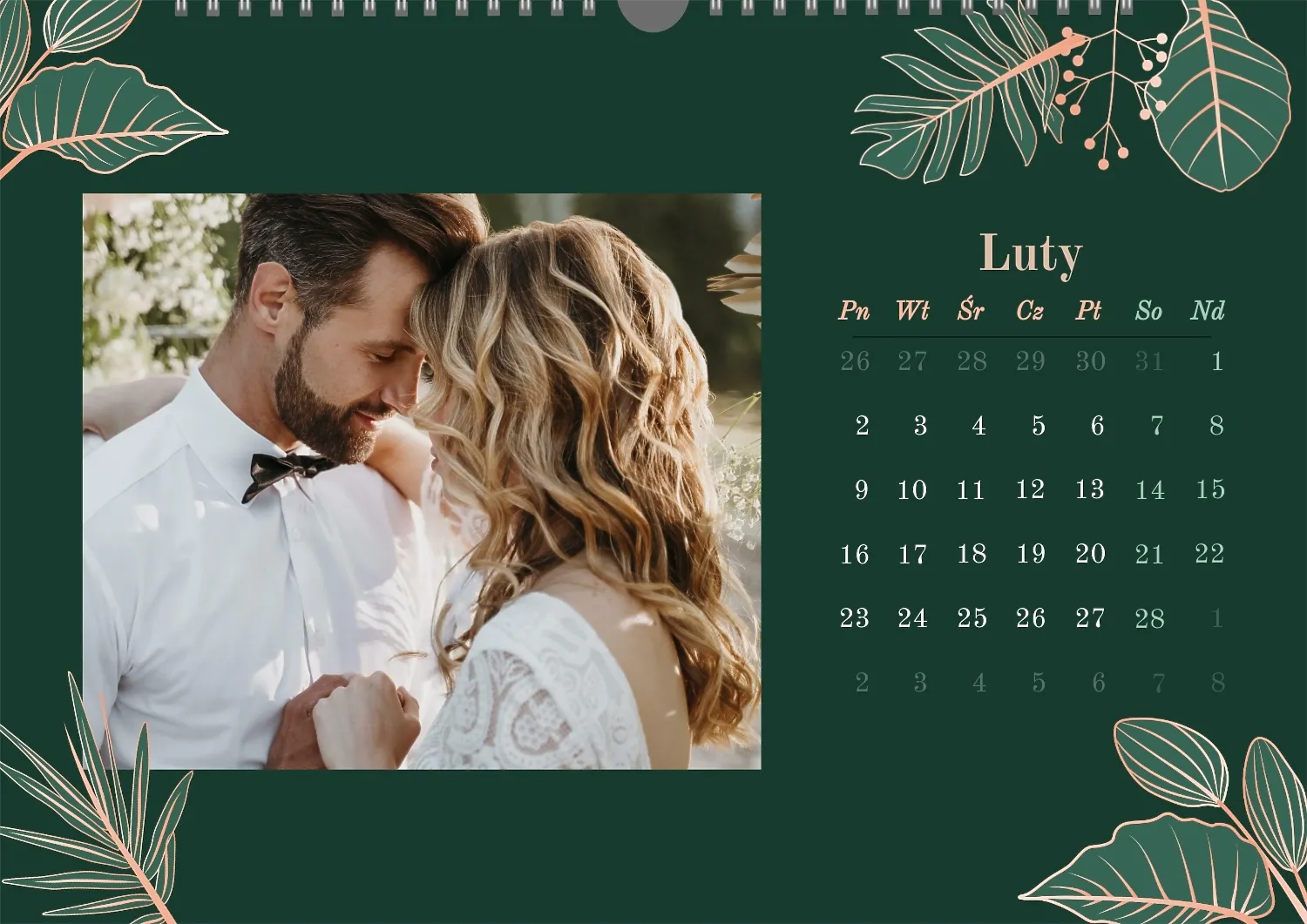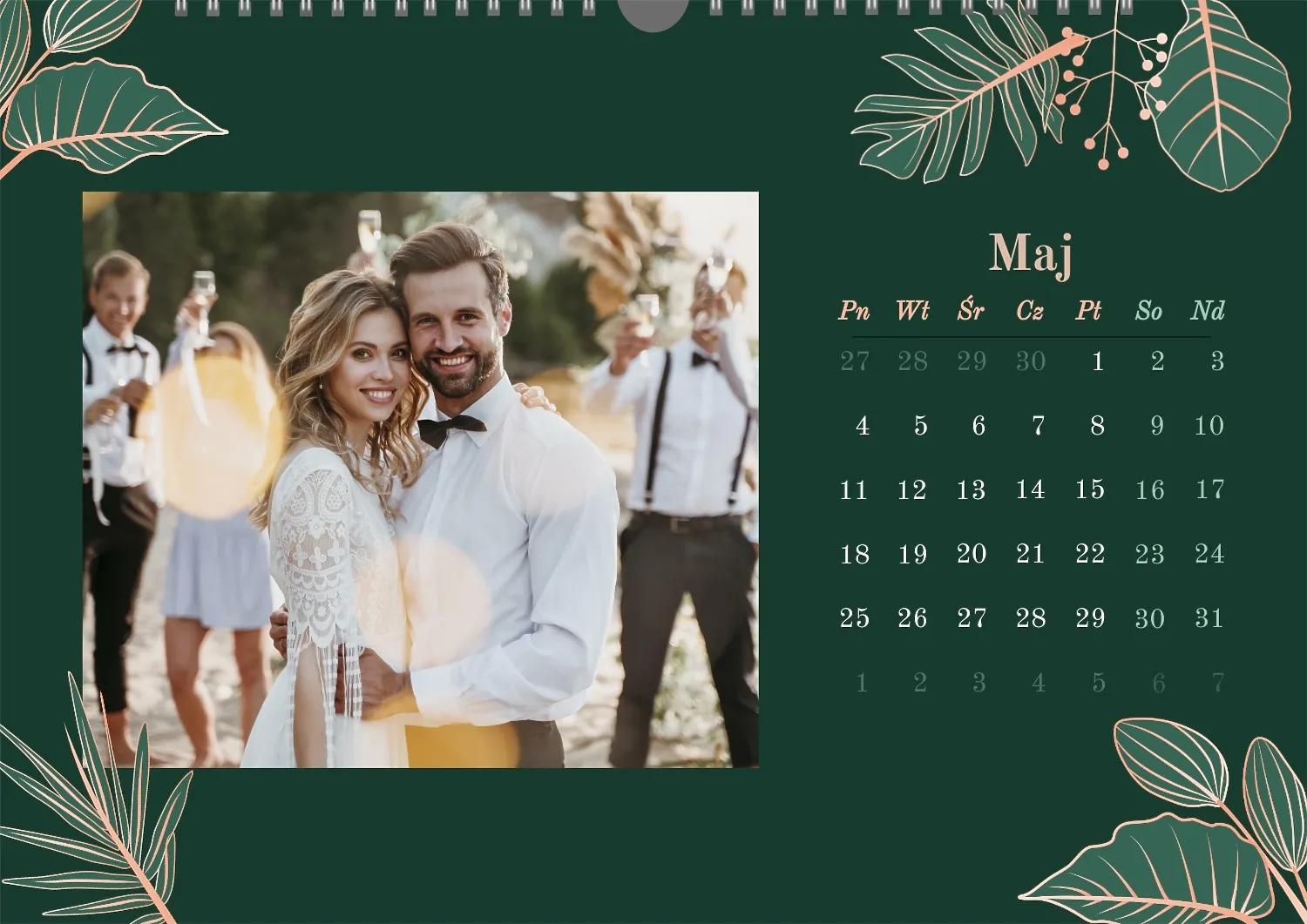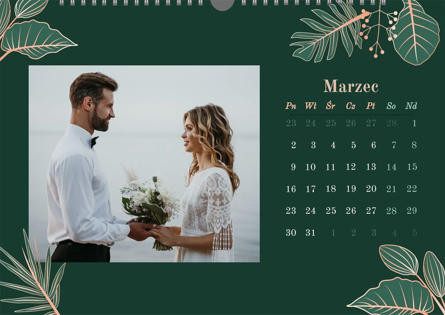 Gotowy szablon kalendarza ściennego ze zdjęciami ślubnymi to uniwersalna podstawa stworzona specjalnie dla tych, którzy chcą zachować atmosferę uroczystości w pięknym i funkcjonalnym formacie. Jest szczególnie odpowiedni dla fotografów, agencji ślubnych, dekoratorów, a także specjalistów, którzy tworzą spersonalizowane prezenty lub pamiątki dla nowożeńców. Taki kalendarz jest często używany jako część pakietu ślubnego, jako dodatek do fotoksiążek lub jako wzruszający prezent dla rodziców i przyjaciół. W kreatorze online ten szablon jest w pełni edytowalny, co pozwala dostosować go do dowolnej historii lub stylu ślubu. Możesz zastąpić tło, zmienić położenie zdjęć, dostosować gamę kolorów, dodać napisy, ważne daty i indywidualne życzenia. Wszystkie elementy można łatwo przesuwać, skalować i dostosowywać do kompozycji — dzięki temu proces tworzenia jest tak wygodny, jak to tylko możliwe, nawet dla tych, którzy nie mają doświadczenia w projektowaniu. W razie potrzeby można dodać elementy dekoracyjne, markowe czcionki, a nawet stylizować układ na określony motyw ślubny, czy to klasyczny, boho, minimalizm czy Vintage.