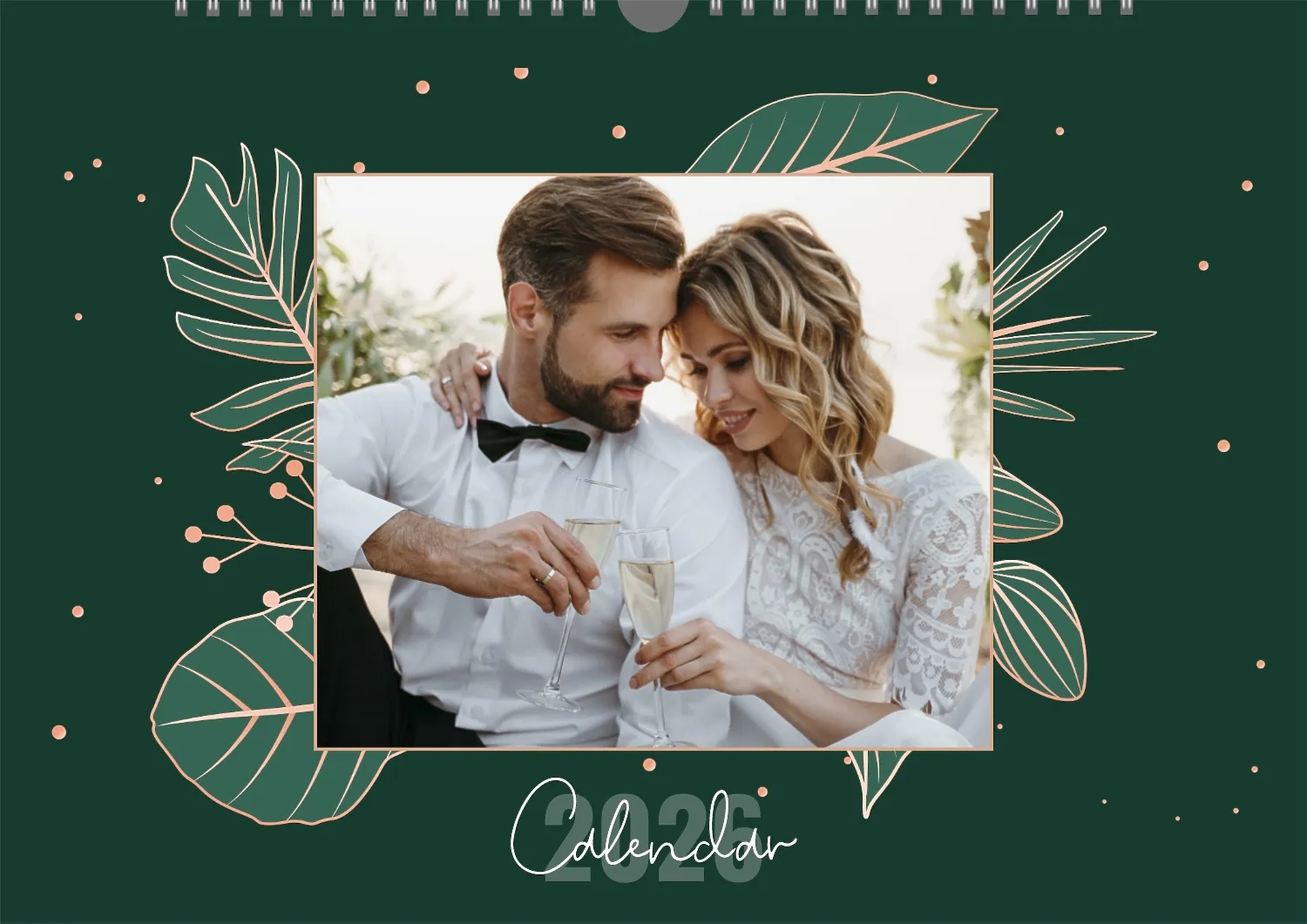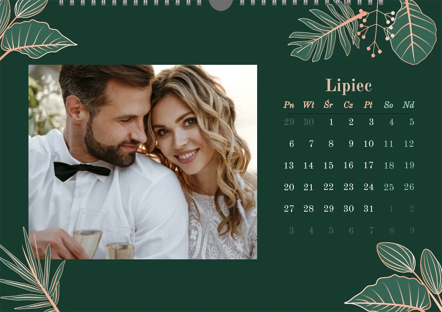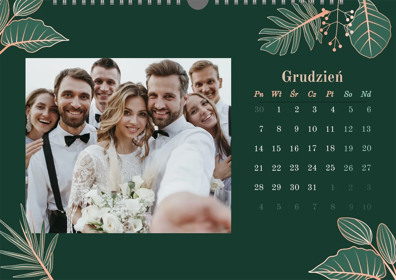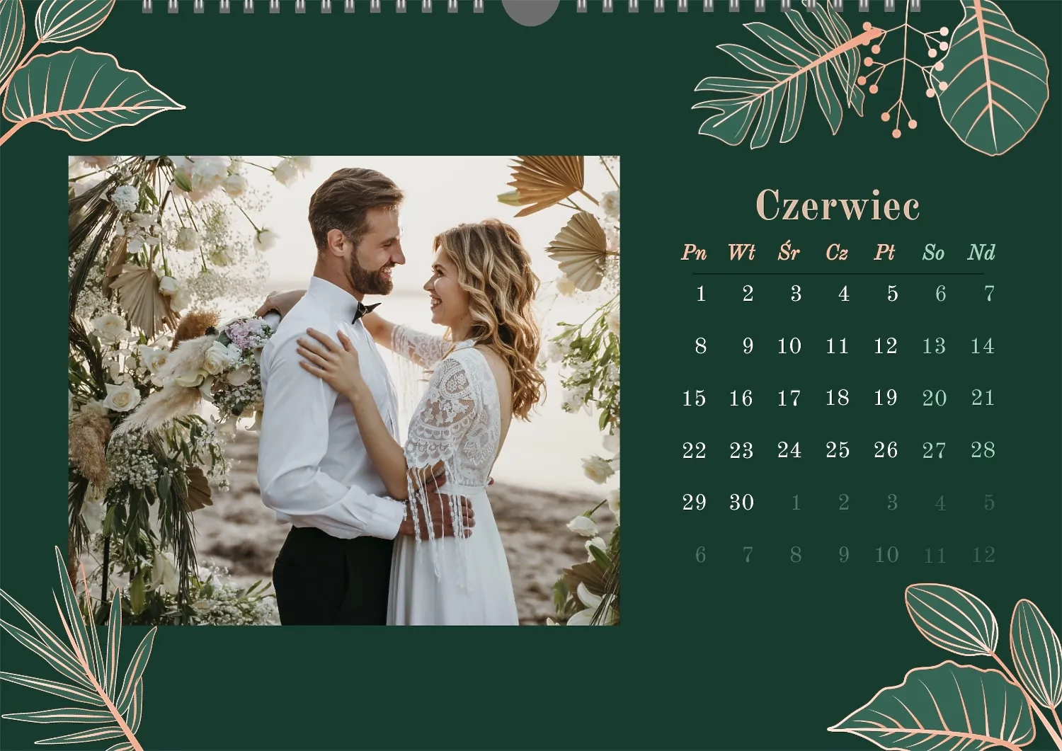 Gotowy szablon kalendarza ściennego ze zdjęciami ślubnymi to uniwersalna podstawa stworzona specjalnie dla tych, którzy chcą zachować atmosferę uroczystości w pięknym i funkcjonalnym formacie. Jest szczególnie odpowiedni dla fotografów, agencji ślubnych, dekoratorów, a także specjalistów, którzy tworzą spersonalizowane prezenty lub pamiątki dla nowożeńców. Taki kalendarz jest często używany jako część pakietu ślubnego, jako dodatek do fotoksiążek lub jako wzruszający prezent dla rodziców i przyjaciół. W kreatorze online ten szablon jest w pełni edytowalny, co pozwala dostosować go do dowolnej historii lub stylu ślubu. Możesz zastąpić tło, zmienić położenie zdjęć, dostosować gamę kolorów, dodać napisy, ważne daty i indywidualne życzenia. Wszystkie elementy można łatwo przesuwać, skalować i dostosowywać do kompozycji — dzięki temu proces tworzenia jest tak wygodny, jak to tylko możliwe, nawet dla tych, którzy nie mają doświadczenia w projektowaniu. W razie potrzeby można dodać elementy dekoracyjne, markowe czcionki, a nawet stylizować układ na określony motyw ślubny, czy to klasyczny, boho, minimalizm czy Vintage.