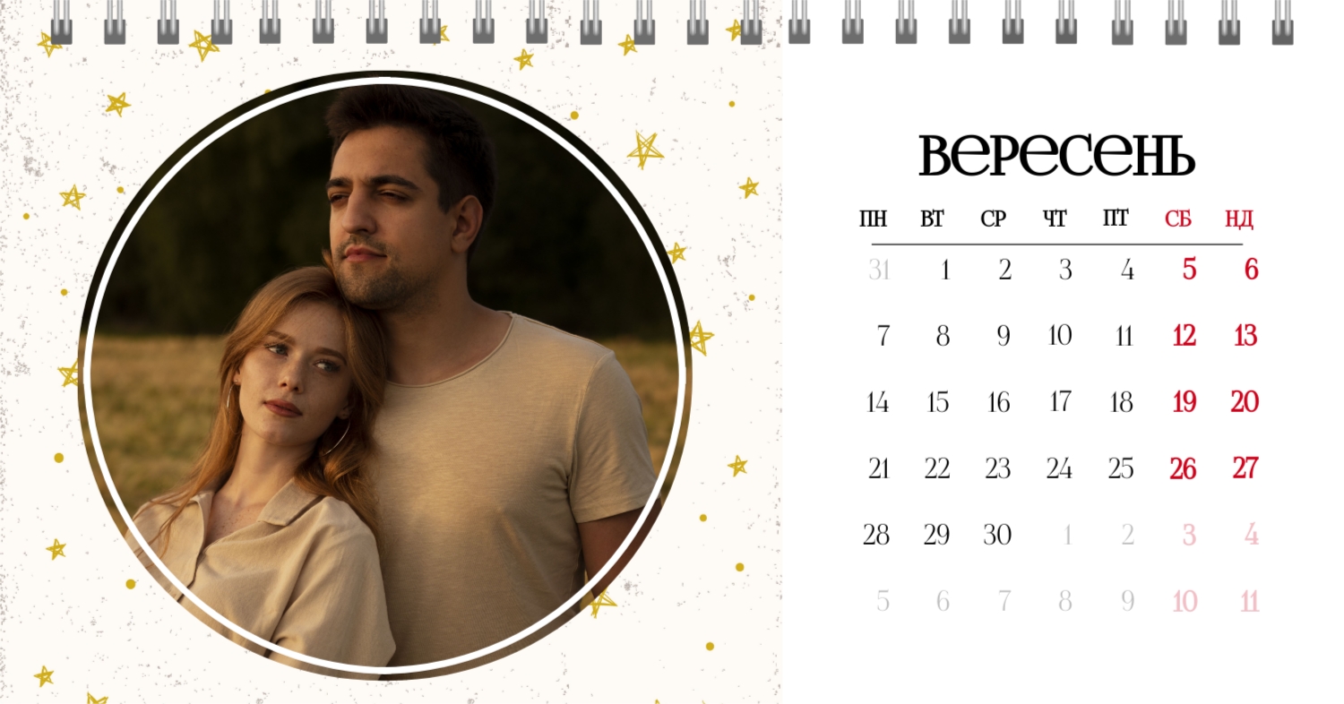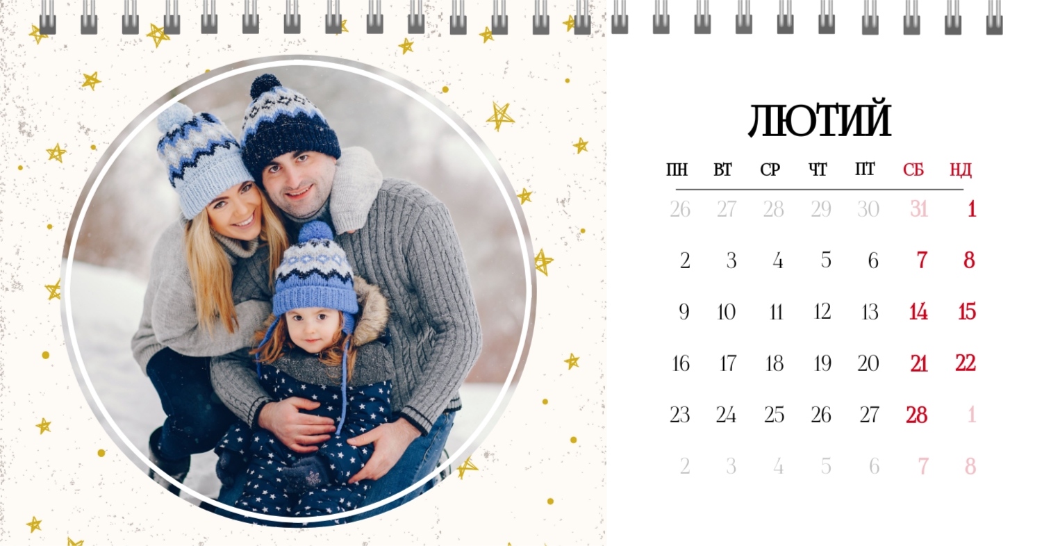 | Матеріали: | основа (каркас календаря) папір – крейдований матовий щільністю 350 г/м²; перекидні аркуші (календарний блок) – крейдований матовий папір щільністю 150 г/м², скріплюється календар на білу металеву пружину зверху |