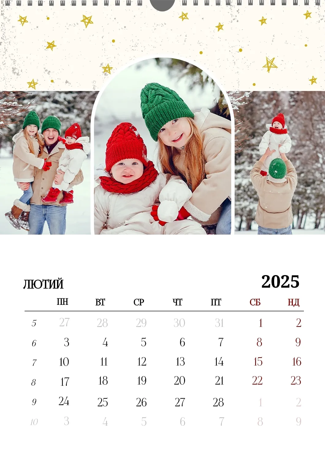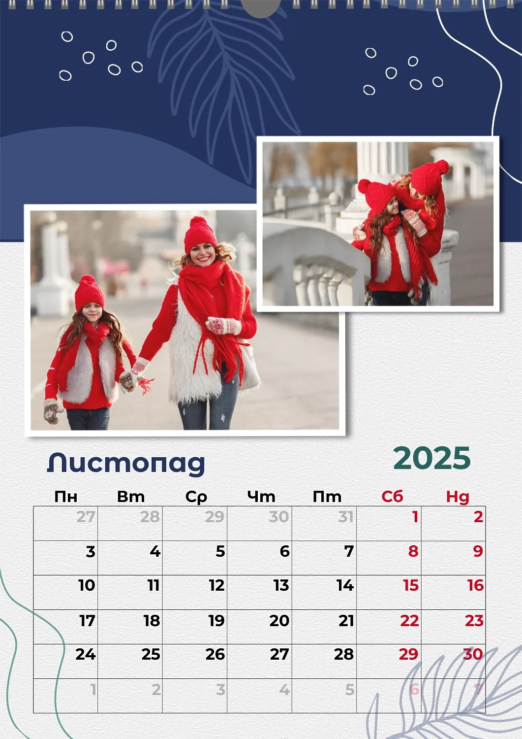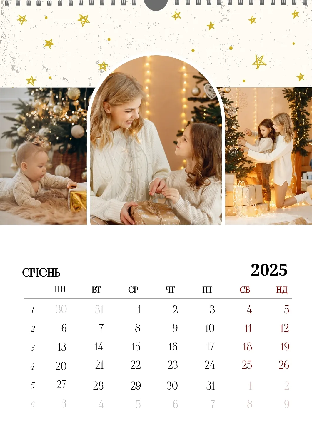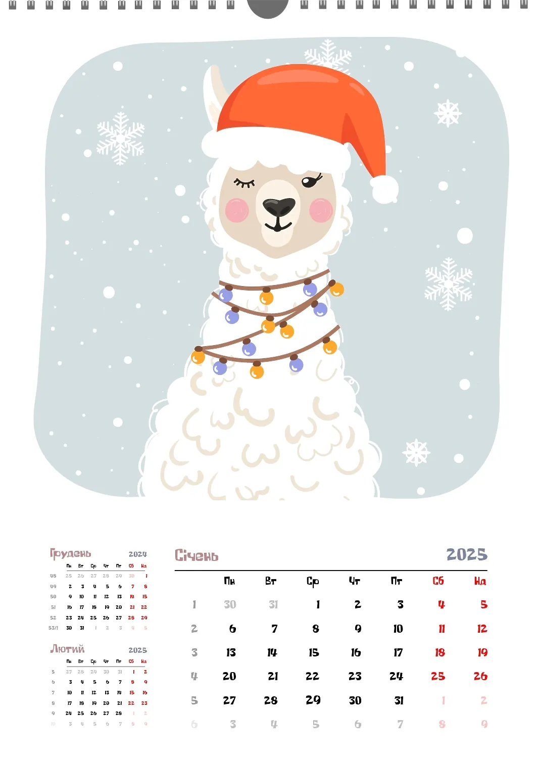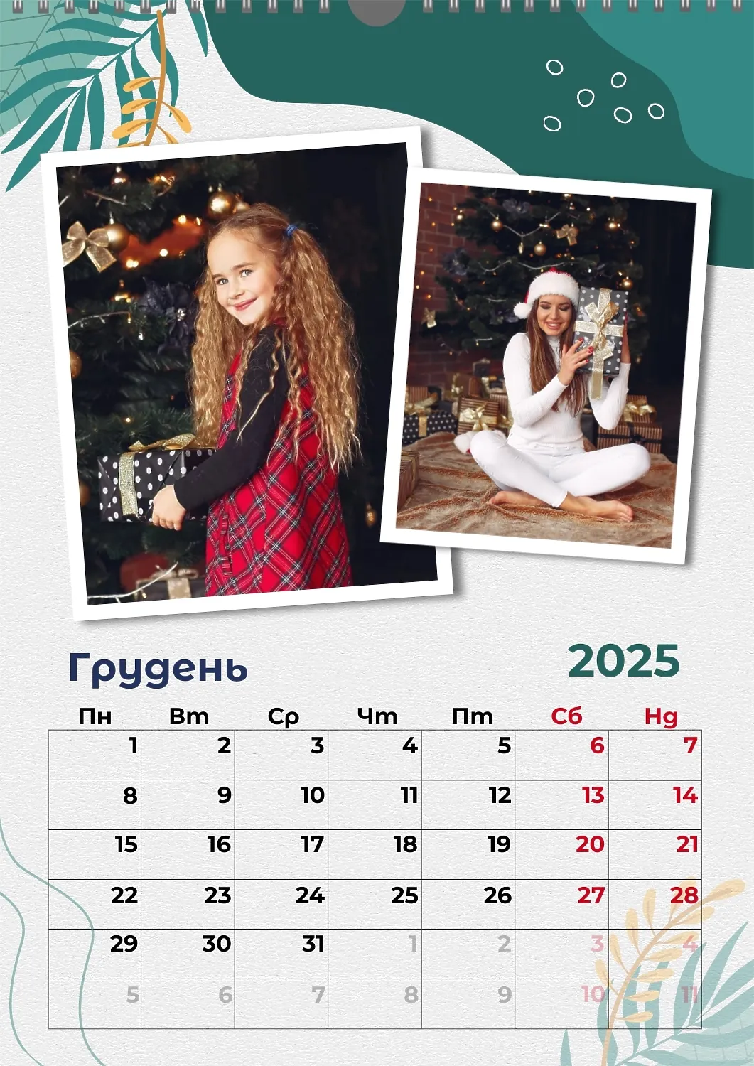 Безкоштовний шаблон новорічного календаря для привітання друзів та рідних. Створіть макет своїми руками в конструкторі календарів.