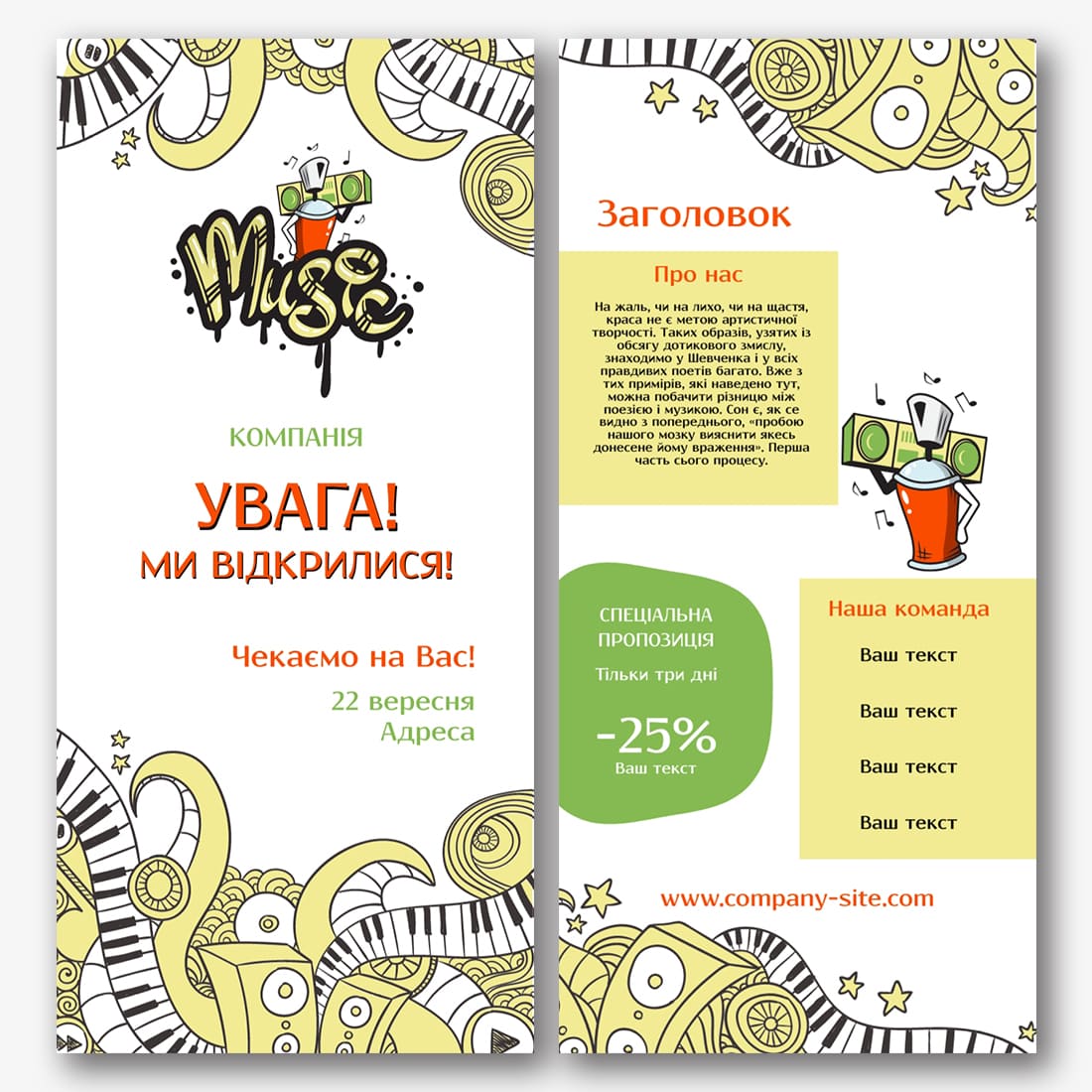 Безкоштовний шаблон флаєра для художньої школи, художників, курсів малювання і живопису. Створіть макет своїми руками в конструкторі флаєрів.