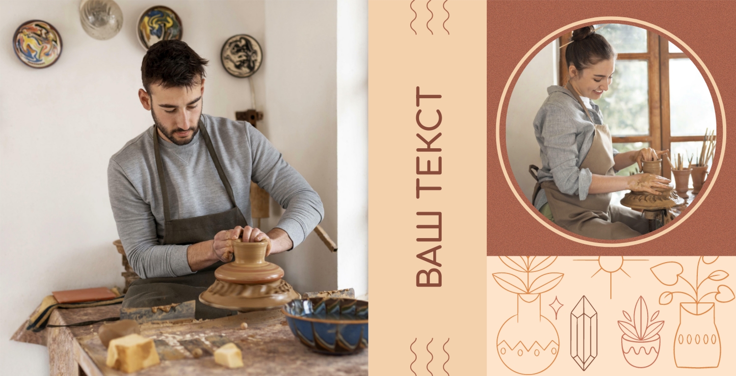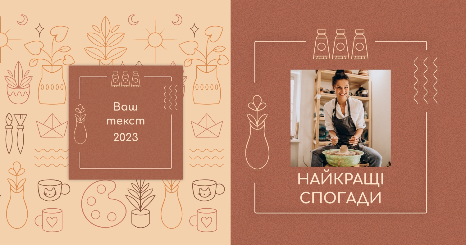 Шаблон фотокниги "кращі спогади з гончарства" являє собою ідеальну основу для збереження і вироби ваших незабутніх моментів, пов'язаних з майстерністю в гончарній справі. Цей альбом є винятковою формою, що дозволяє уособити вашу любов до глини і створення унікальних керамічних творів. На обкладинці фотокниги ми пропонуємо помістити зображення вашого найулюбленішого гончарного шедевра. Це може бути чашка, ваза або будь-який інший предмет, який ви створили своїми руками. Навколо цього зображення можна додати декоративні елементи в стилі гончарства, такі як глиняні візерунки або фрагменти непокритою глазур'ю. Для додання особистого штриха в фотокнизі ви можете включити знімки ваших рук в процесі роботи, підкреслюючи, яким творчим процесом є гончарство. Ці фотографії можуть ілюструвати етапи створення, починаючи з шматка глини і закінчуючи закінченим виробом. Не забудьте включити в фотокнигу фотографії з моментами, коли ви працювали разом з друзями або родиною. Це додасть теплоти та емоційної цінності вашій книзі, відображаючи вашу пристрасть до гончарства та тісні стосунки з близькими. Використовуючи цей шаблон в нашому онлайн-конструкторі, ви зможете створити унікальну квадратну фотокнигу в твердій обкладинці, яка стане не тільки дорогоцінним артефактом у вашій колекції, але і чудовим подарунком для друзів і близьких, ділячись з ними вашими кращими моментами зі світу гончарства.