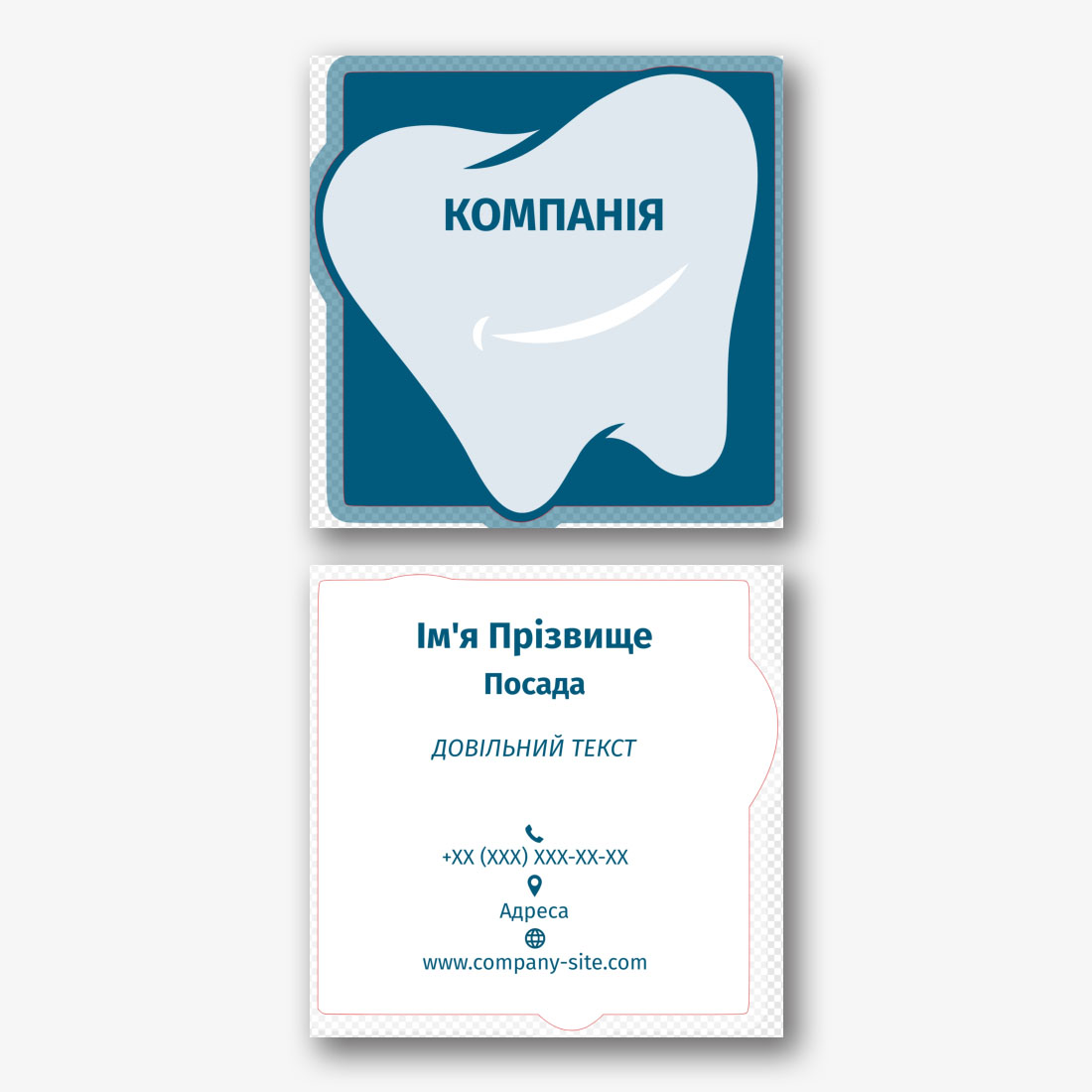 Шаблон фігурної візитки для дантиста або стоматологічної клініки це відмінне рішення для тих, хто хоче виділитися і привернути увагу клієнтів. Він підходить як для приватних практик, так і для стоматологічних клінік будь-якого масштабу. Онлайн-конструктор надає широкі можливості для редагування цього шаблону. Ви можете налаштувати його під свої потреби, включаючи зміну колірної гами, додавання логотипу Вашої клініки, контактної інформації, робочих годин, а також унікальних елементів дизайну, що відображають ваш стиль і спеціалізацію. Створення візитки своїми руками в онлайн-конструкторі дозволяє вам контролювати кожну деталь процесу і гарантувати, що вона буде відповідати вашому візуальному стилю і брендингу. Крім того, ви можете легко вносити зміни в подальшому, зберігаючи актуальність і інформативність вашої візитки. Такий шаблон допоможе вашій клініці виділитися на ринку і залишити незабутнє враження у потенційних клієнтів.