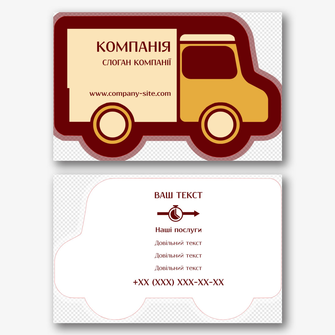 Фігурна візитка фірми доставки являє собою ідеальне рішення для компаній, які прагнуть виділитися серед конкурентів і створити образ, що запам'ятовується. Такий шаблон прекрасно підходить для кур'єрських служб, логістичних компаній і транспортних підприємств, які бажають підкреслити свою унікальність і професіоналізм. Головна перевага цього шаблону полягає в його гнучкості і можливості редагування в нашому онлайн-конструкторі. Онлайн-конструктор дозволяє користувачам легко і швидко налаштувати візитку під свої потреби, не вимагаючи спеціальних навичок в дизайні. Ви можете змінити всі елементи візитки: від форми і розмірів до кольору і шрифтів. За допомогою онлайн-конструктора ви зможете додати логотип своєї компанії, змінити текстові блоки, вказавши контактну інформацію, а також вибрати кольори, відповідні вашому корпоративному стилю. Крім того, конструктор пропонує широкий вибір фігурних елементів, які можна використовувати для створення візитки з унікальним і незабутнім дизайном.