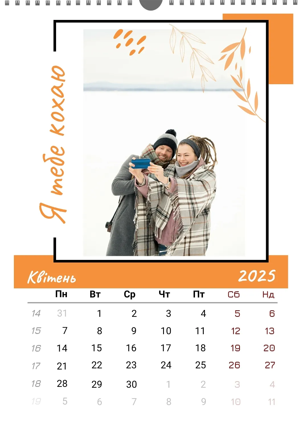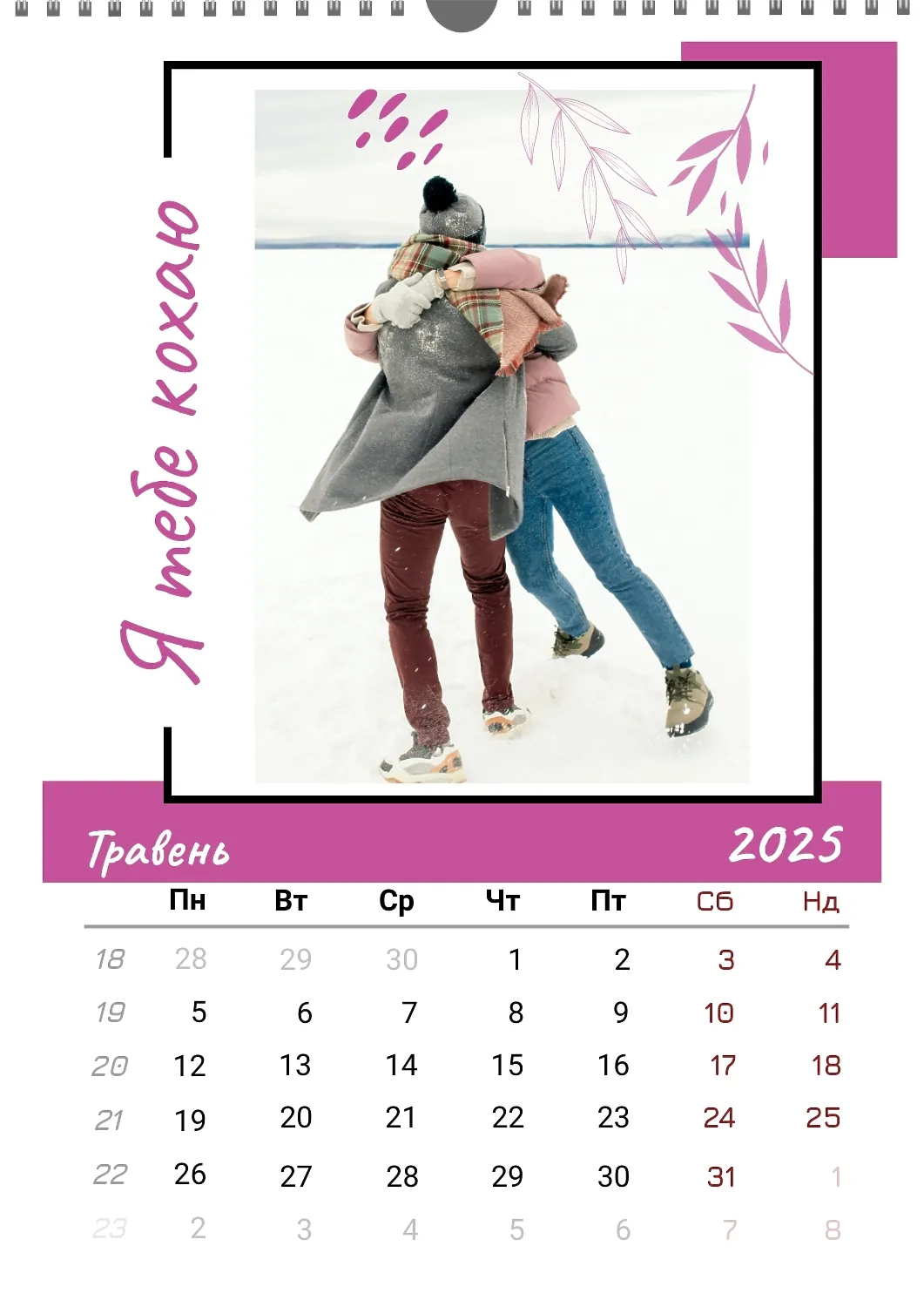 Готовий шаблон настінного сімейного календаря-це зручне і універсальне рішення для тих, хто цінує індивідуальний підхід до планування і бажає зберегти важливі сімейні моменти в стильній і практичній формі. Такий шаблон ідеально підходить для створення персоналізованого календаря своїми руками, який буде радувати вас і ваших близьких протягом усього року. Одне з головних переваг сімейного настінного вертикального календаря — можливість повного редагування в нашому онлайн-конструкторі. Ви можете змінити фон, додати фотографії, підписати кожен місяць індивідуально, відзначаючи дні народження, річниці та інші важливі дати. Інтуїтивно зрозумілий інтерфейс конструктора дозволяє легко замінити зображення, вибрати відповідні шрифти і кольору, а також розташувати елементи так, щоб вони ідеально відповідали вашому стилю і завданням. Цей готовий шаблон стане основою для створення унікального календаря, який буде відображати саме вашу історію і стиль життя. Відкрийте для себе творчість та зручність у створенні персоналізованих сімейних календарів у нашому онлайн-конструкторі!