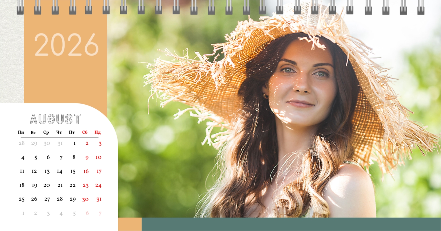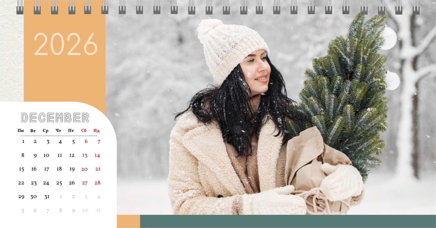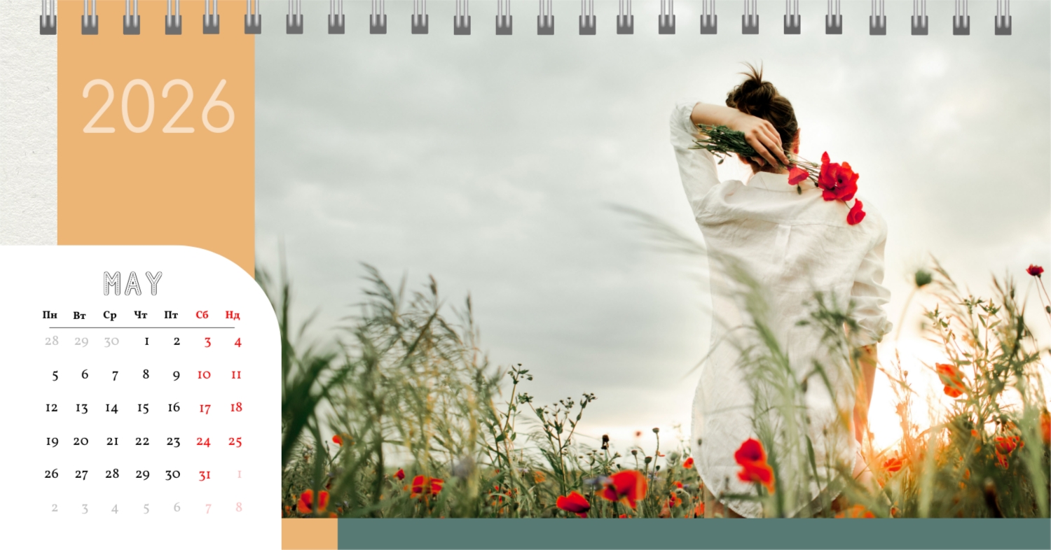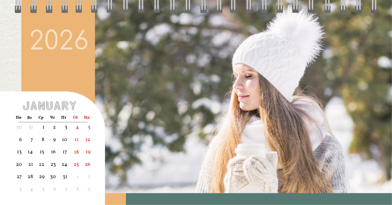 Цей чарівний шаблон настільного горизонтального календаря "кращі спогади" покликаний надихнути вас на створення унікального і ніжного календаря, повного теплих моментів Вашого життя. Онлайн-конструктор, доступний для Вас, надає дивовижні можливості для творчості. Ви зможете легко налаштувати кожну деталь, щоб зробити календар по-справжньому вашим. Використовуйте функцію додавання персональних фотографій, щоб ваші найкращі моменти були в центрі уваги. Широкий вибір кольорів і шрифтів в конструкторі дозволяє вам підкреслити атмосферу кожного місяця. Виберіть відтінки, які викликають у вас ті самі почуття, які ви хочете зберегти в пам'яті. Створення унікального настільного календаря в онлайн-конструкторі-це не тільки процес, але і можливість втілити в життя свої кращі спогади з особливою ніжністю і теплотою. Нехай цей календар стане відображенням вашої унікальної історії.